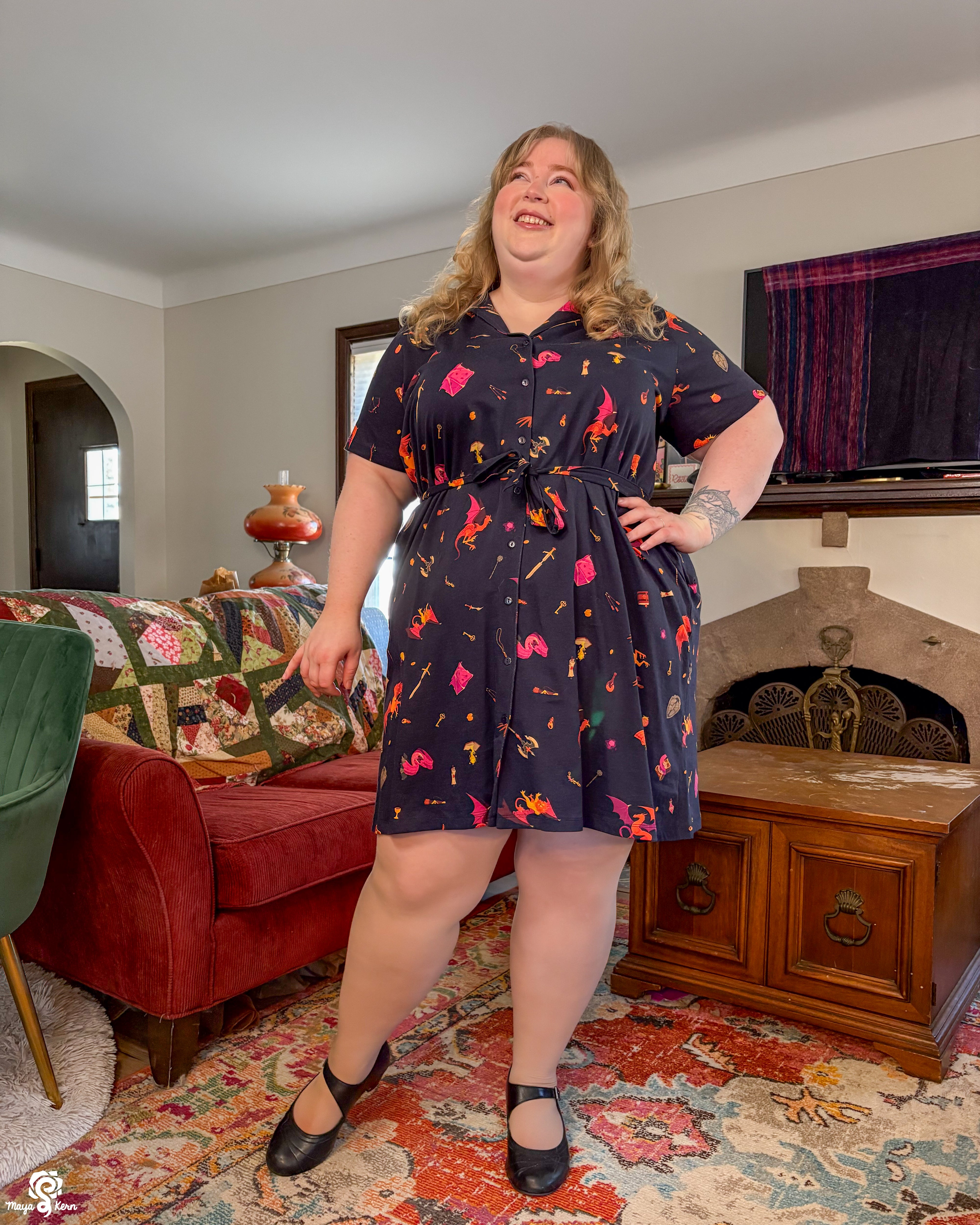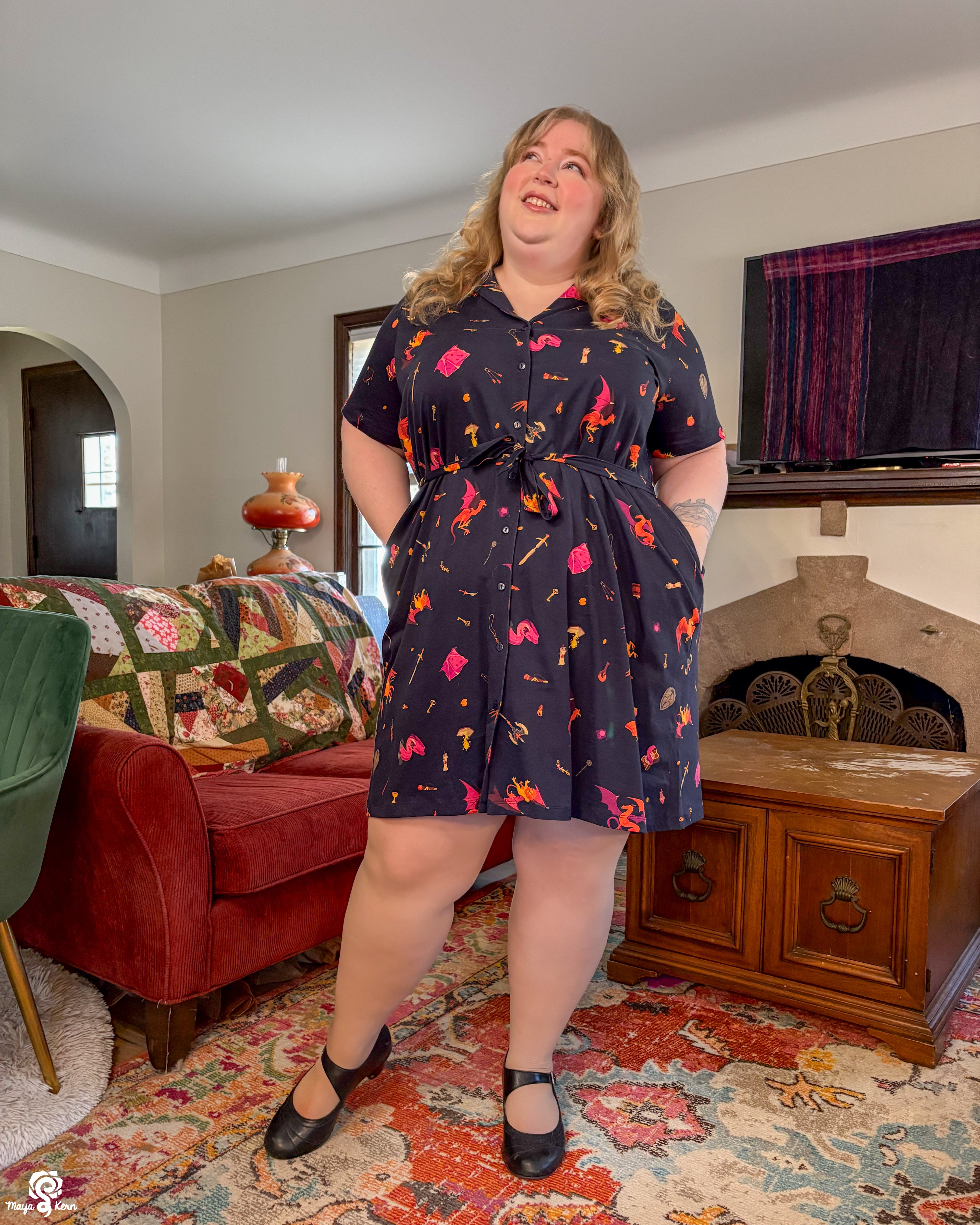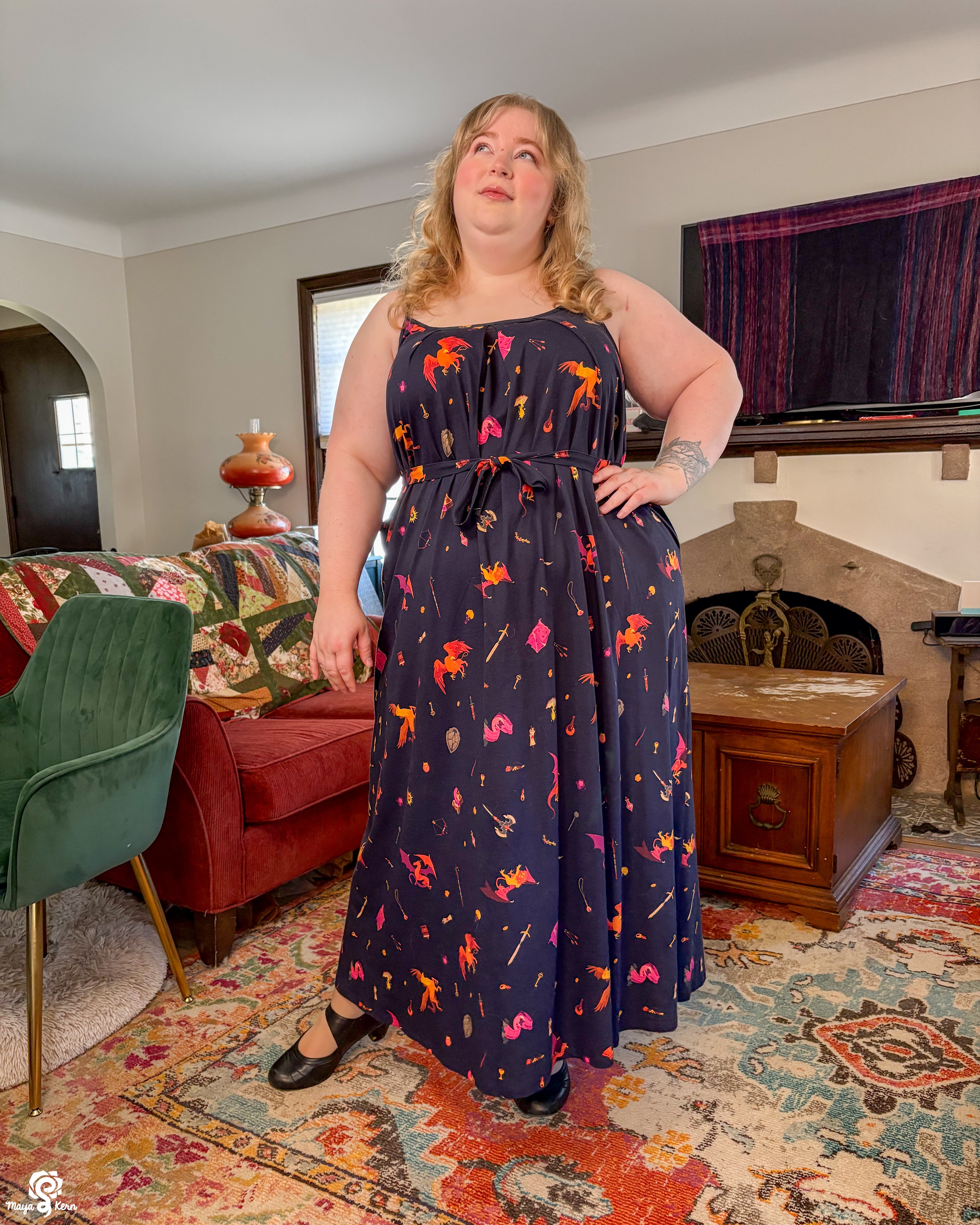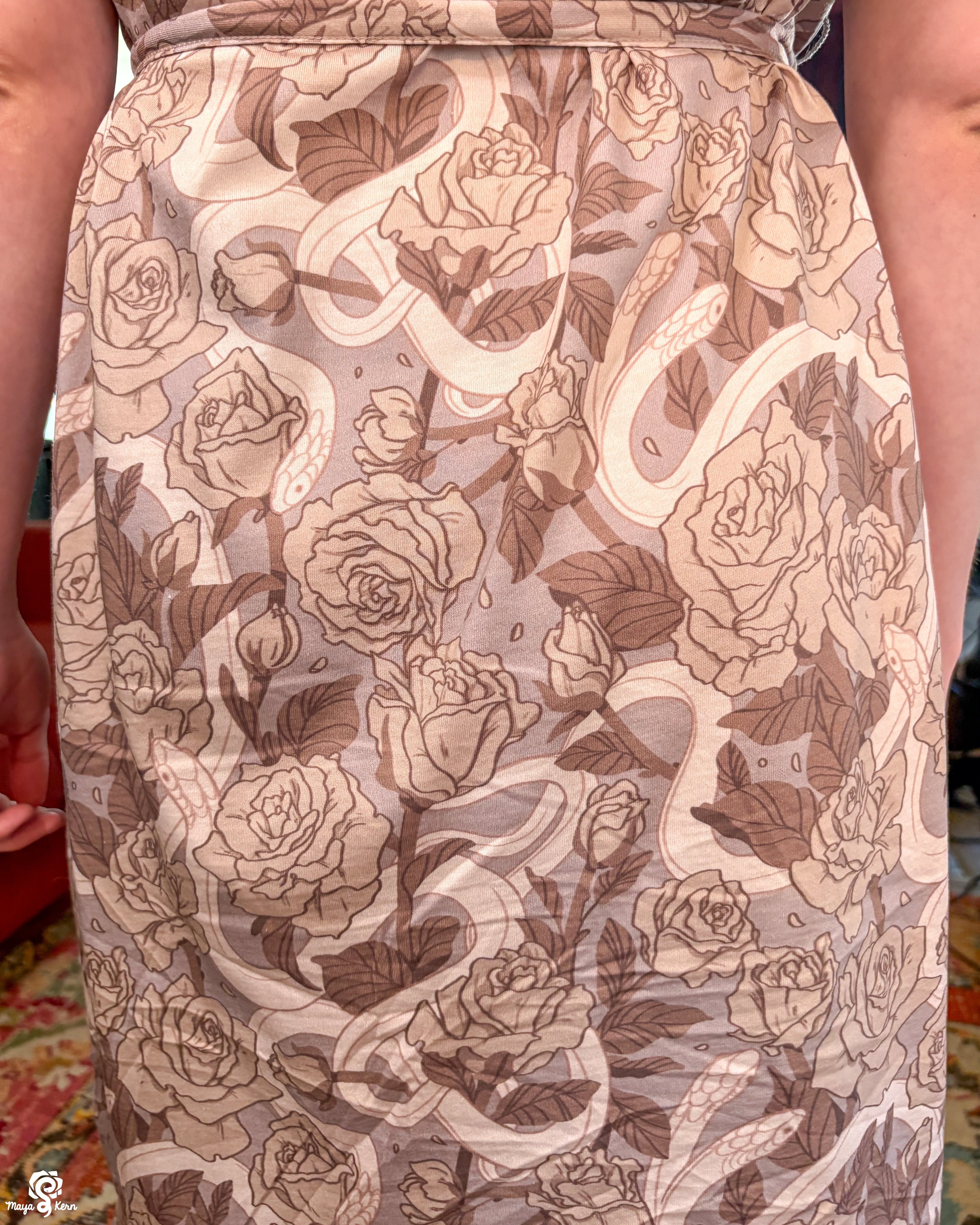 This was one of the first Maya skirts I've owned (I was lucky enough to order 3) and it is stretchy, light weight, comfy, has pockets big enough to fit my yeti, and it twirls really well even without a petticoat. Shattered Earth did an amazing job designing the silly squiggly kitties. They make me smile (: and I hope others smile when they see it too