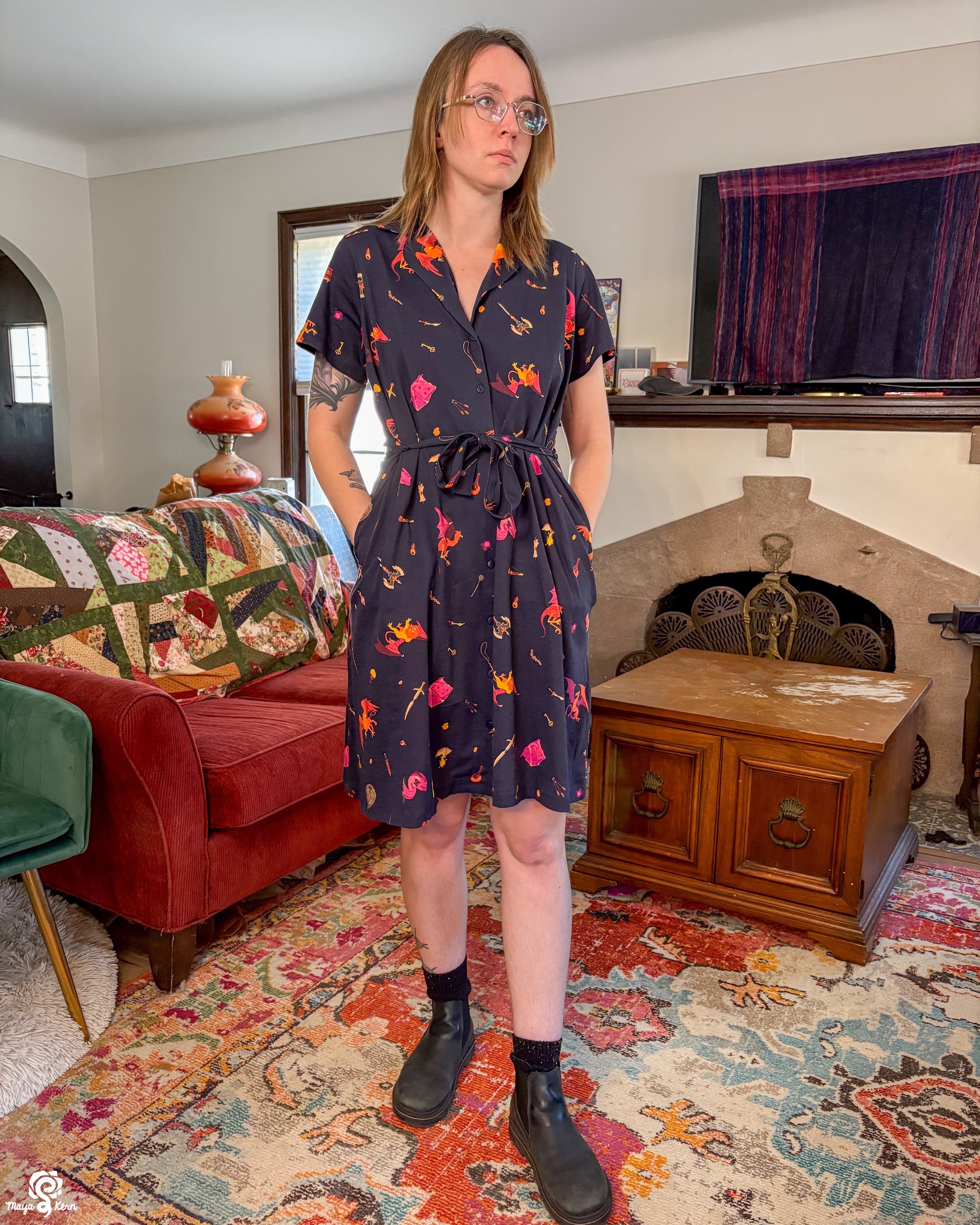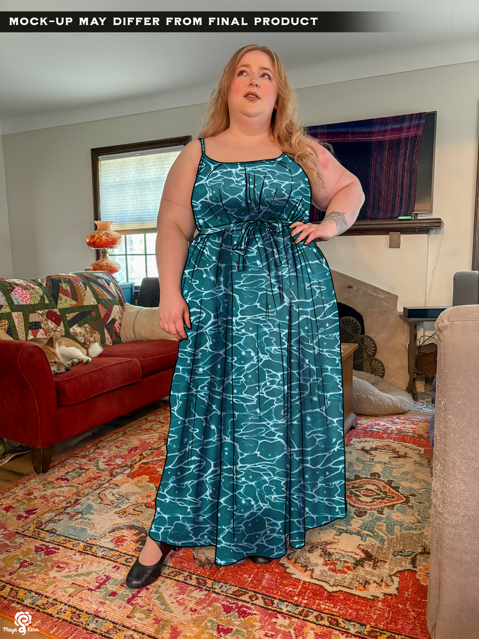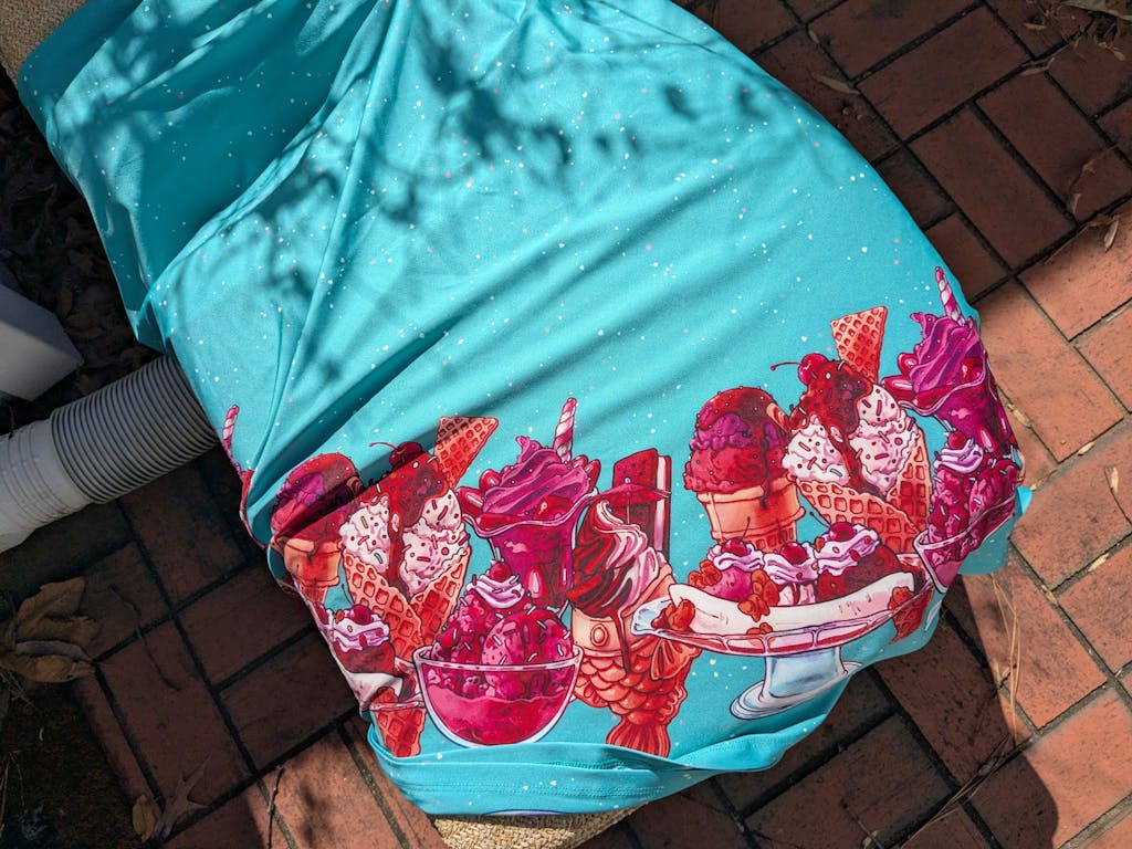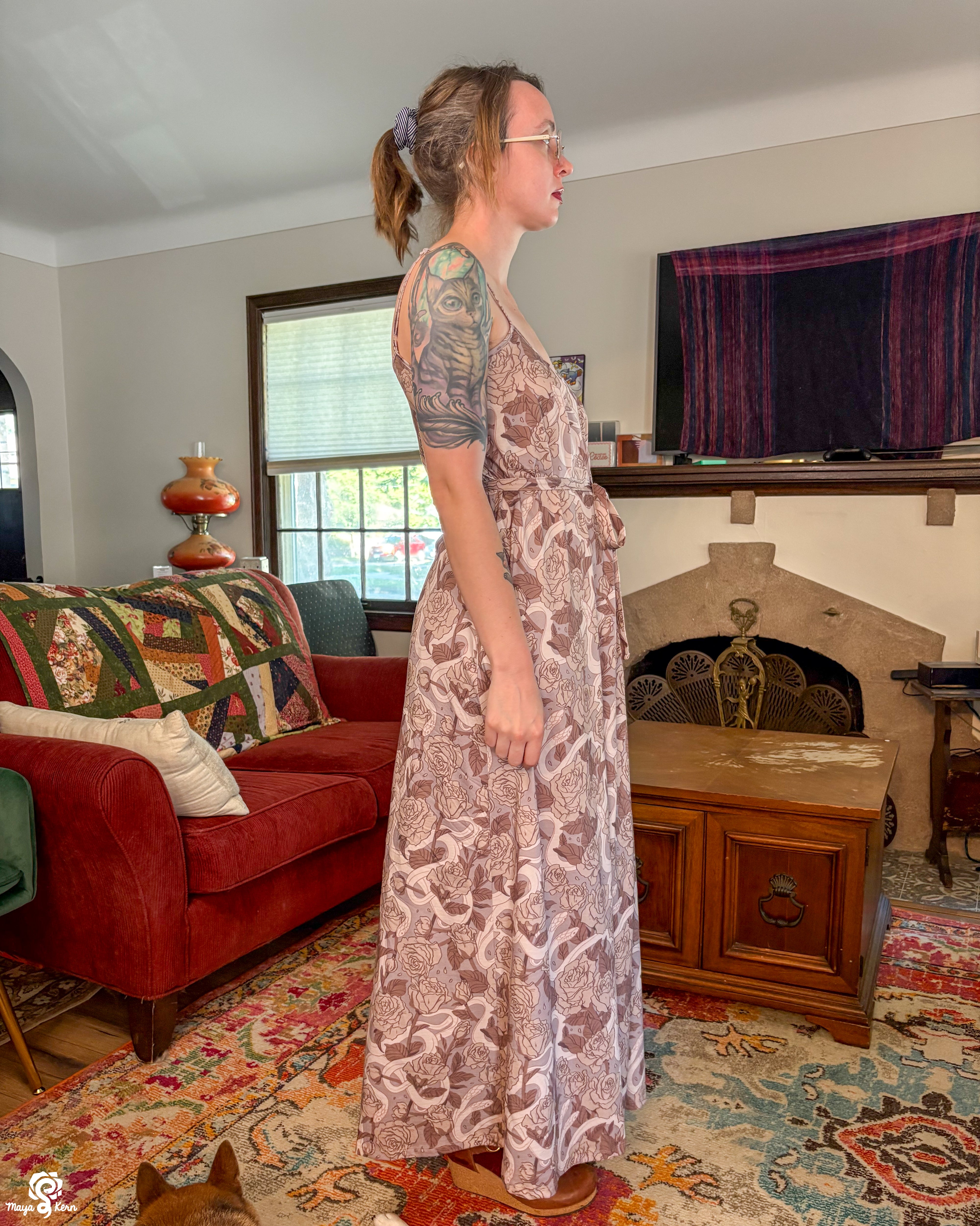 This was one of the first Maya skirts I've owned (I was lucky enough to order 3) and it is stretchy, light weight, comfy, has pockets big enough to fit my yeti, and it twirls really well even without a petticoat. Shattered Earth did an amazing job designing the silly squiggly kitties. They make me smile (: and I hope others smile when they see it too