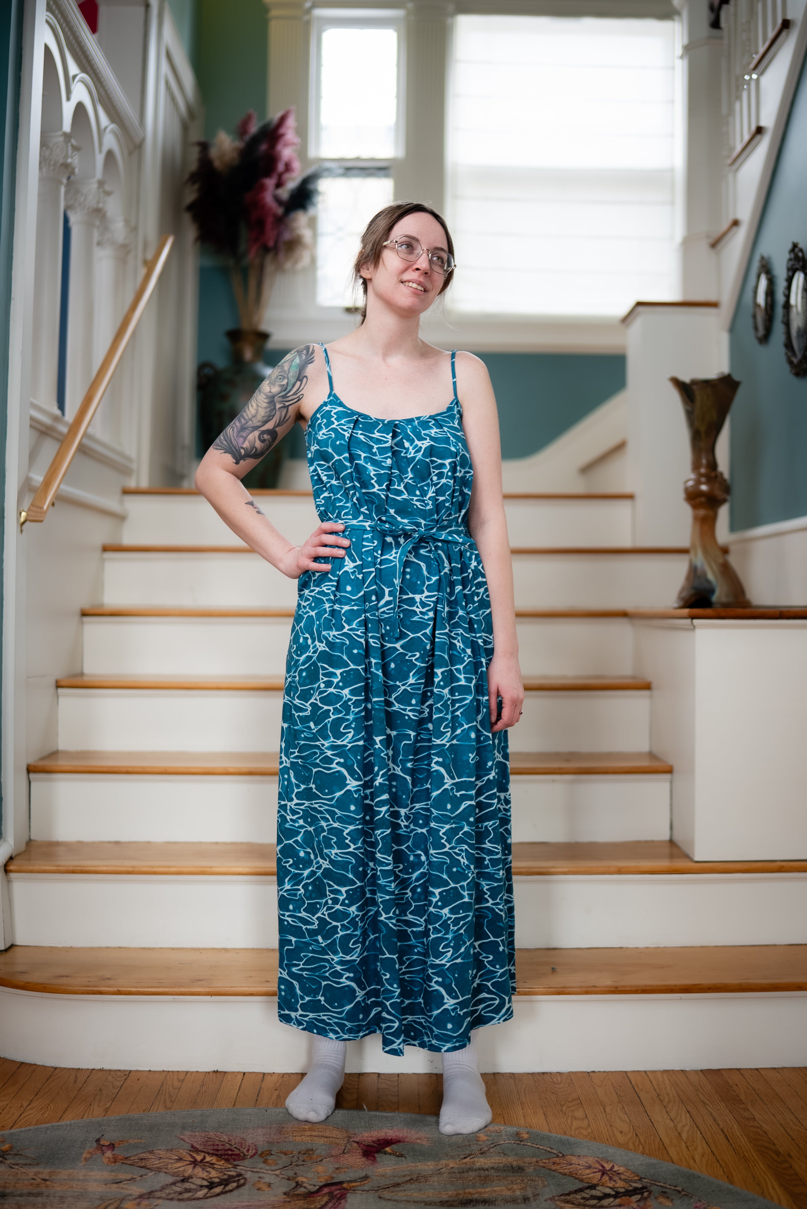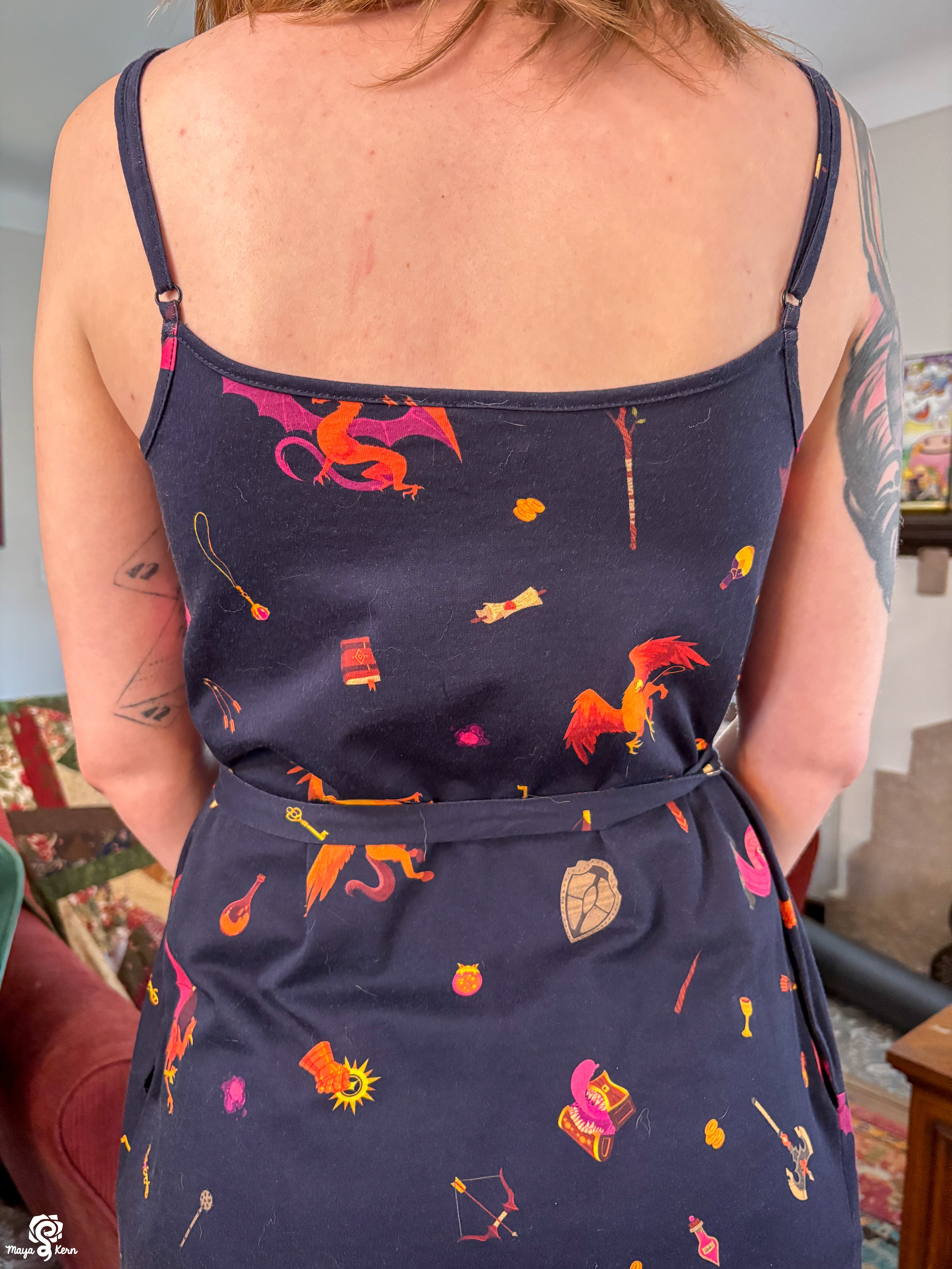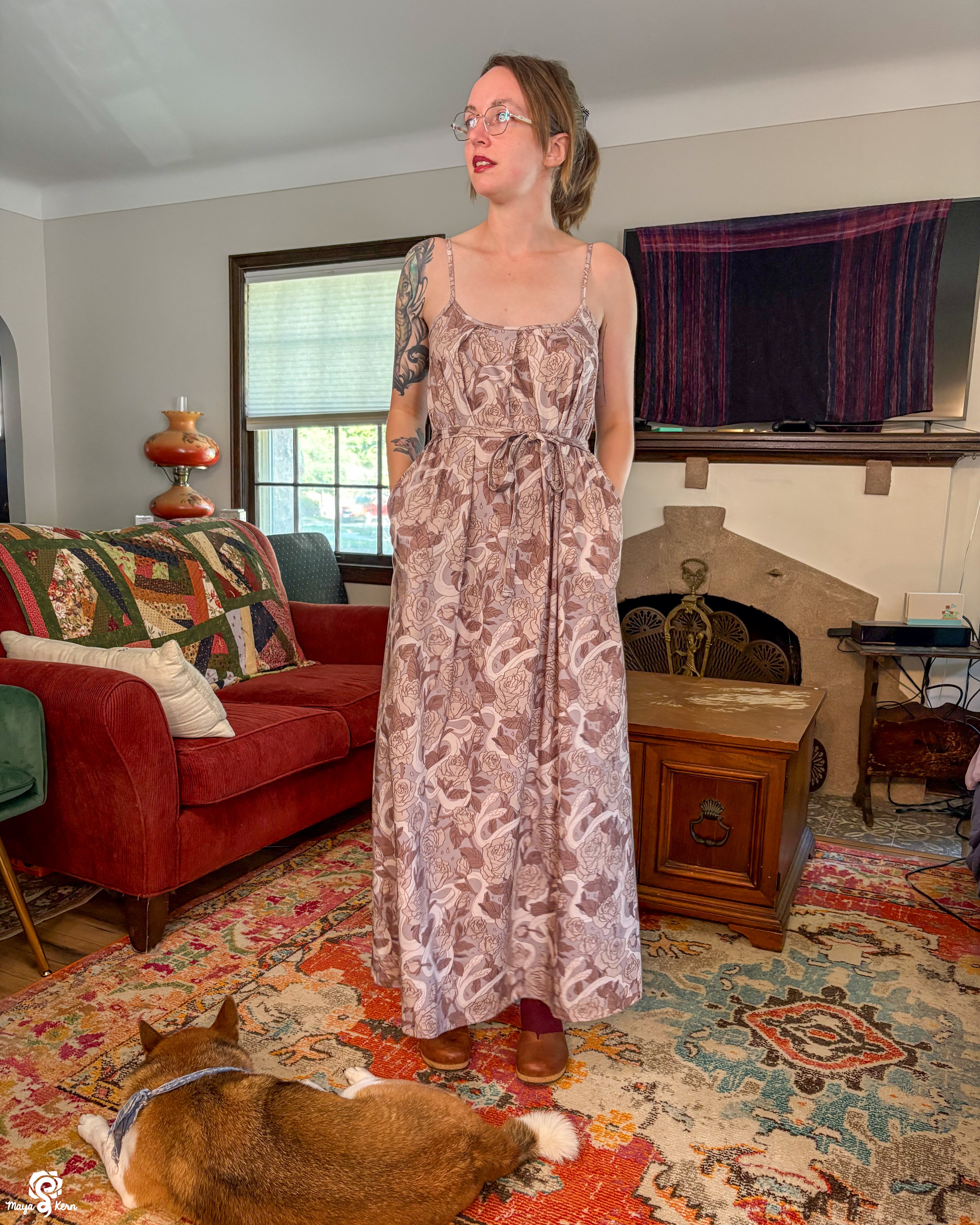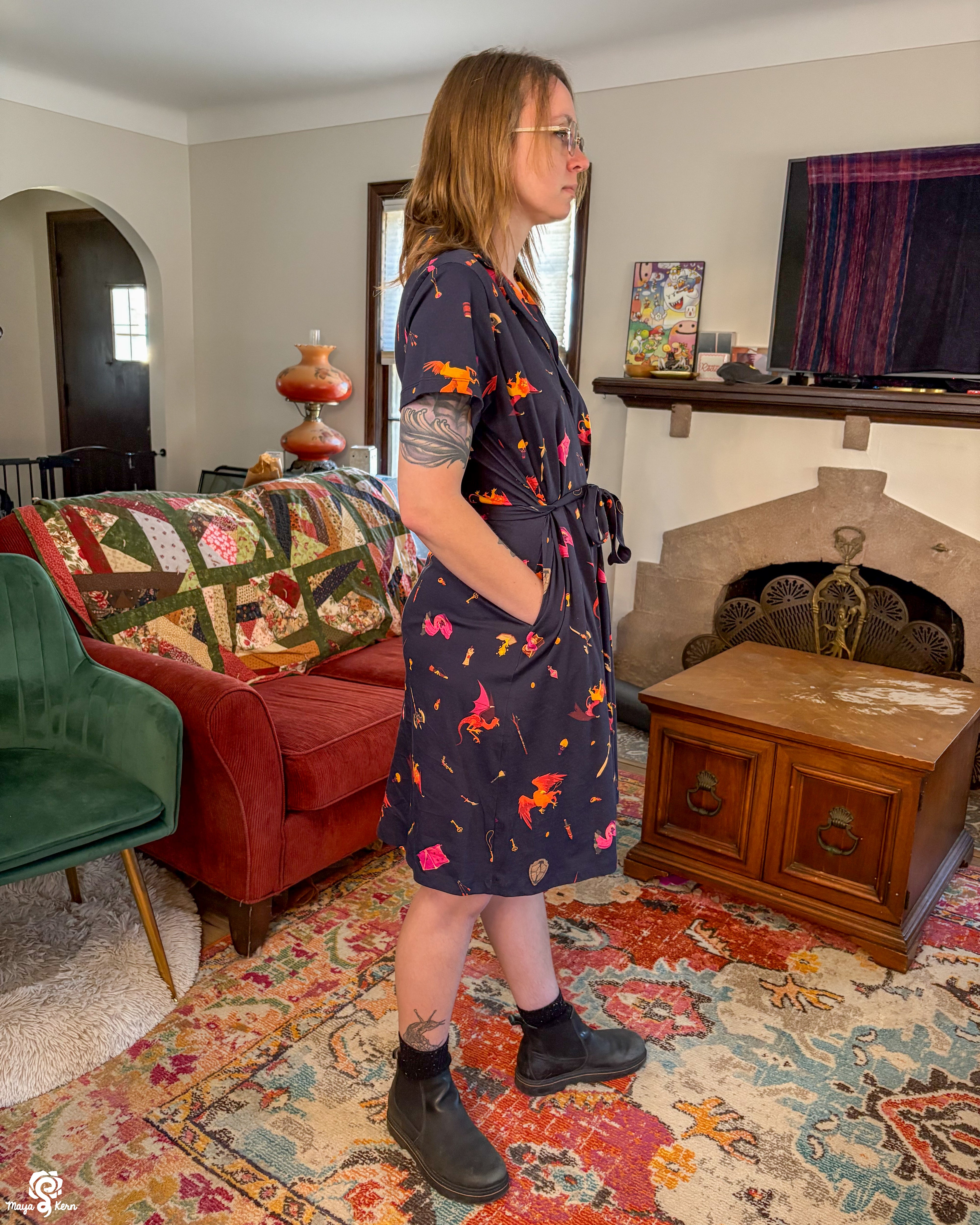 This skirt is SO cute and fun to wear, I love it to pieces. I've gotten so many compliments both times I've worn it. And the deep pockets work especially well in this one even with heavy stuff, likely due to a combination of the thicker fabric and suspenders.