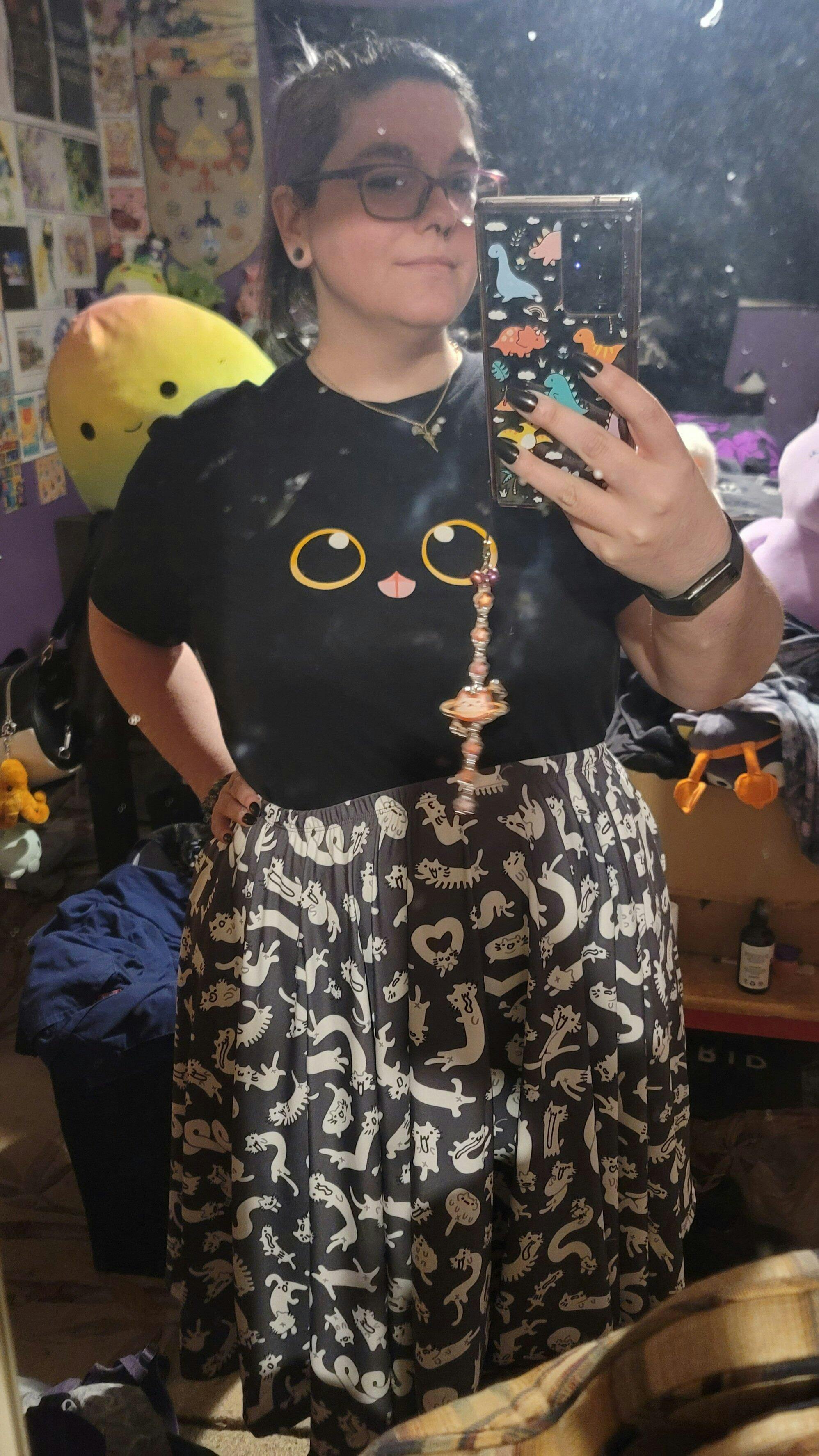 from 3603 reviewsThis was one of the first Maya skirts I've owned (I was lucky enough to order 3) and it is stretchy, light weight, comfy, has pockets big enough to fit my yeti, and it twirls really well even without a petticoat. Shattered Earth did an amazing job designing the silly squiggly kitties. They make me smile (: and I hope others smile when they see it too