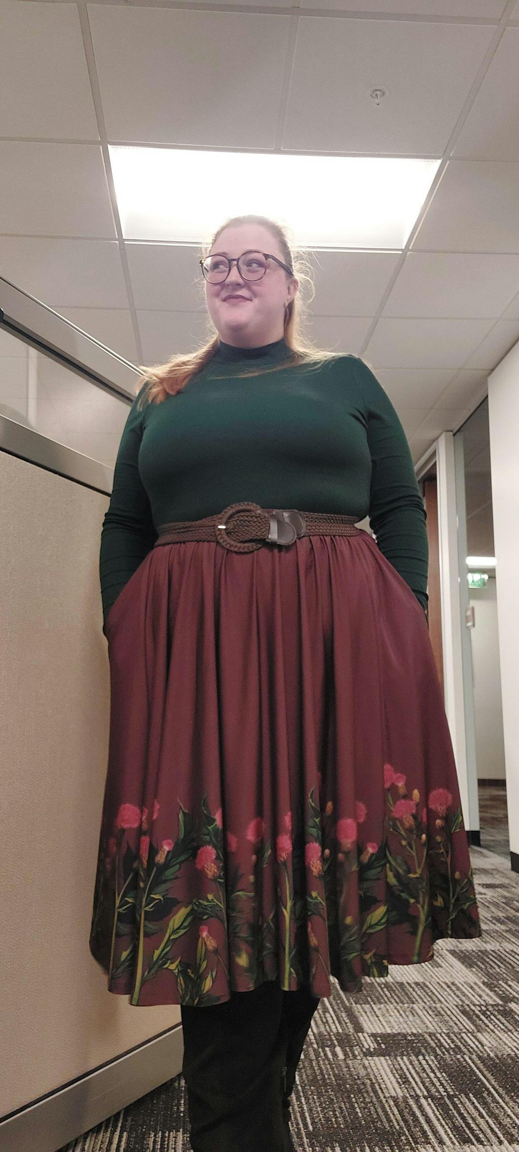 Stretchy circle skirt featuring my Thistles pattern on a molasses brown background. These skirts have pockets large enough to fit your phone, DS, Switch, hands, and maybe a small cat. Petticoat not included.