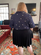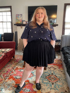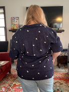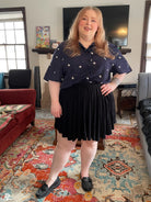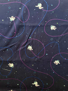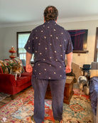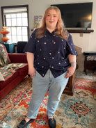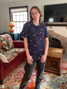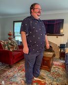 A short sleeved button-up shirt featuring my Astronaut design. It has a deep navy background. This pattern depicts several cute astronauts floating on a space inspired background.