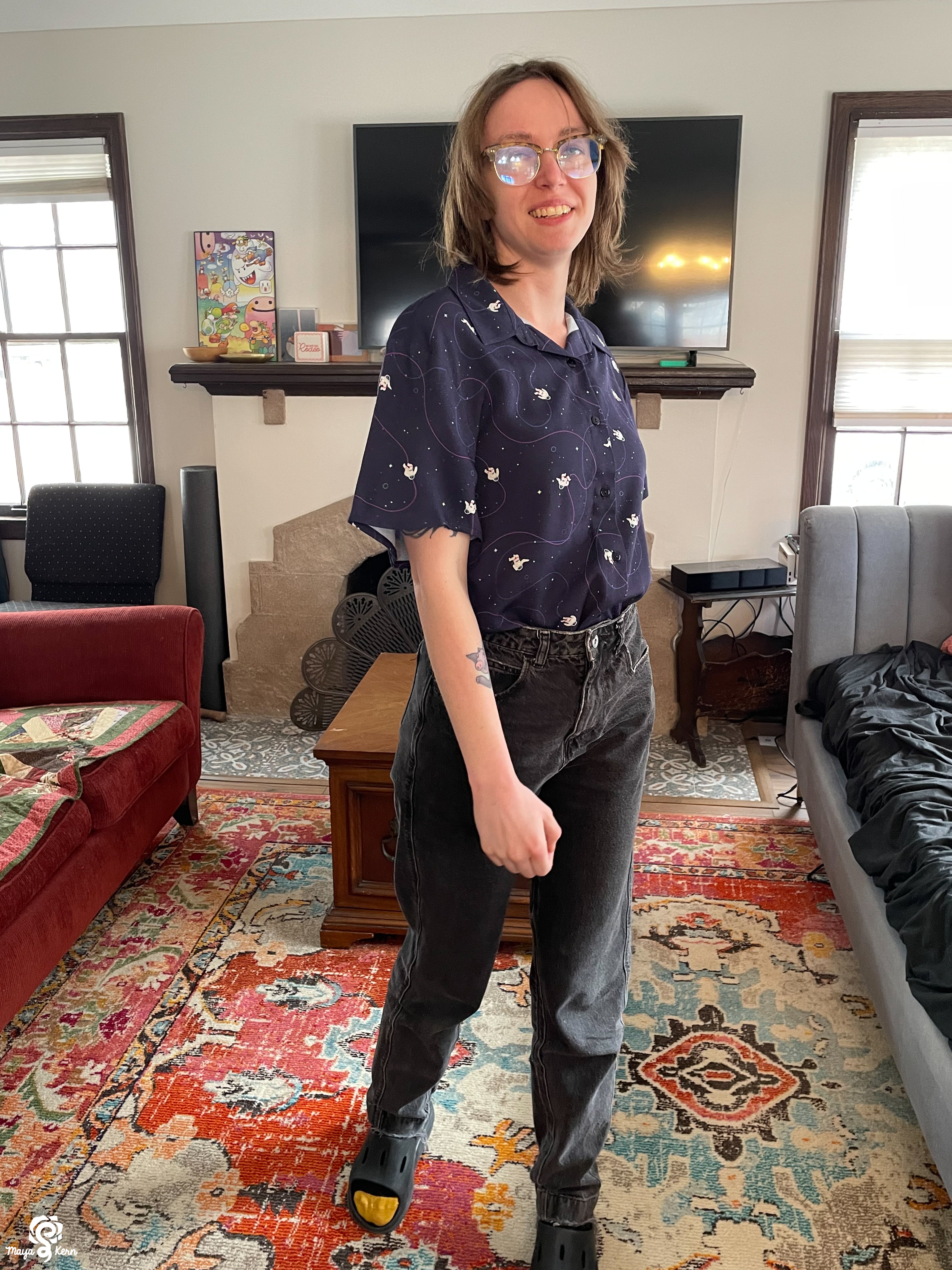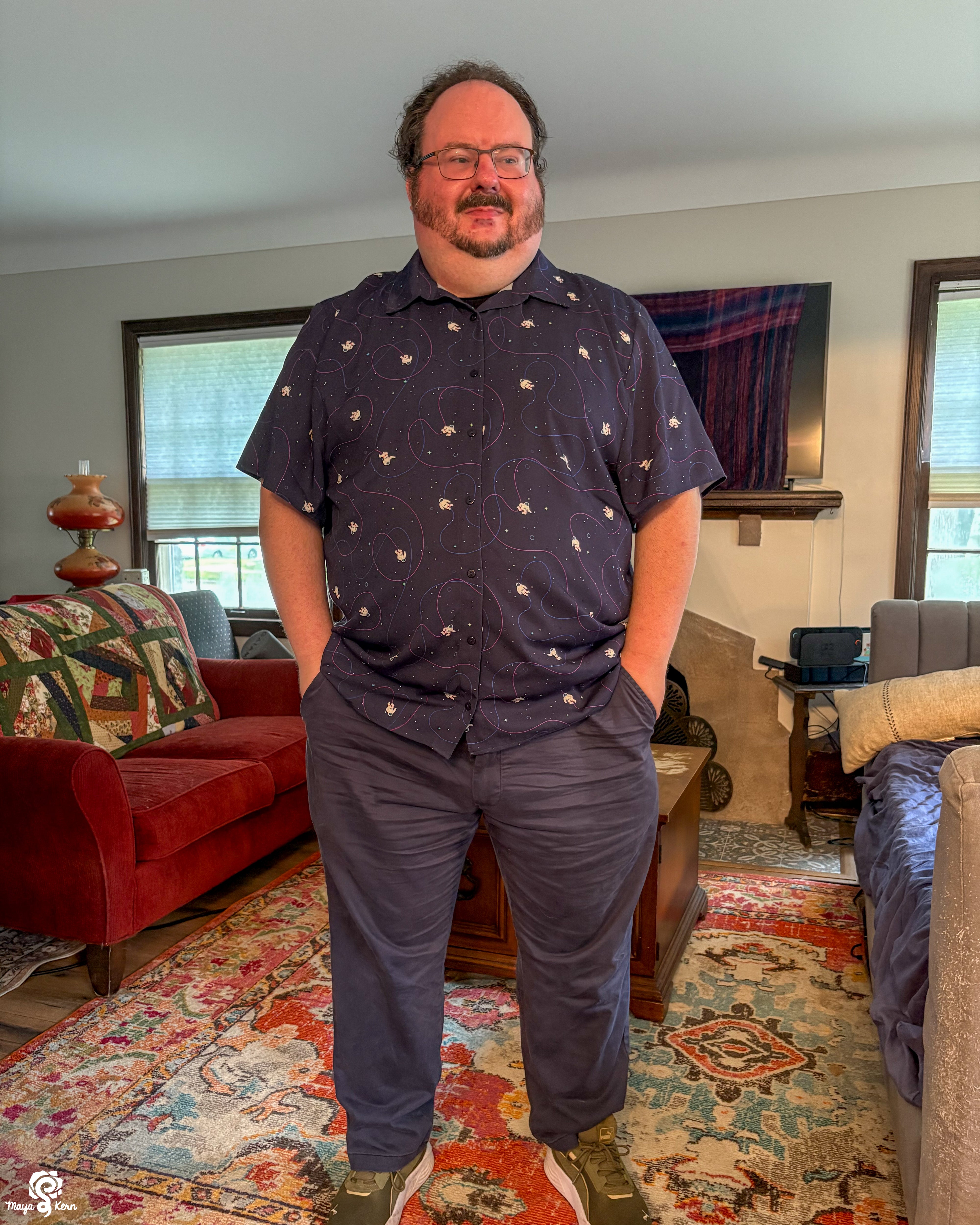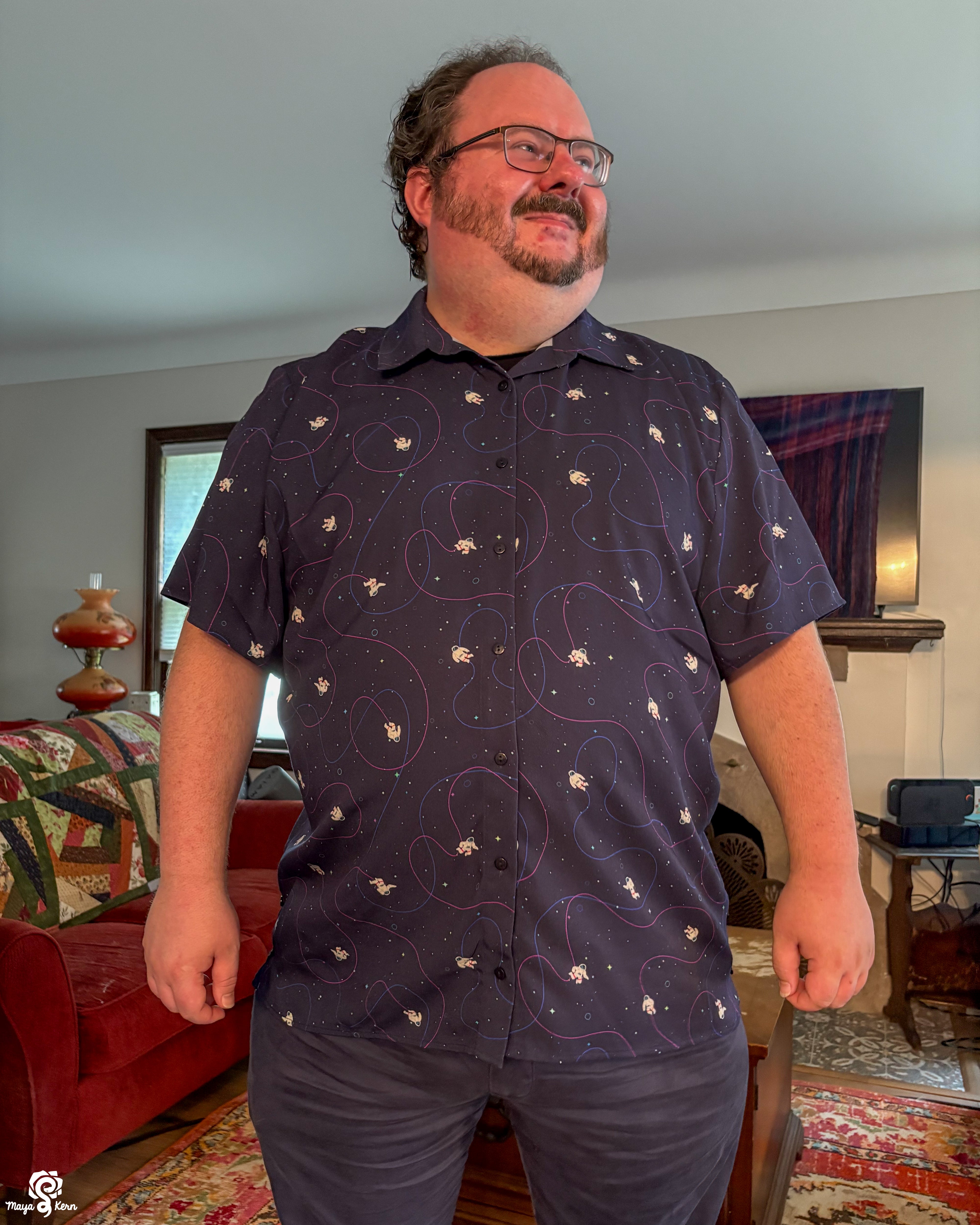 Perfect size and fit! Loved the colors and little details, and the tiny astronauts are constantly bringing me joy when I see them while wearing it. My mom (who writes scifi!) liked it so much when she saw my shirt that she bought one for herself!