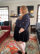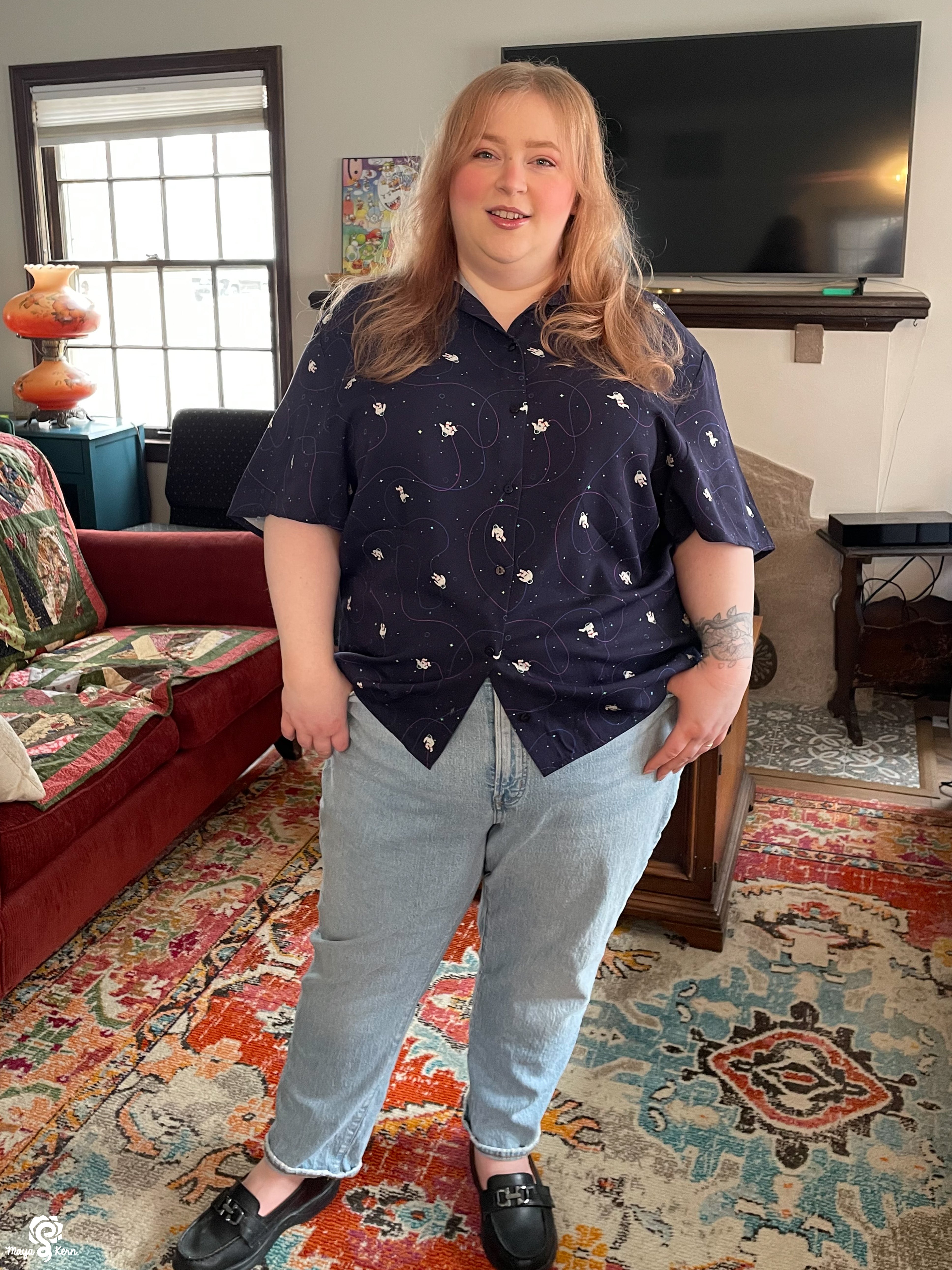 Maya is wearing the shirt in size 3XL