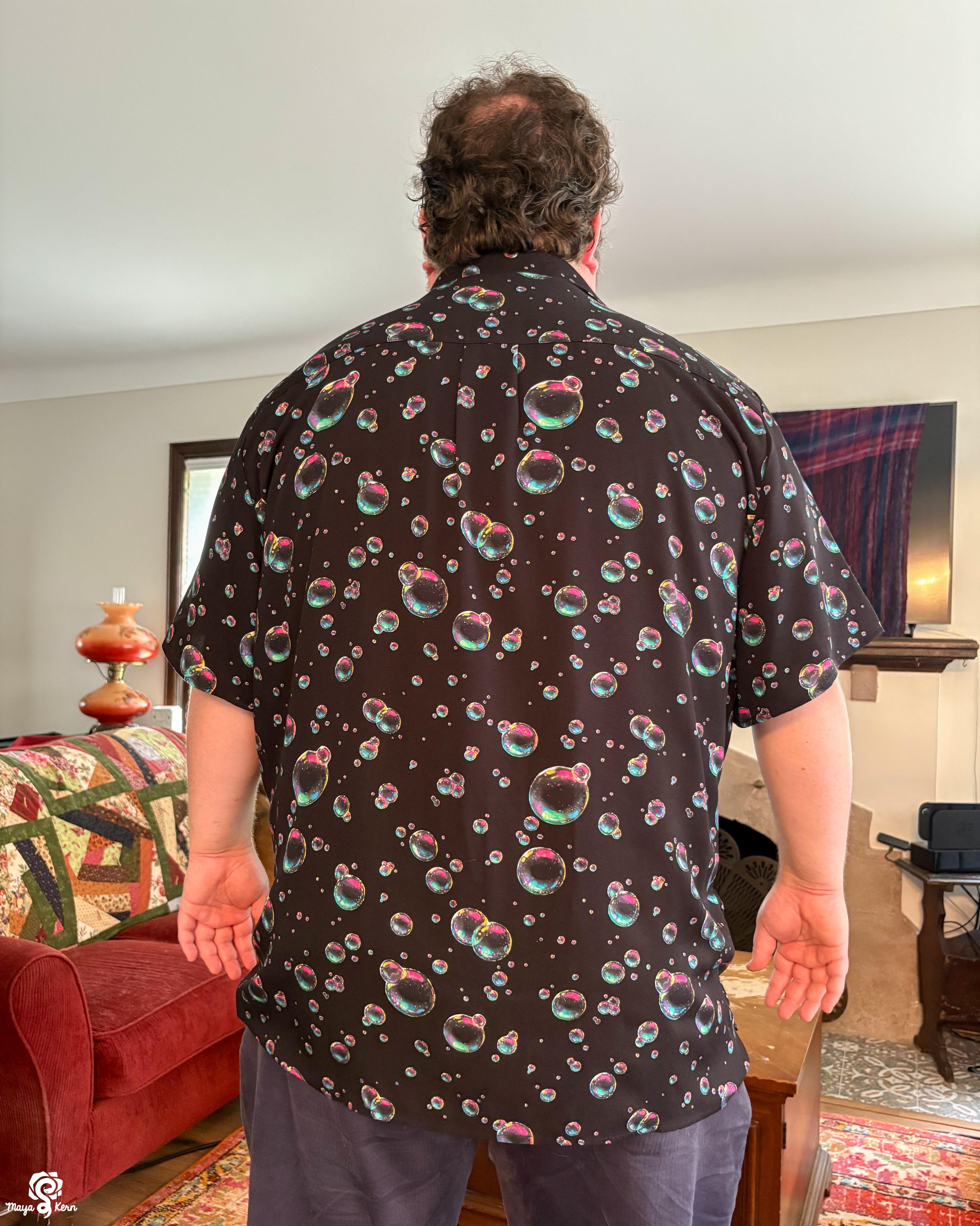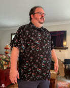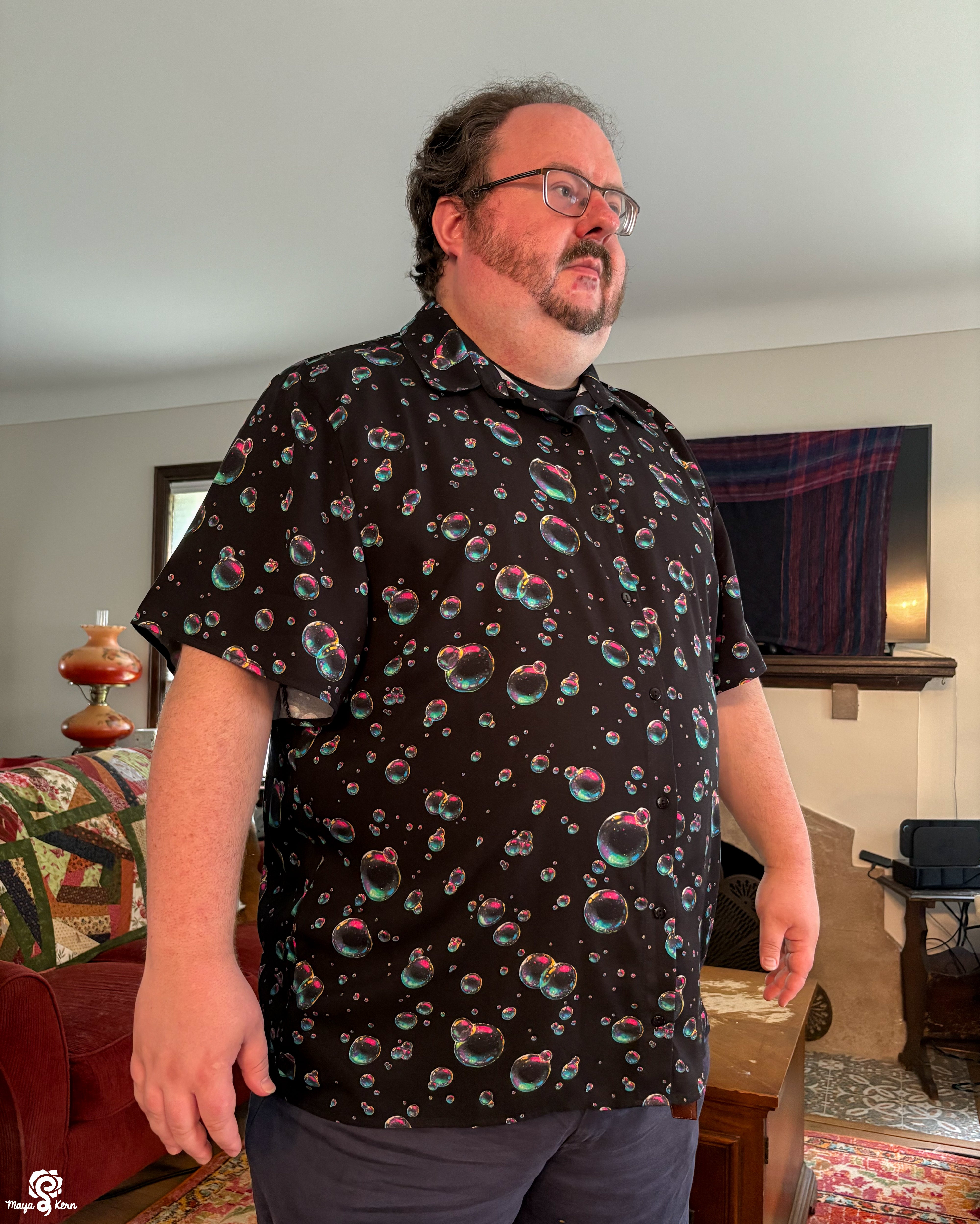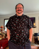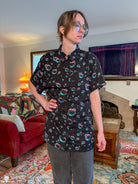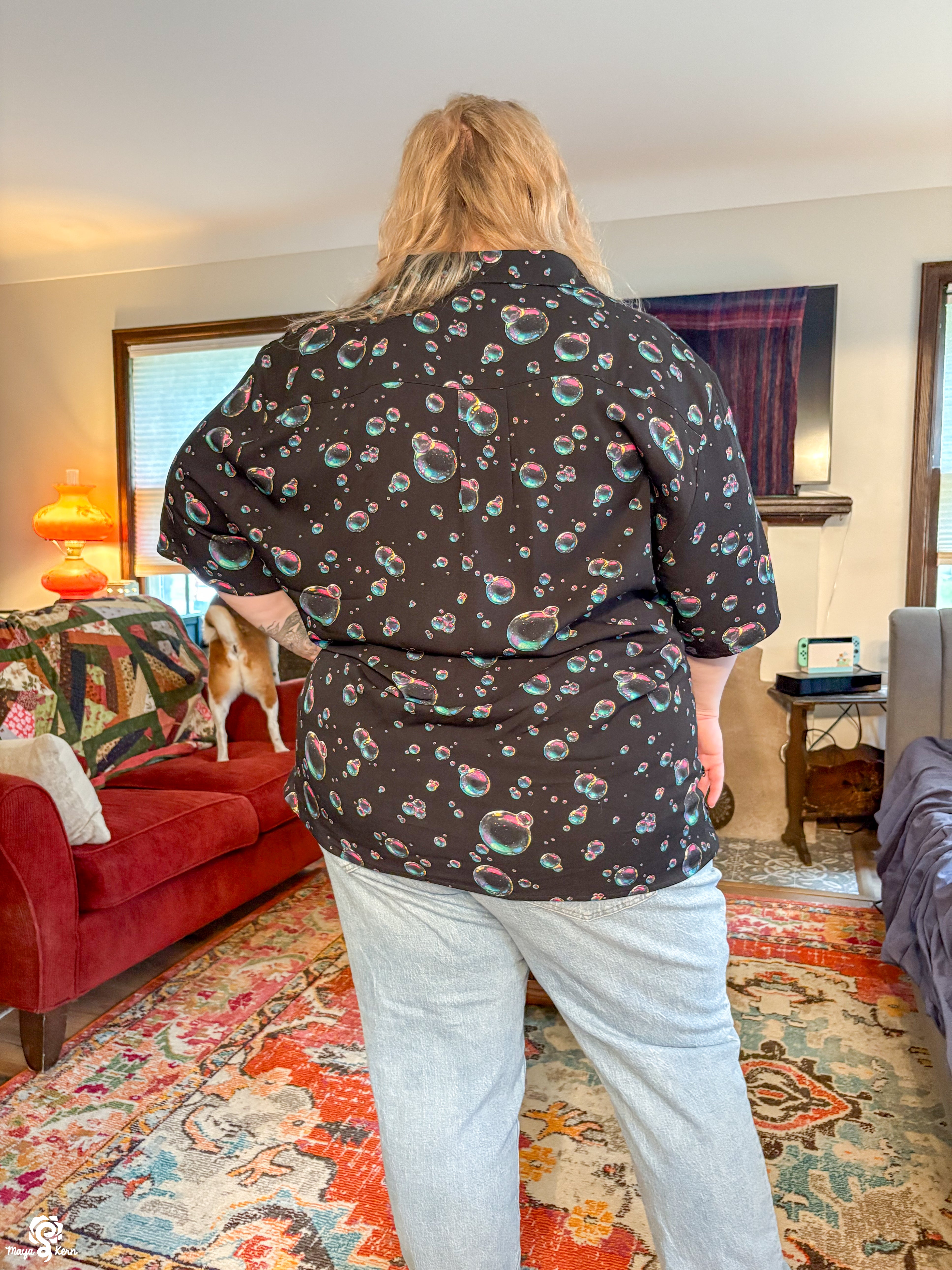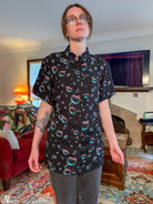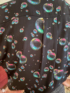 A short sleeved button-up shirt featuring my Bubbles design. This fabric features iridescent bubbles shining rainbows against a black background.