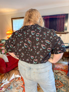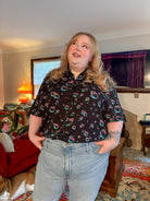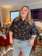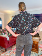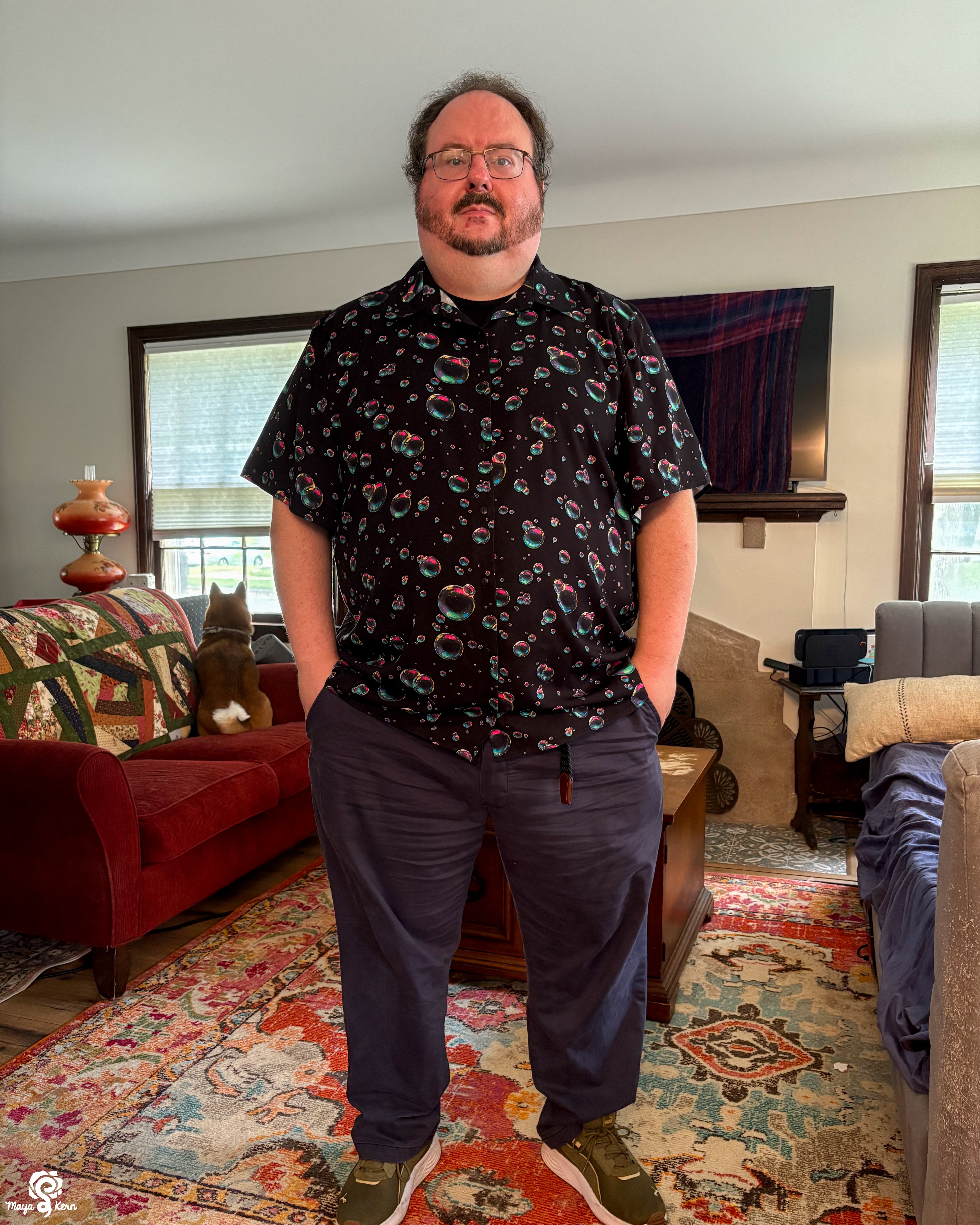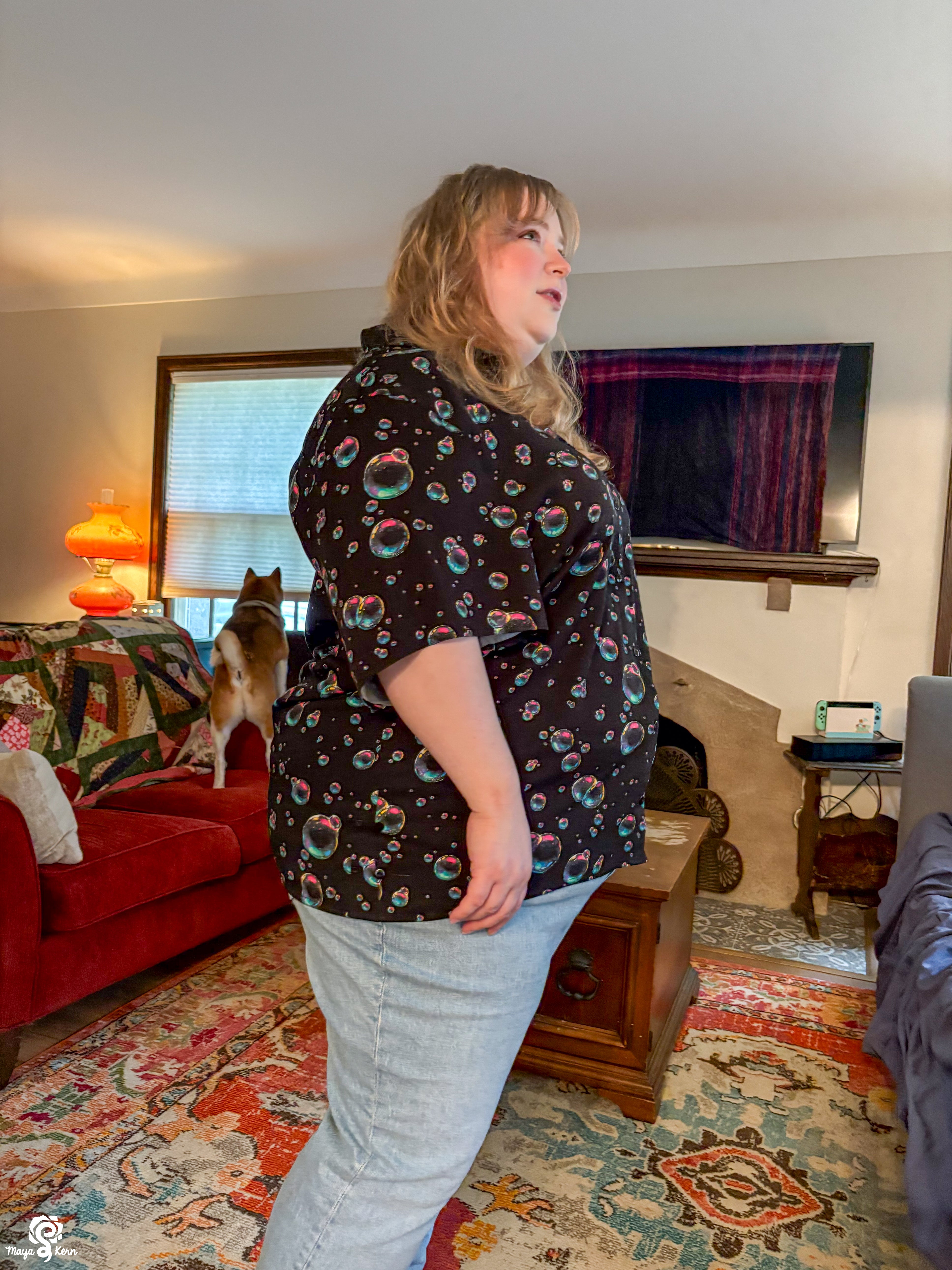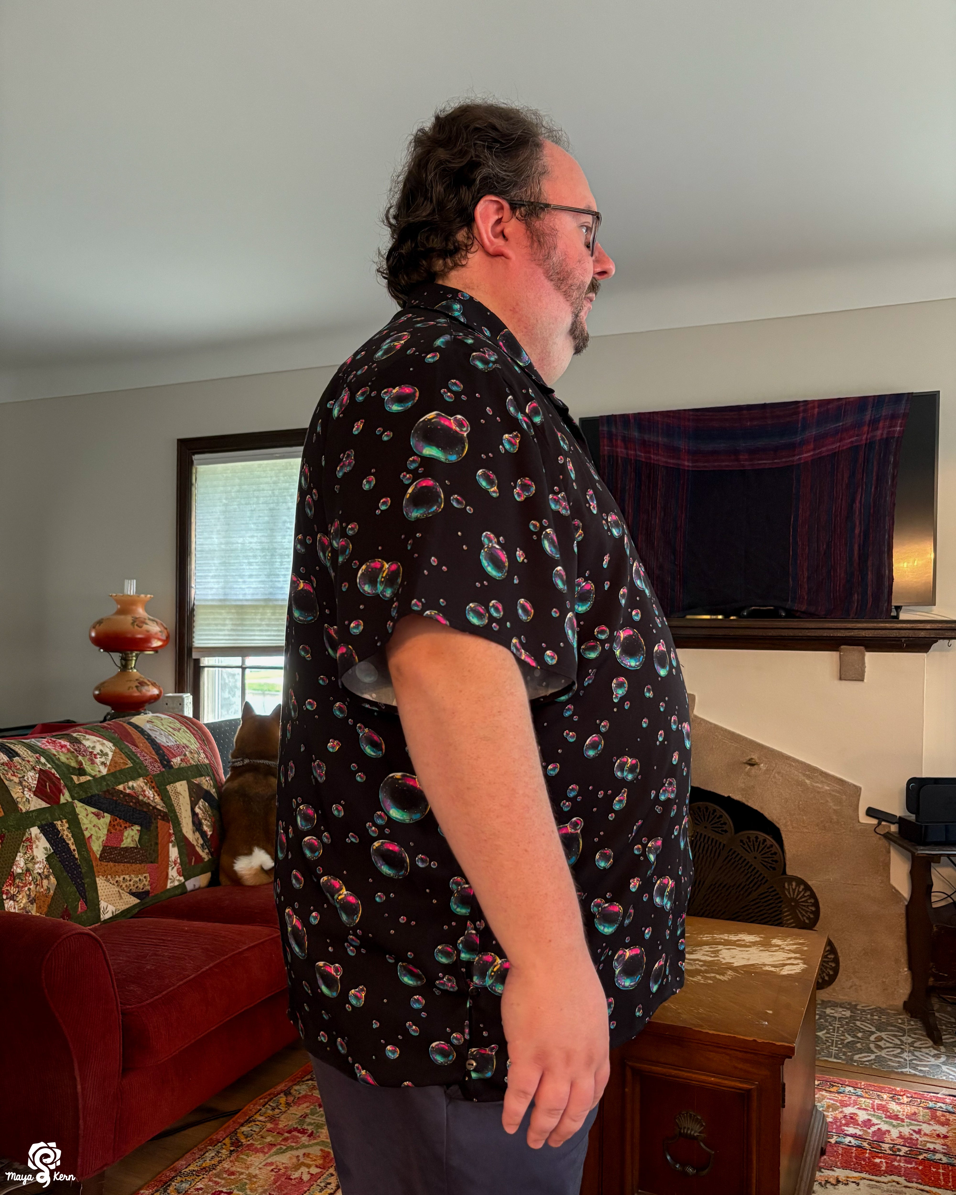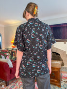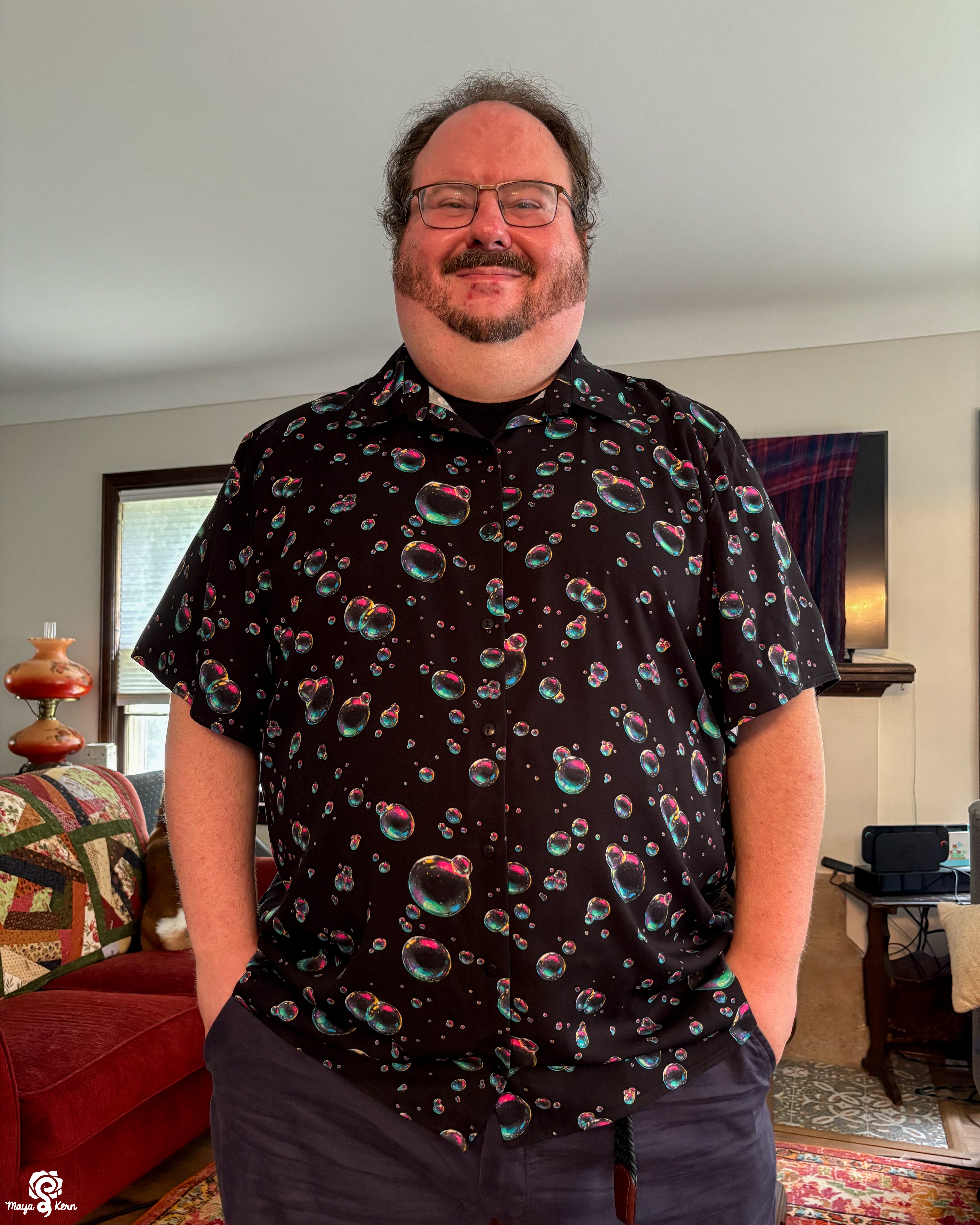 A short sleeved button-up shirt featuring my Bubbles design. This fabric features iridescent bubbles shining rainbows against a black background.