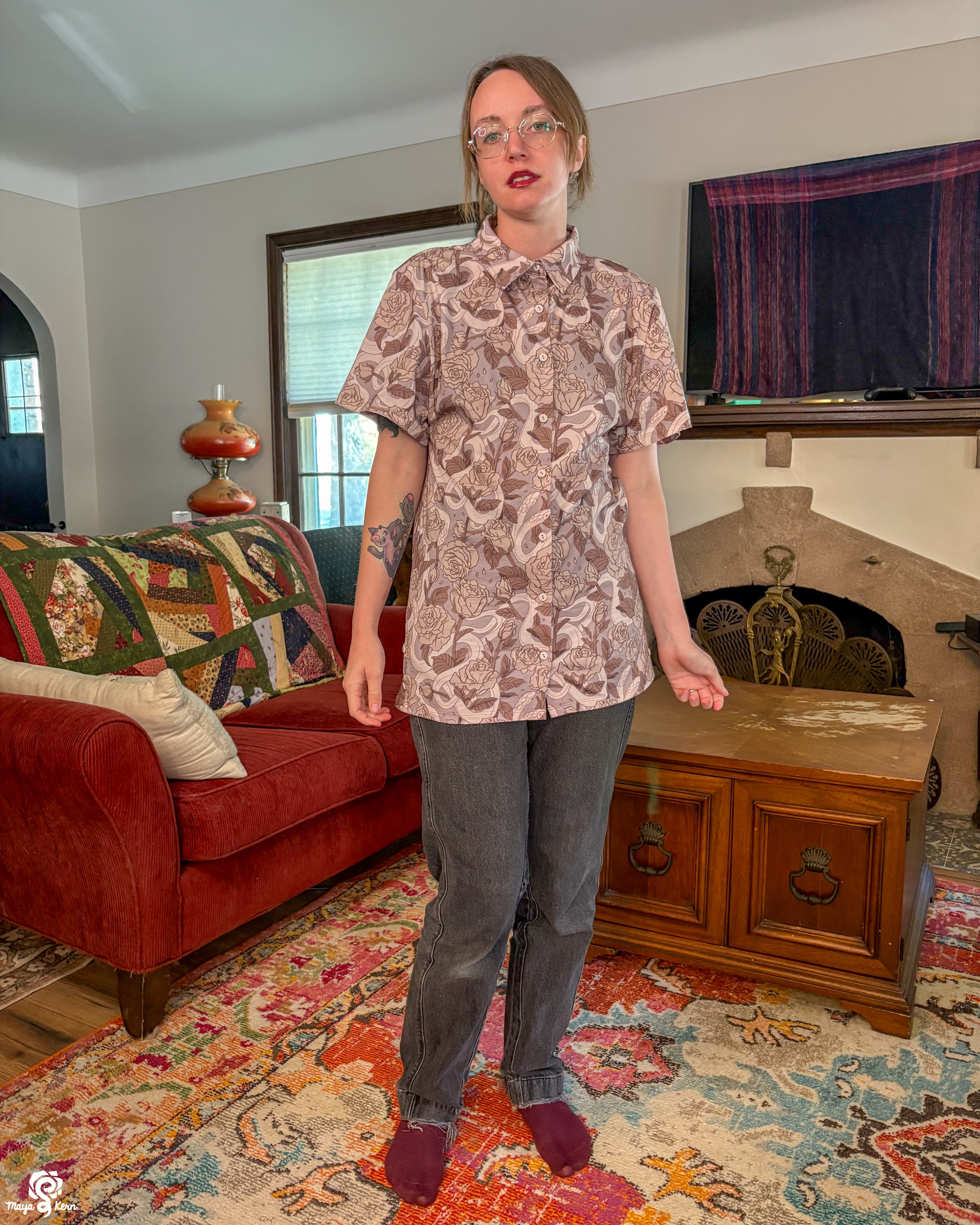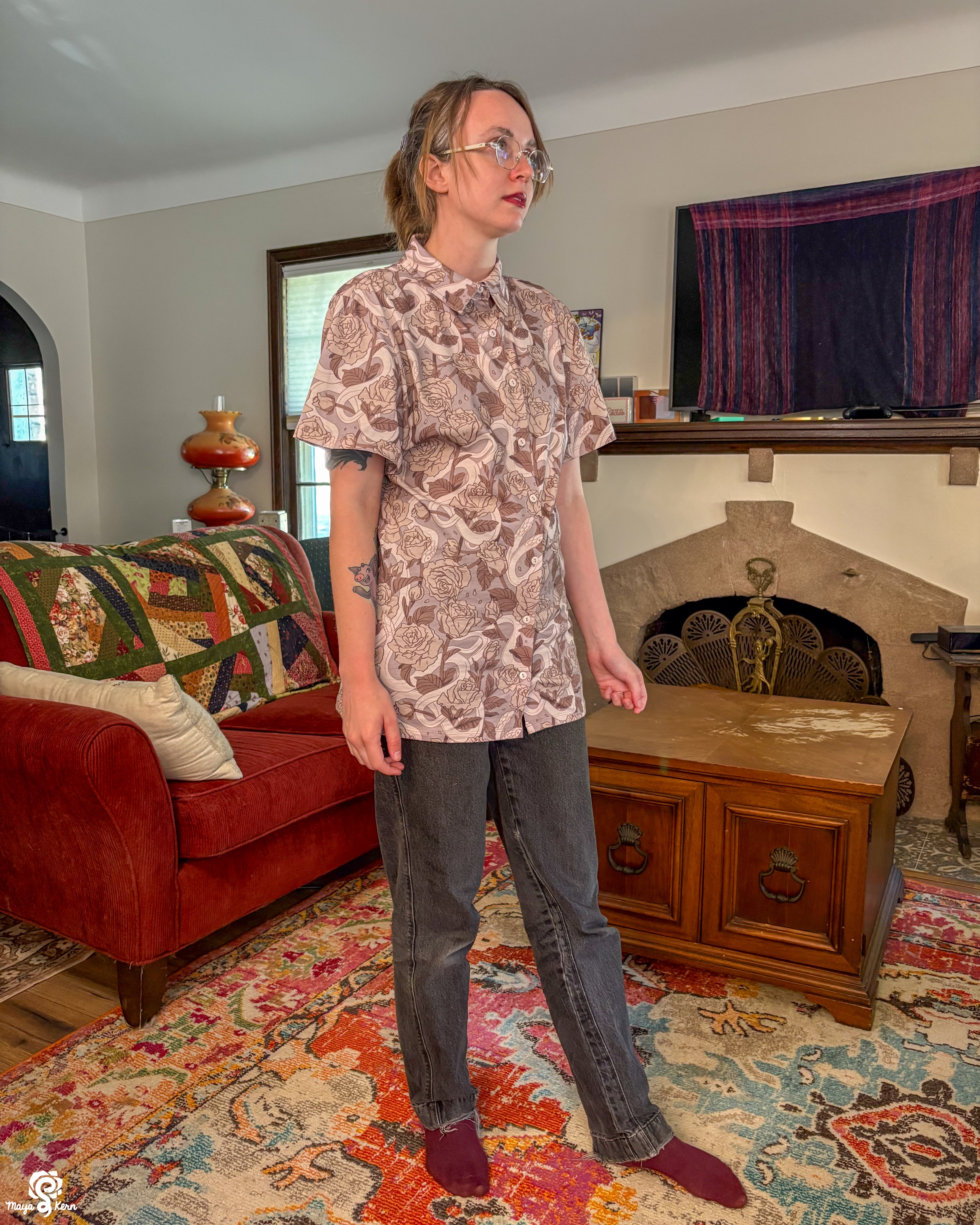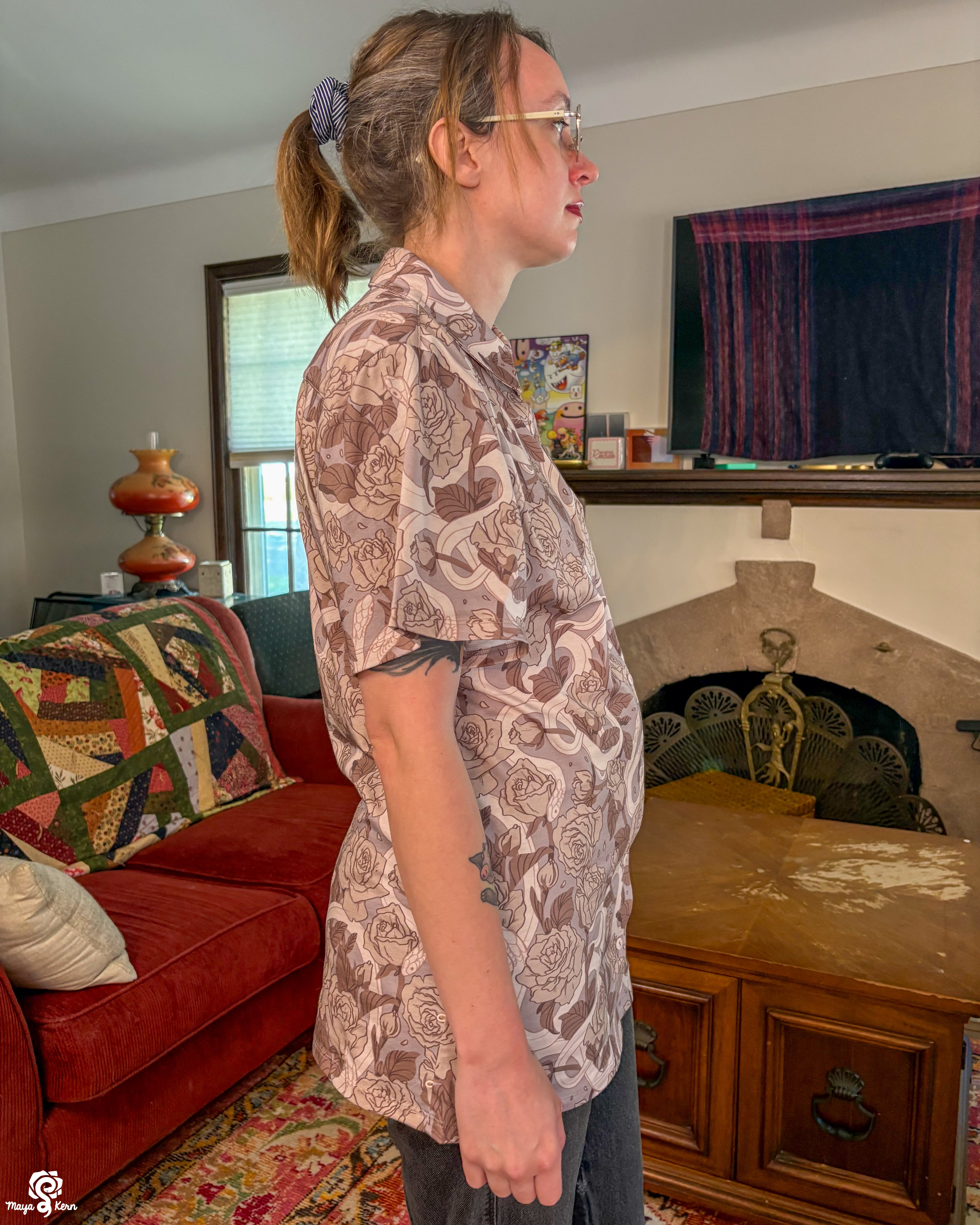 This shirt has a straight "masculine" cut, but features gussets at the side seams, which can be unbuttoned to expand the hip area for an improved fit.