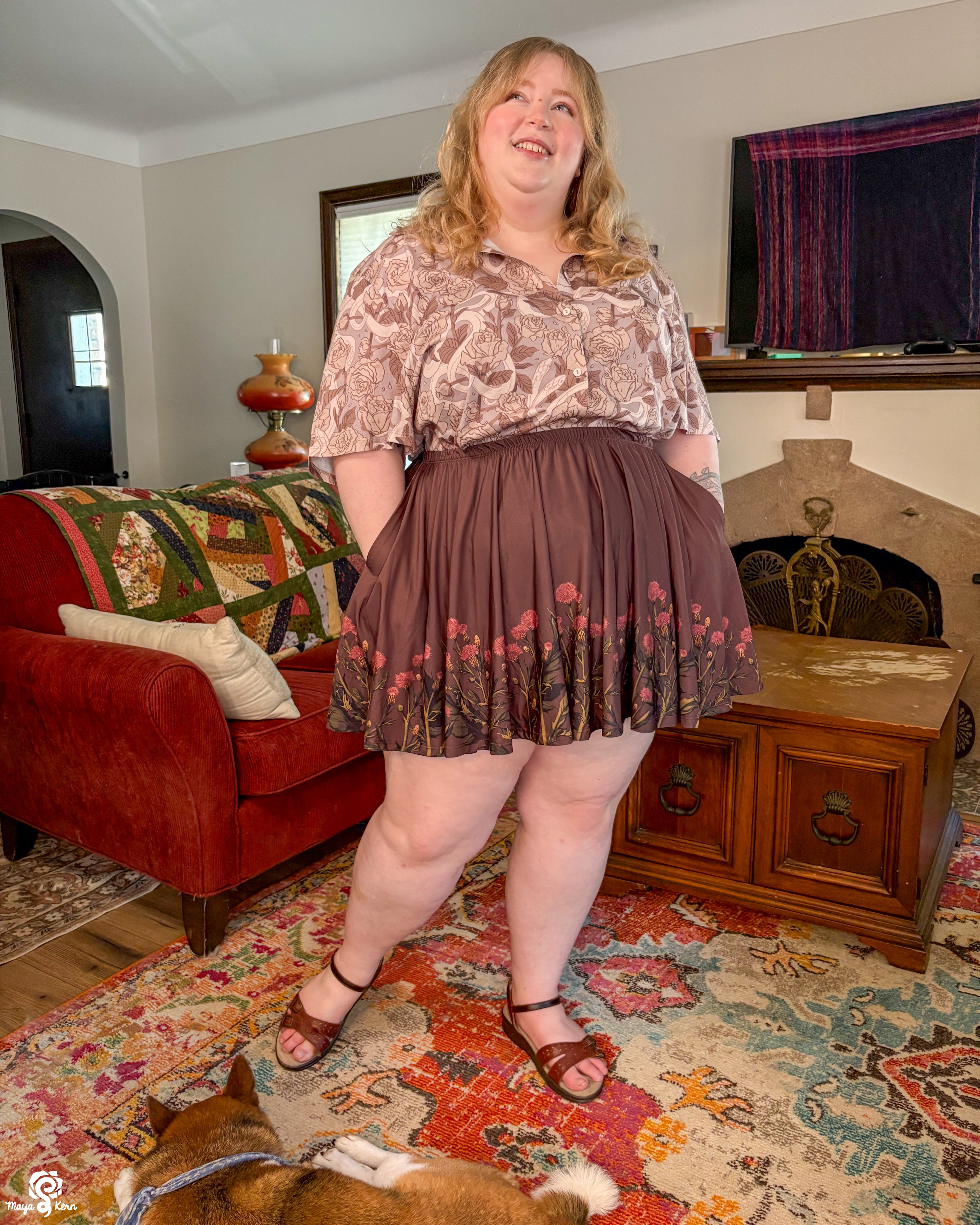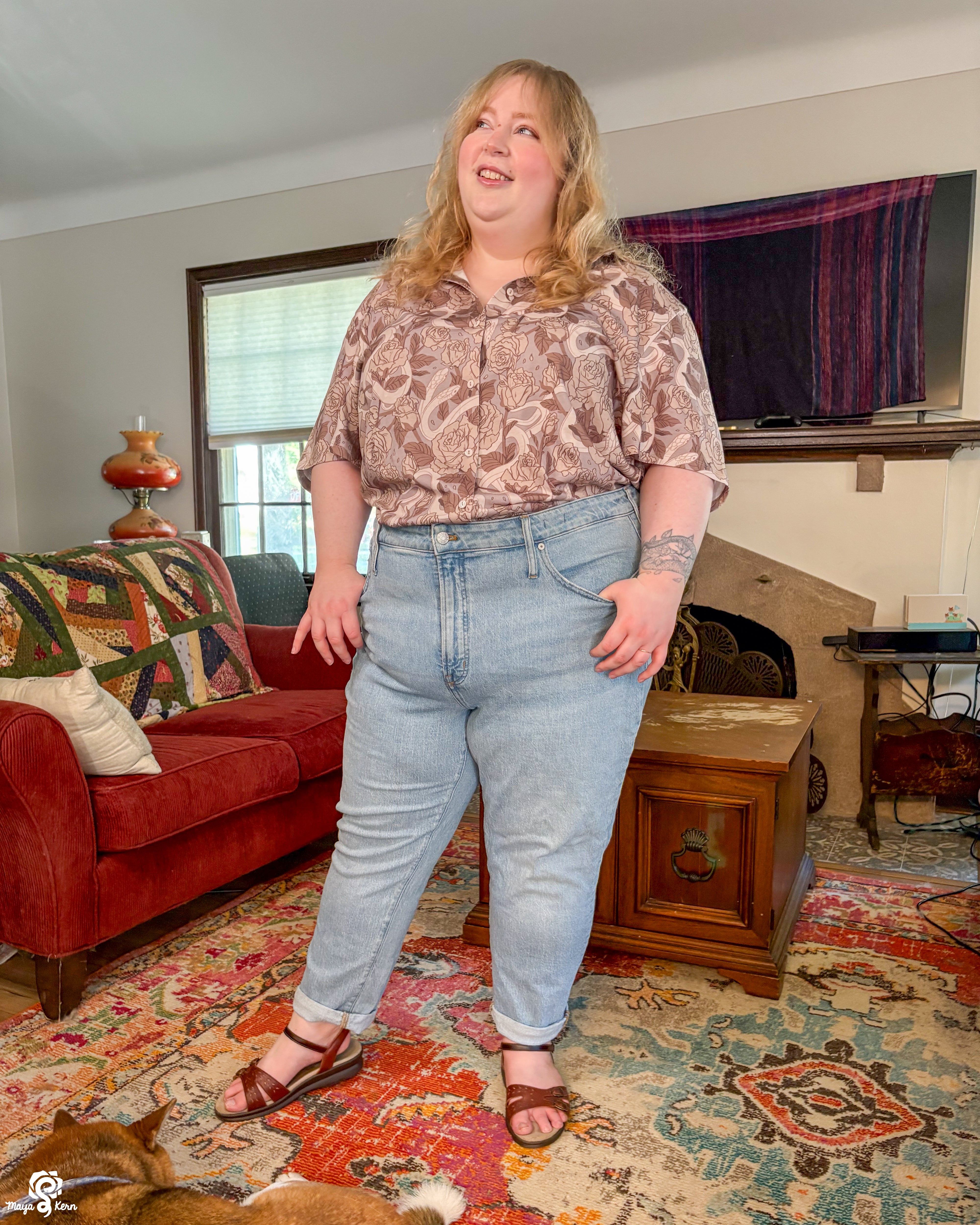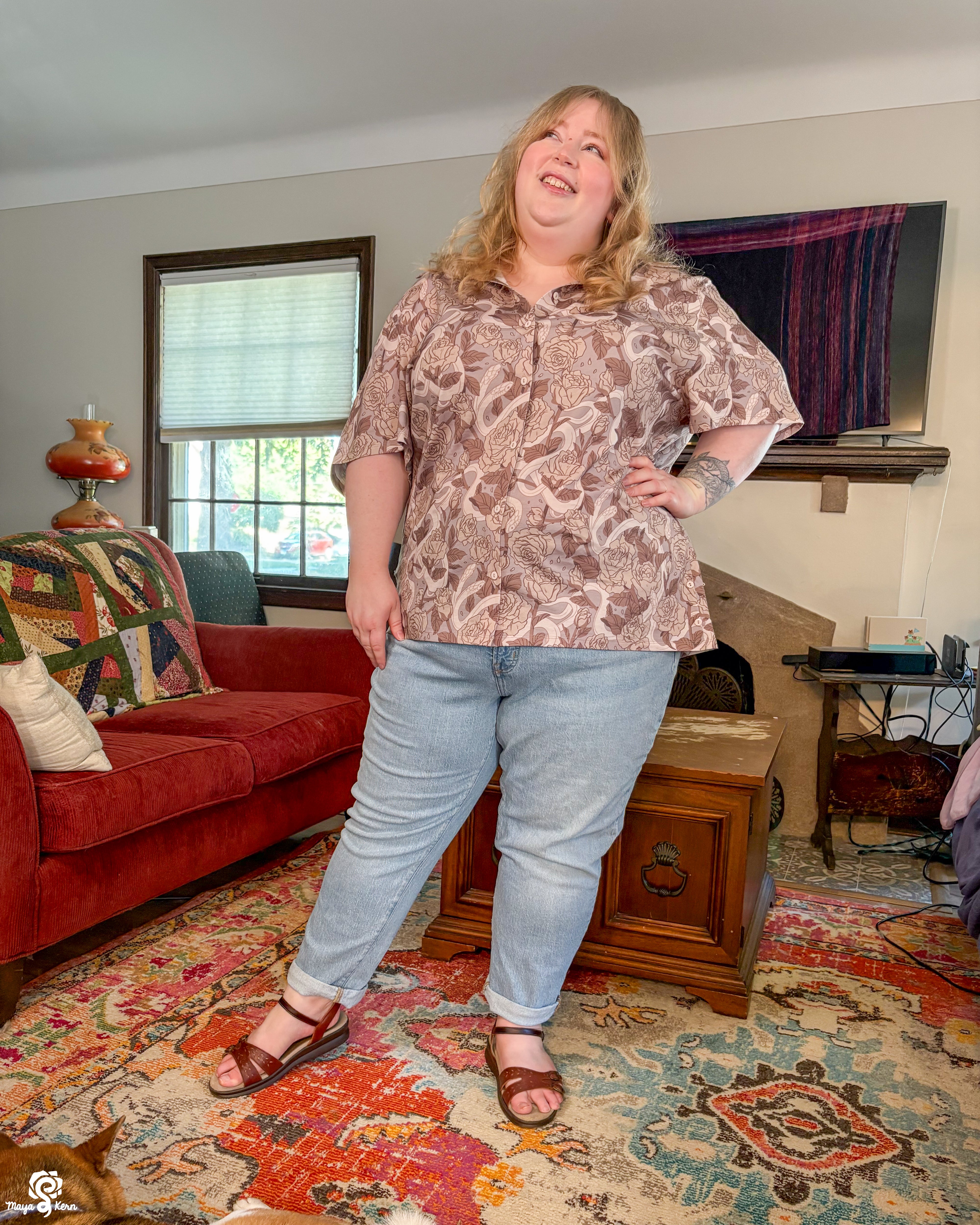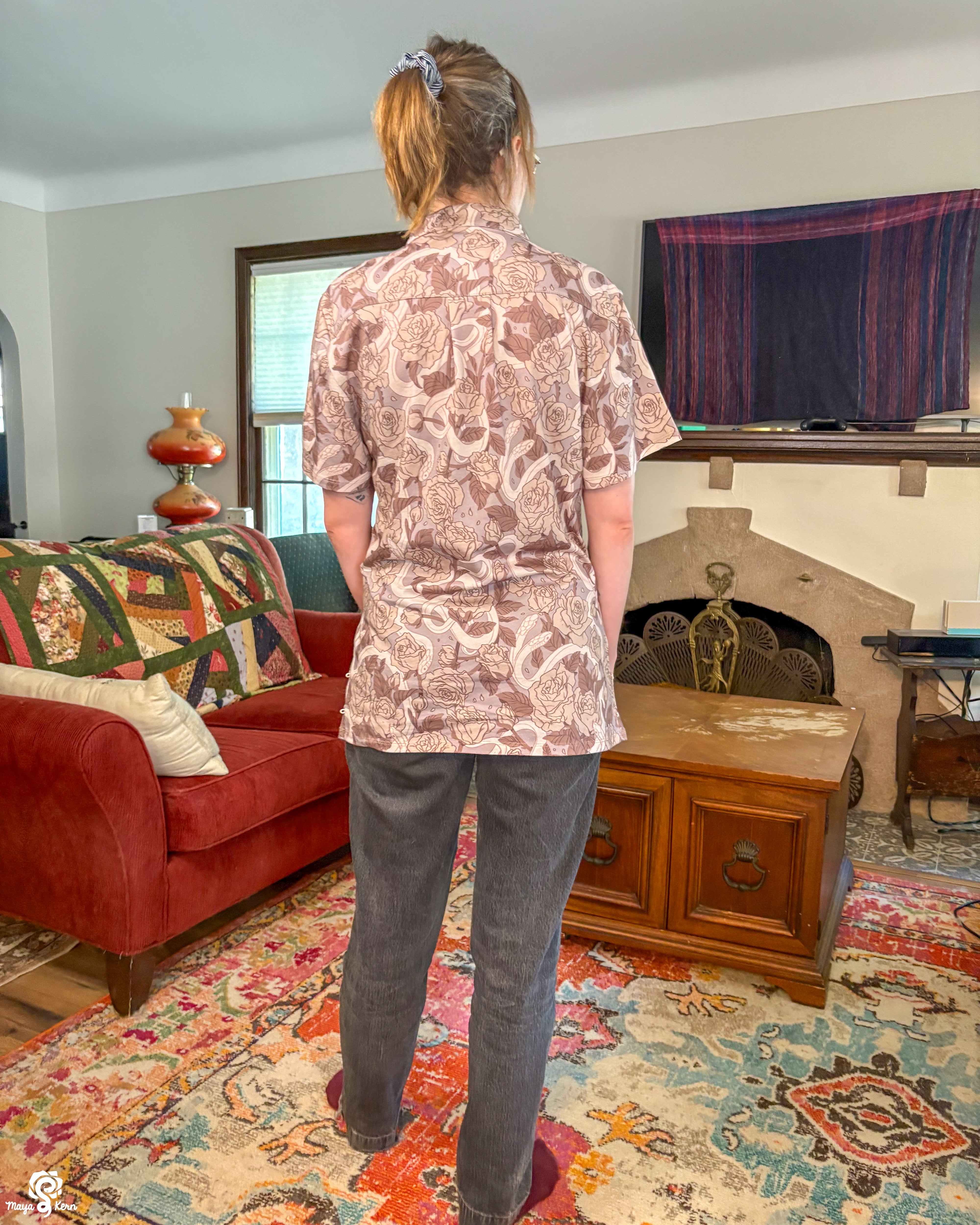 This shirt has a straight "masculine" cut, but features gussets at the side seams, which can be unbuttoned to expand the hip area for an improved fit.