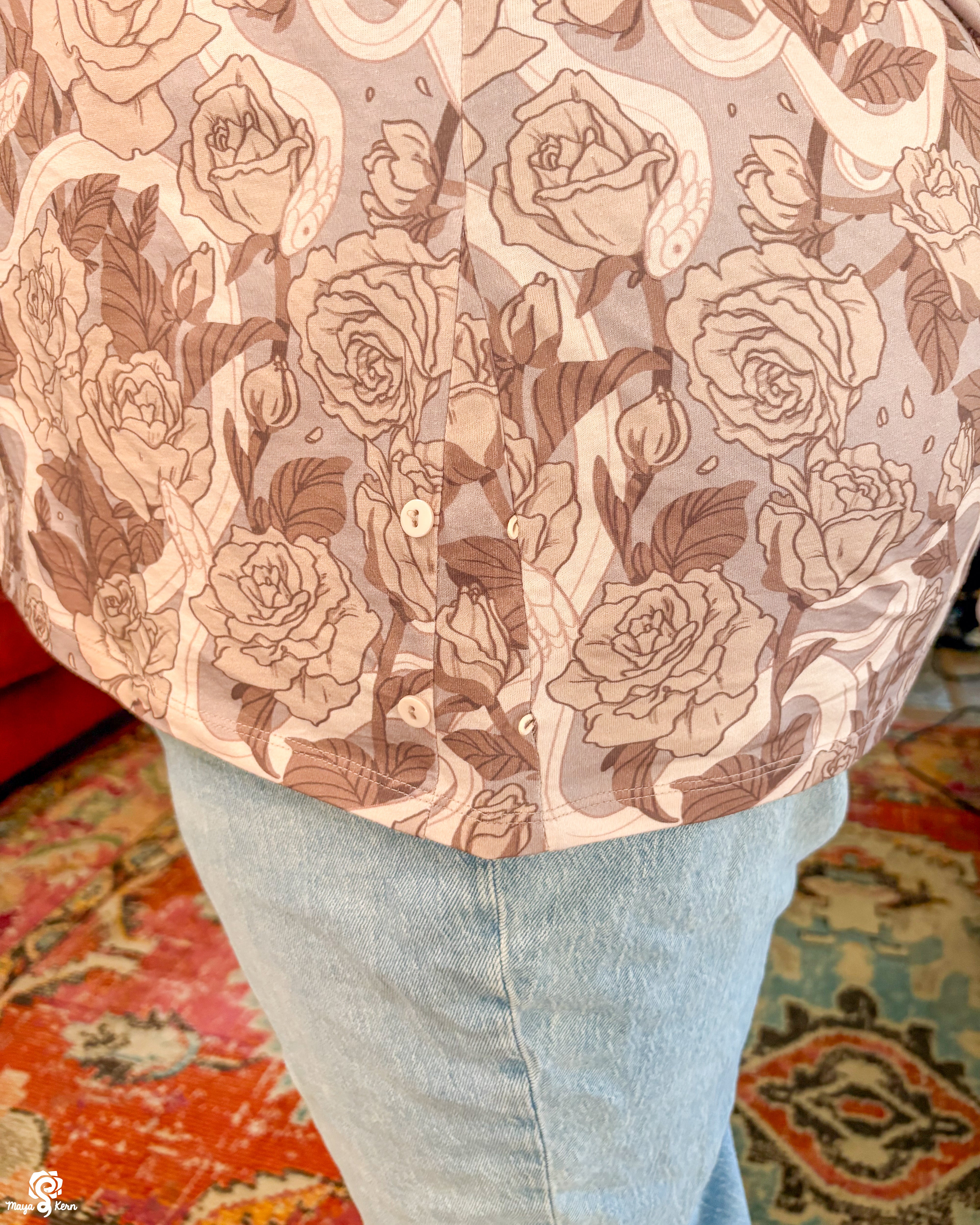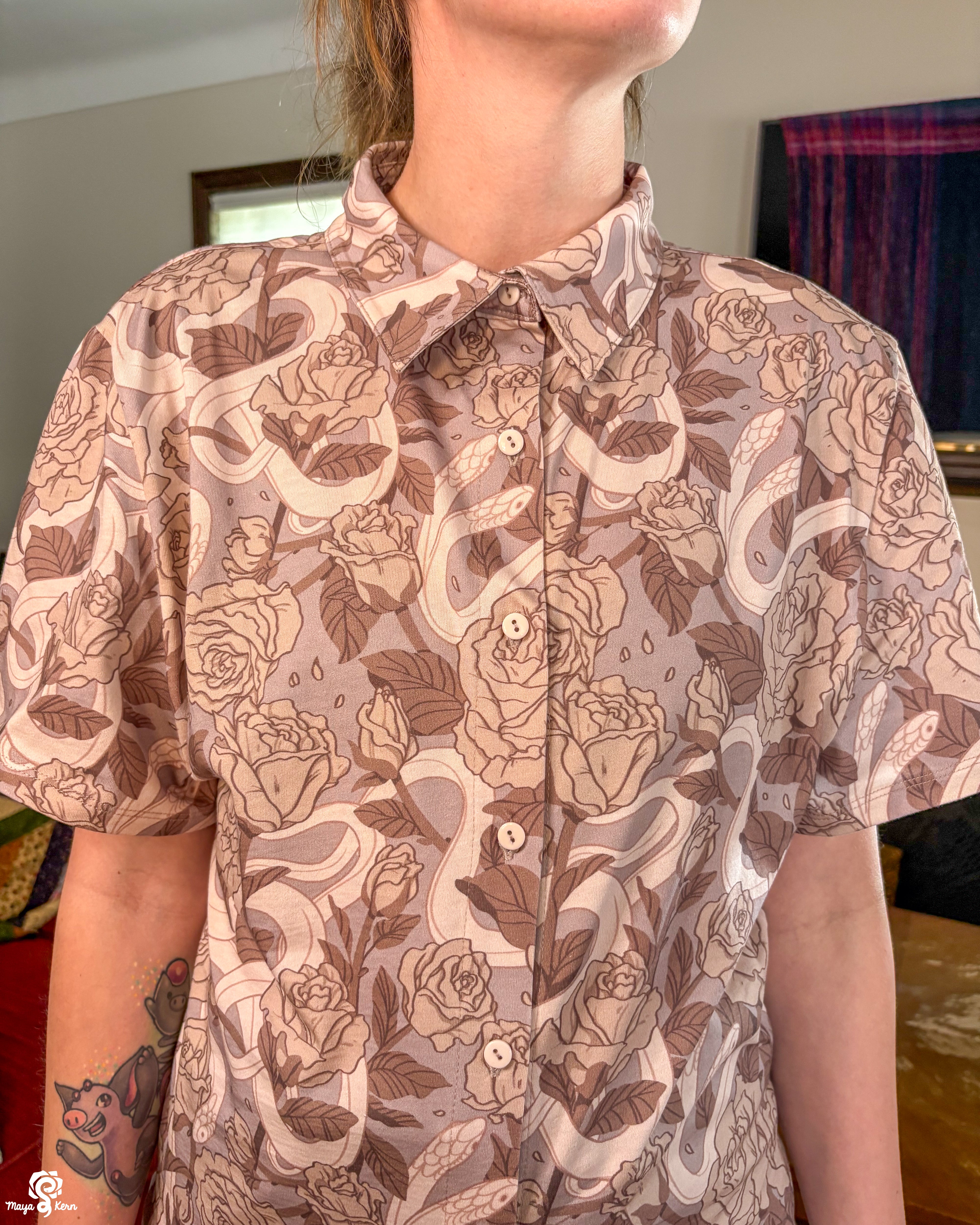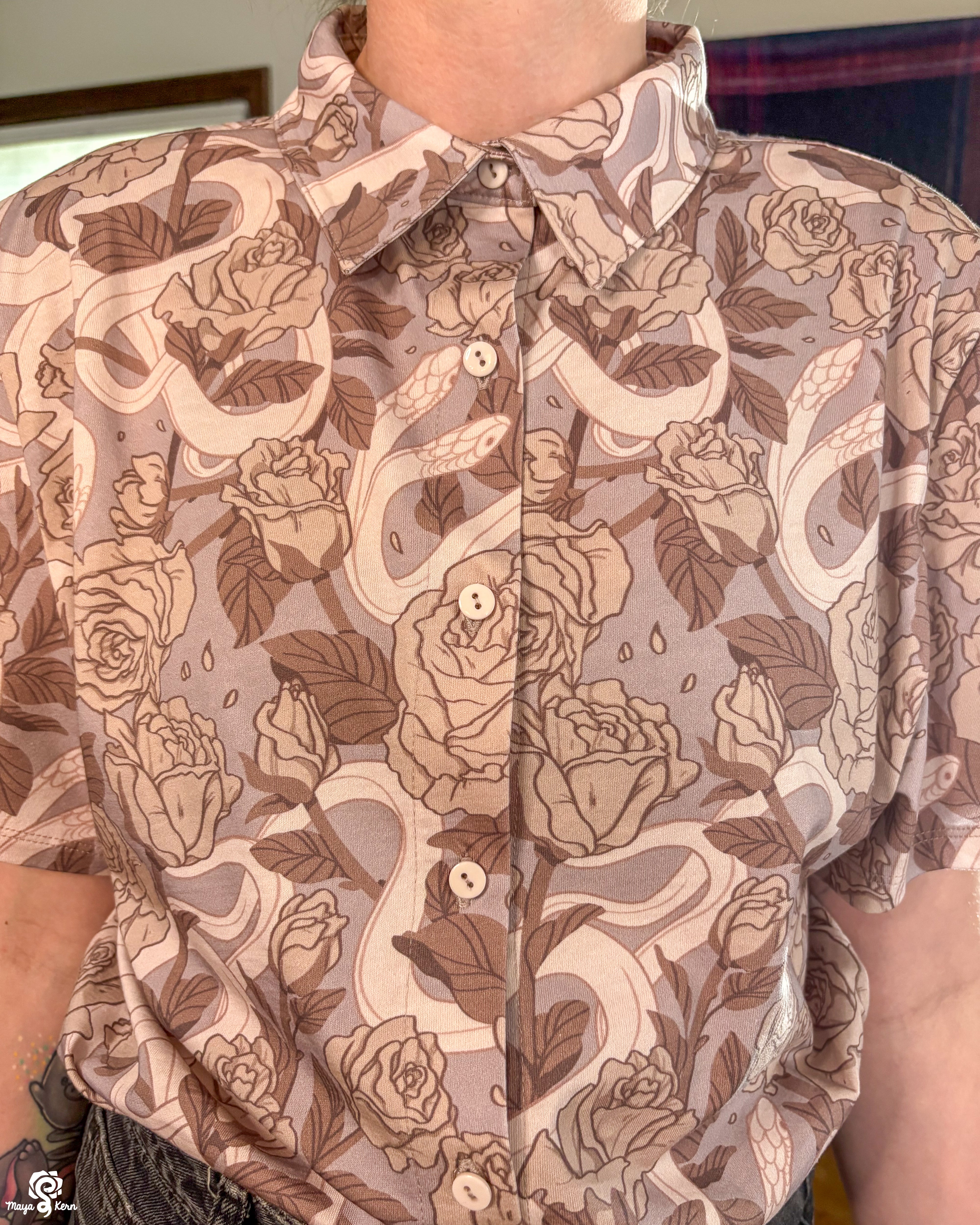A short sleeved button-up shirt featuring my Hiss From a Rose design in a Latte color way. This design features white snakes and warm gray roses (similar to a muted sandy brown) on a light, cool-toned gray background. Over all it has a soft, elegant look to it.