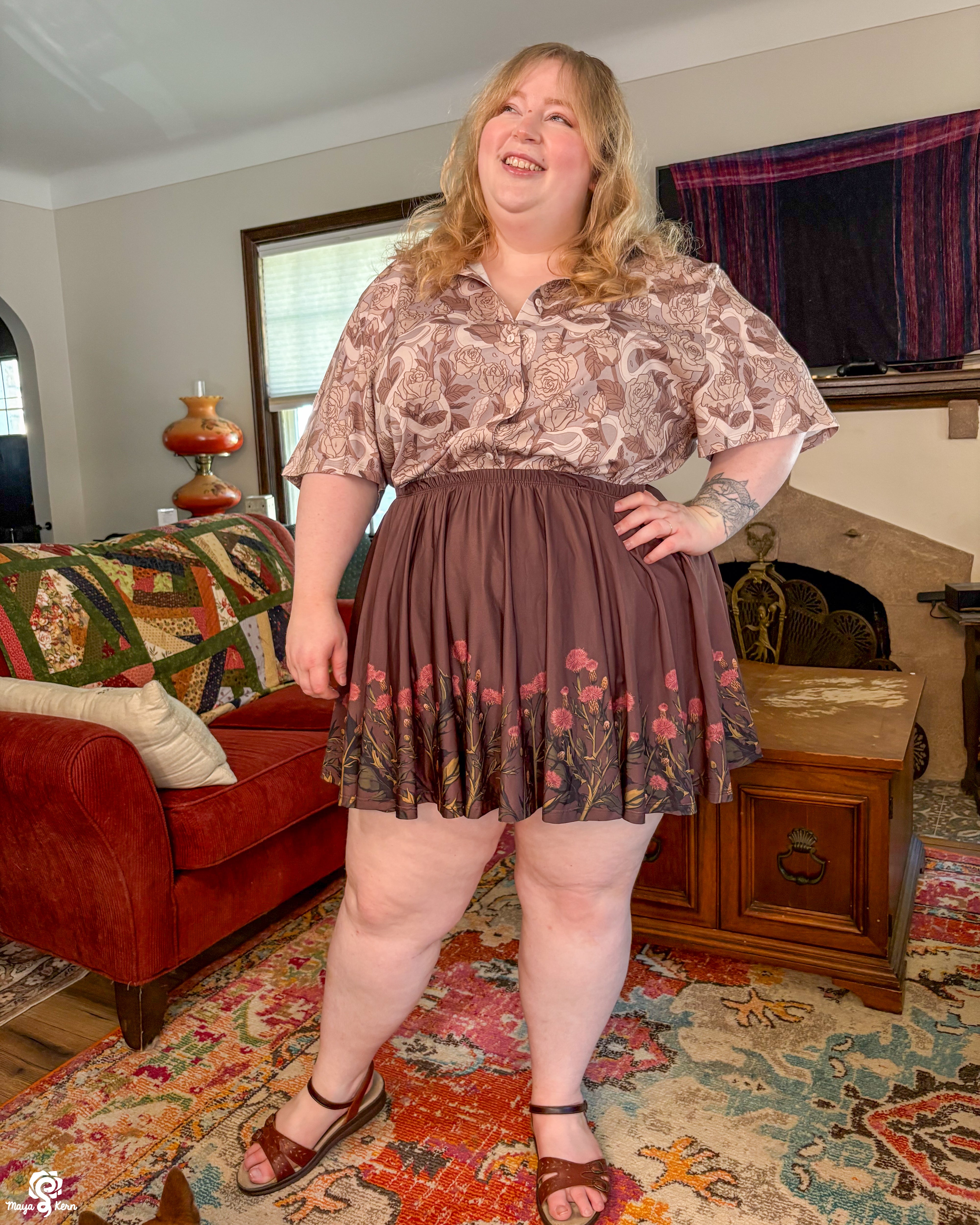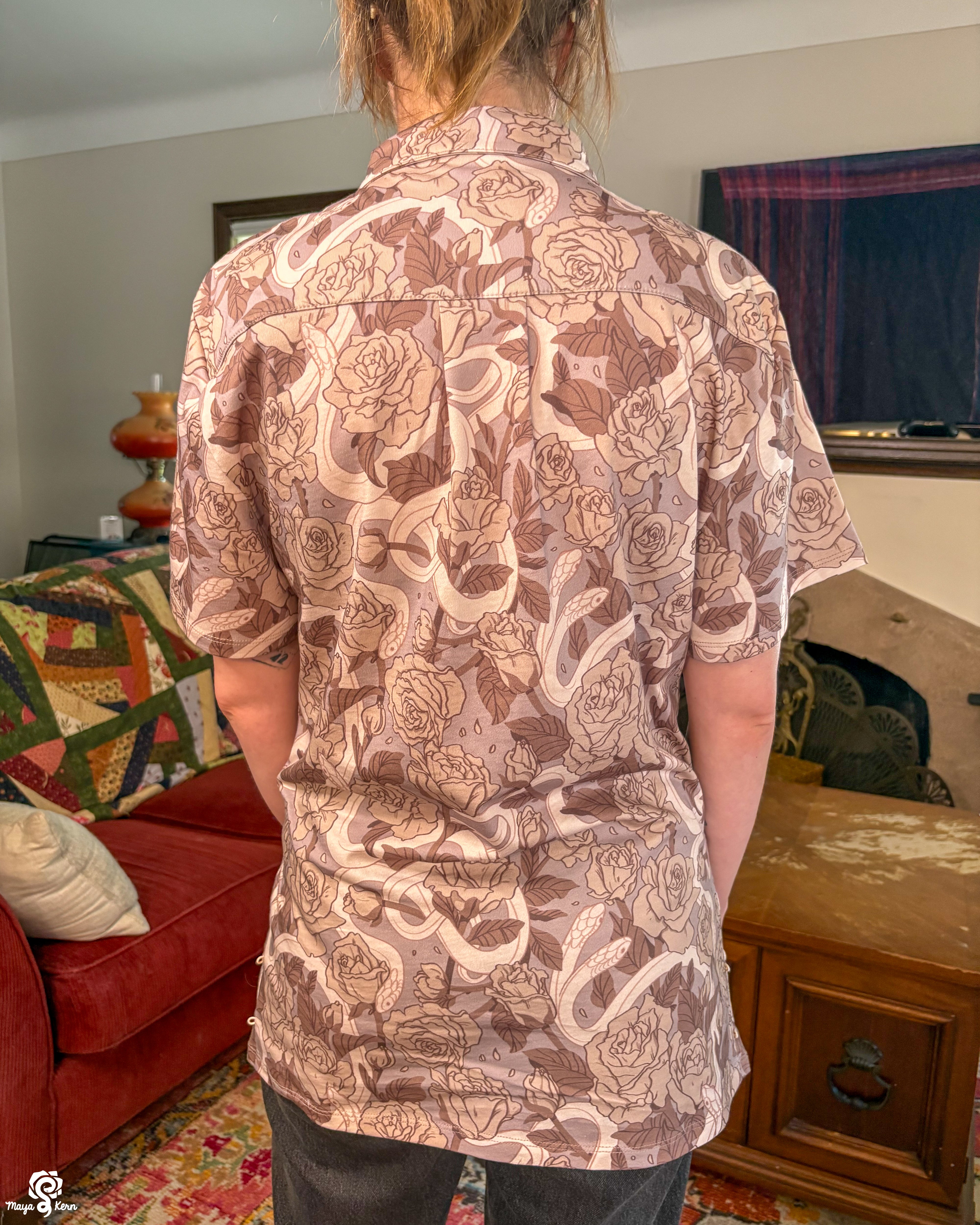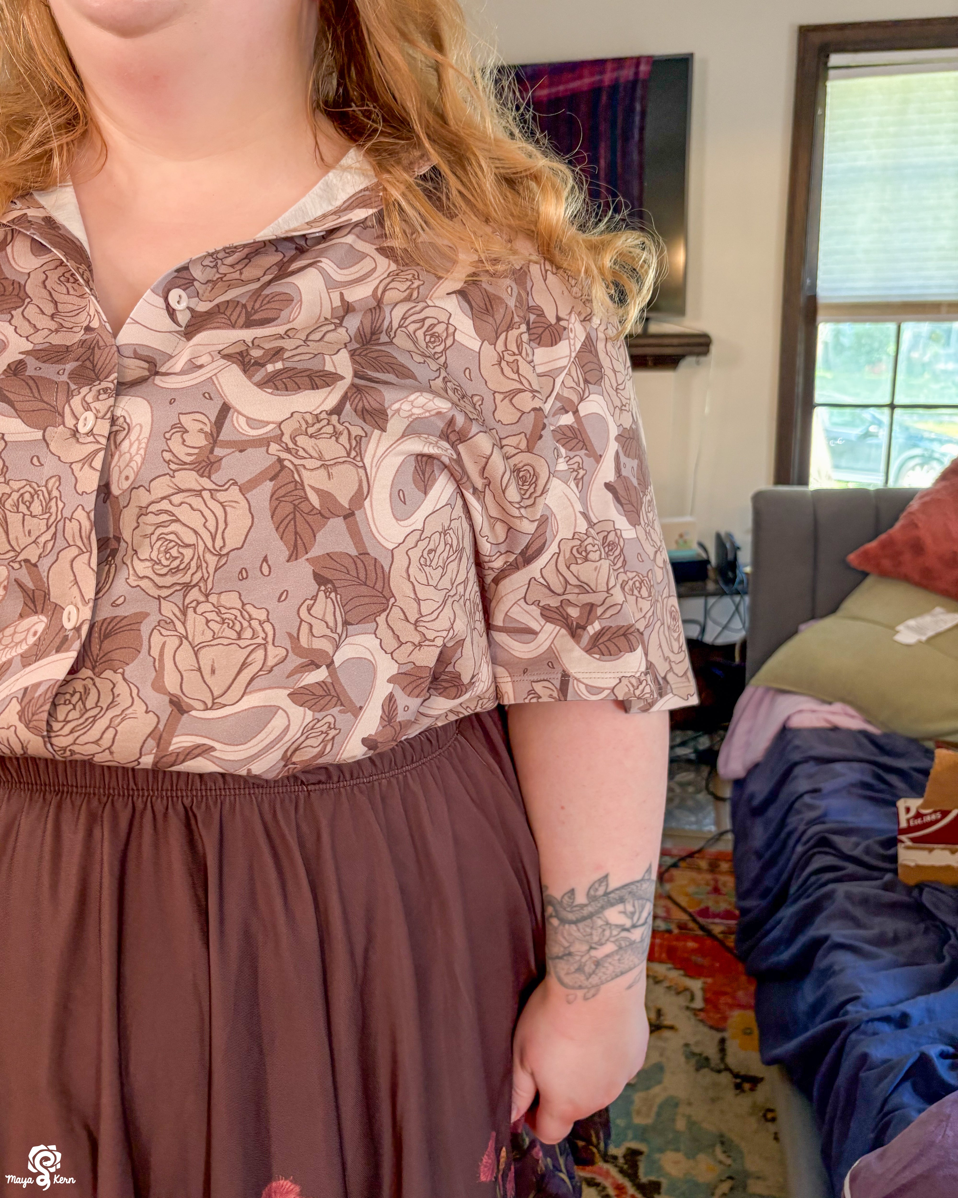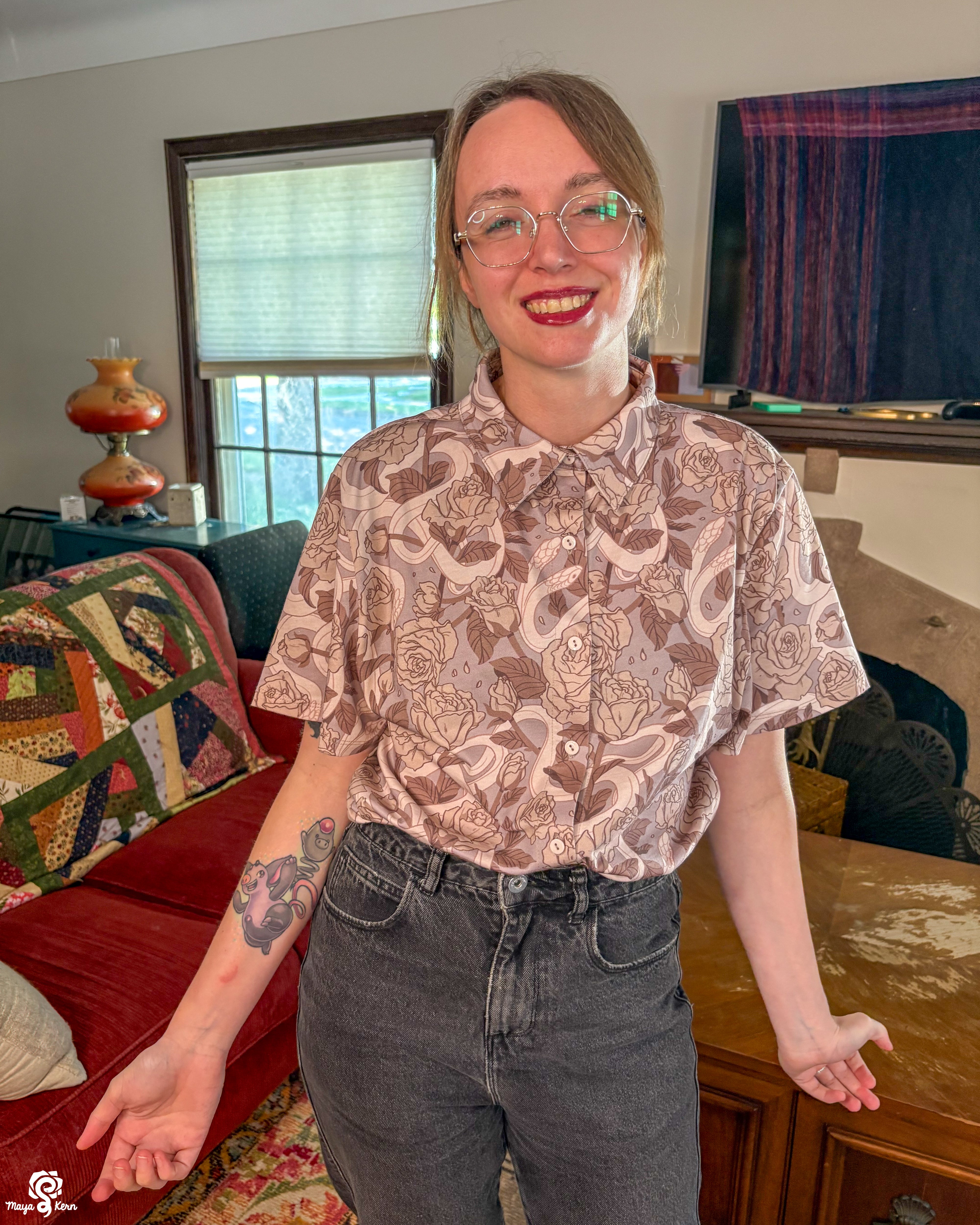 A short sleeved button-up shirt featuring my Hiss From a Rose design in a Latte color way. This design features white snakes and warm gray roses (similar to a muted sandy brown) on a light, cool-toned gray background. Over all it has a soft, elegant look to it.