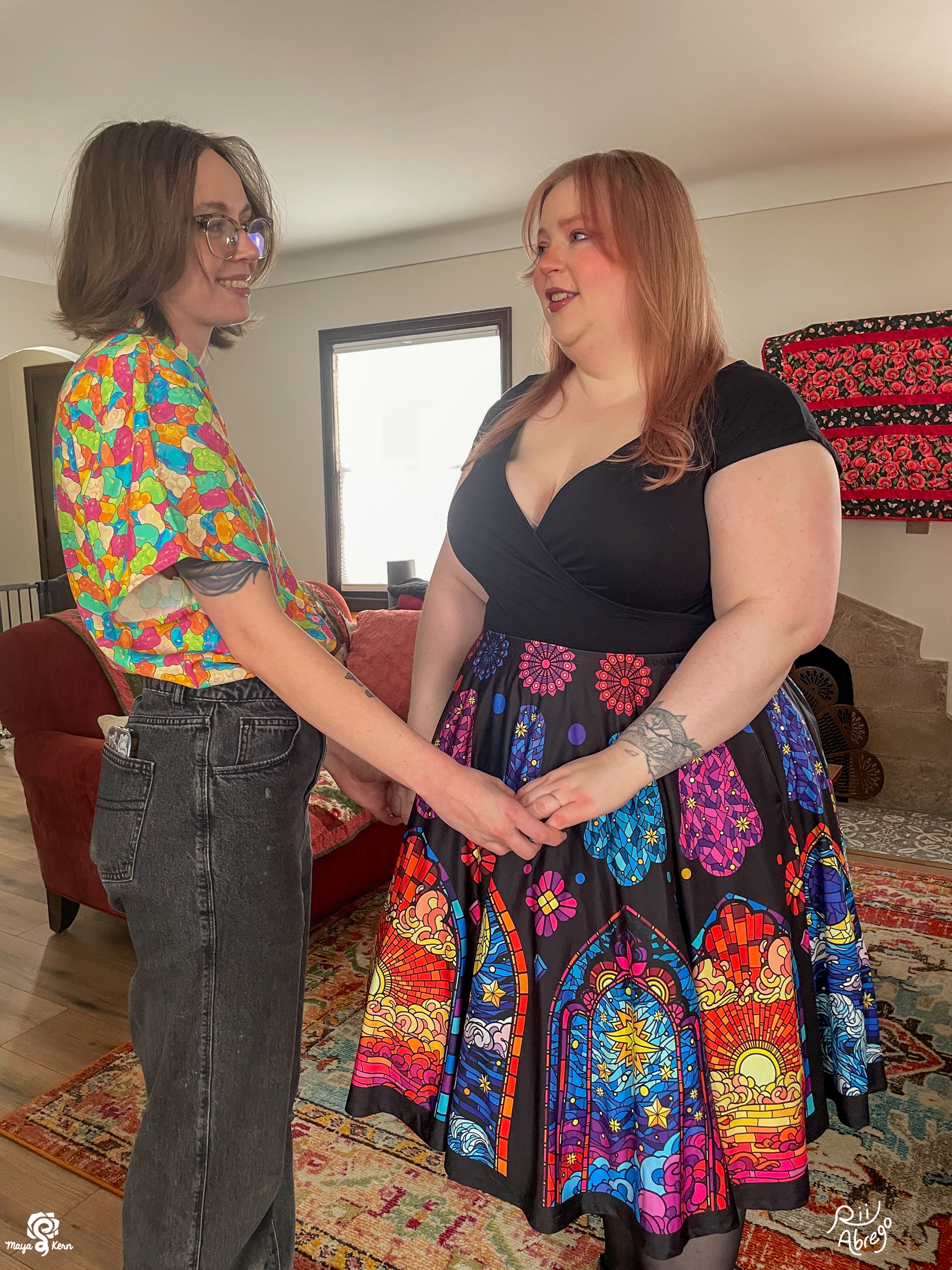 This shirt has a straight "masculine" cut, but features gussets at the side seams, which can be unbuttoned to expand the hip area for an improved fit.