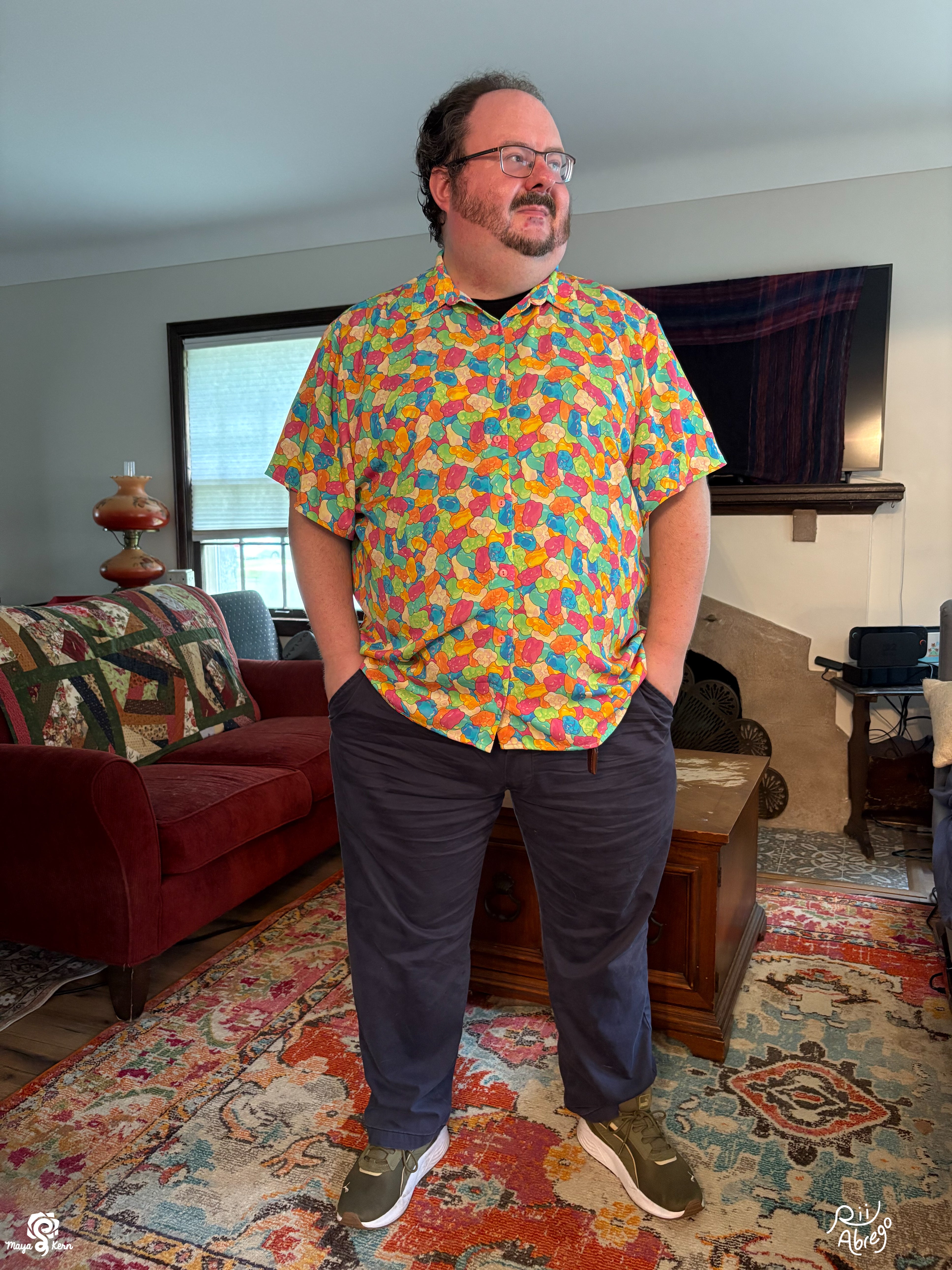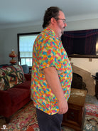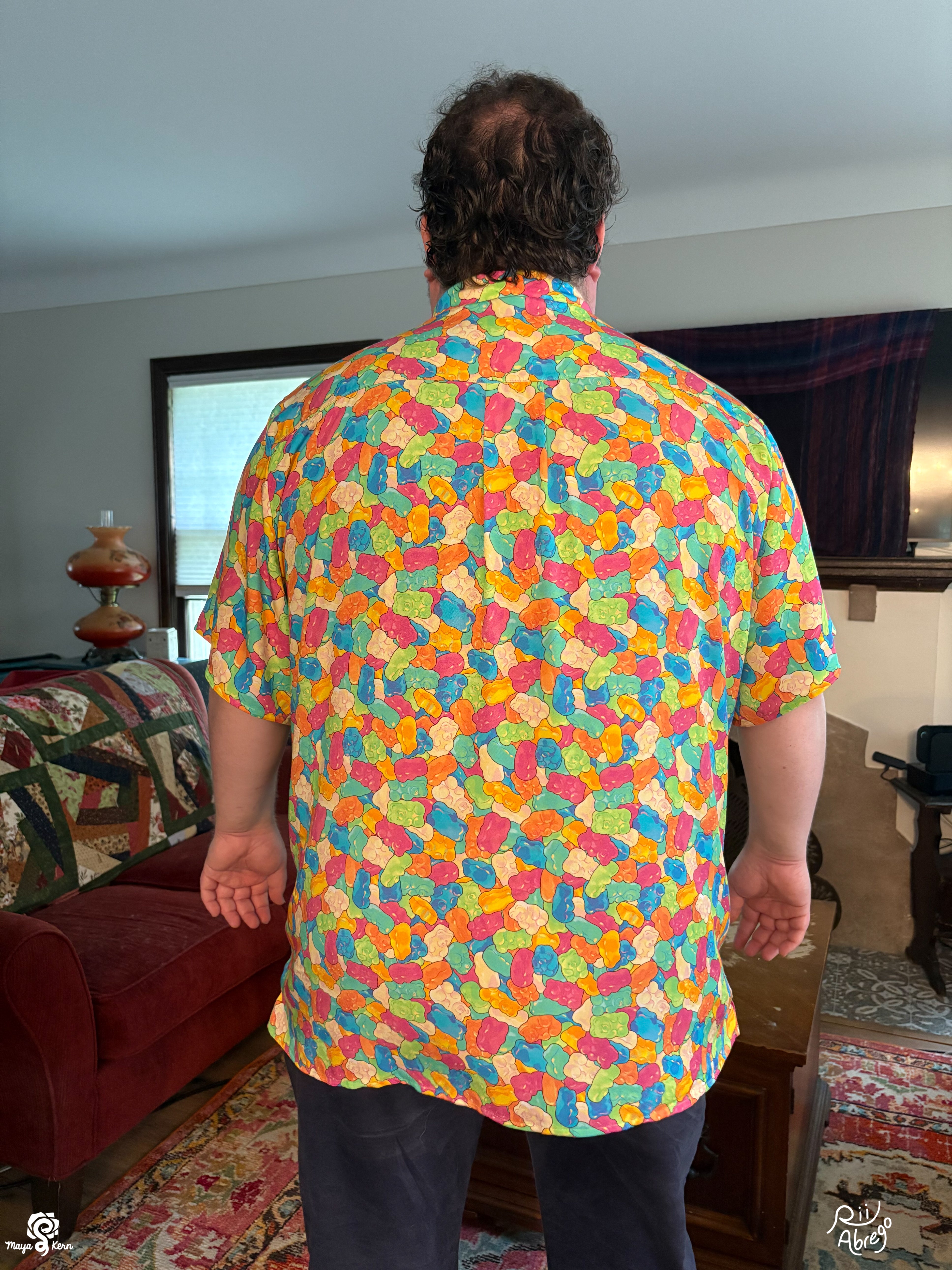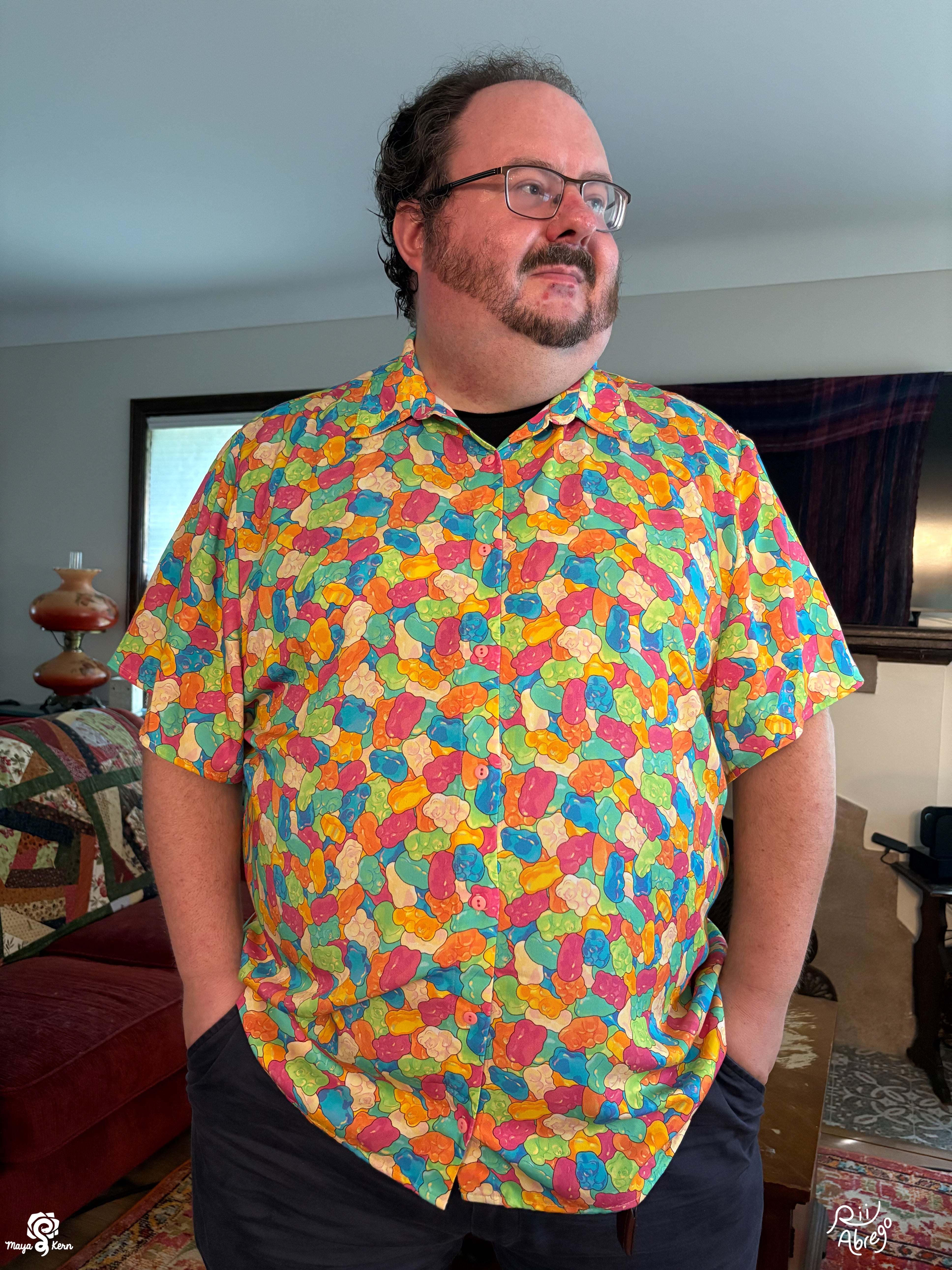 A short sleeved button-up shirt featuring Rii Abrego's Gummy Bear's design.