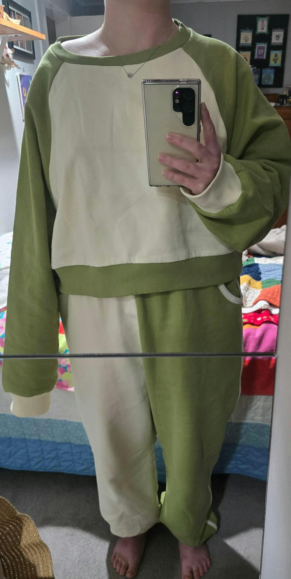 This color blocked sweater features a warm white torso and ribbed cuffs, while the sleeves and ribbed neckline and bottom hem are a warm, mossy green that perfectly resembles a delicious matcha latte.