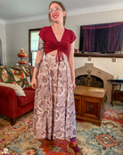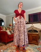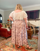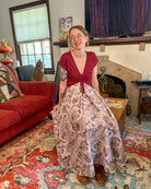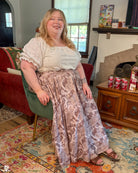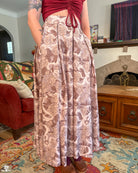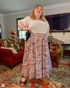 A maxi length pleated box skirt featuring my Hiss From a Rose design in a Latte color way. This design features white snakes and warm gray roses (similar to a muted sandy brown) on a light, cool-toned gray background. Over all it has a soft, elegant look to it.