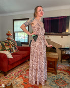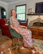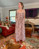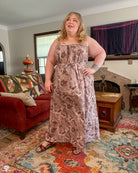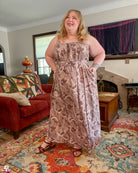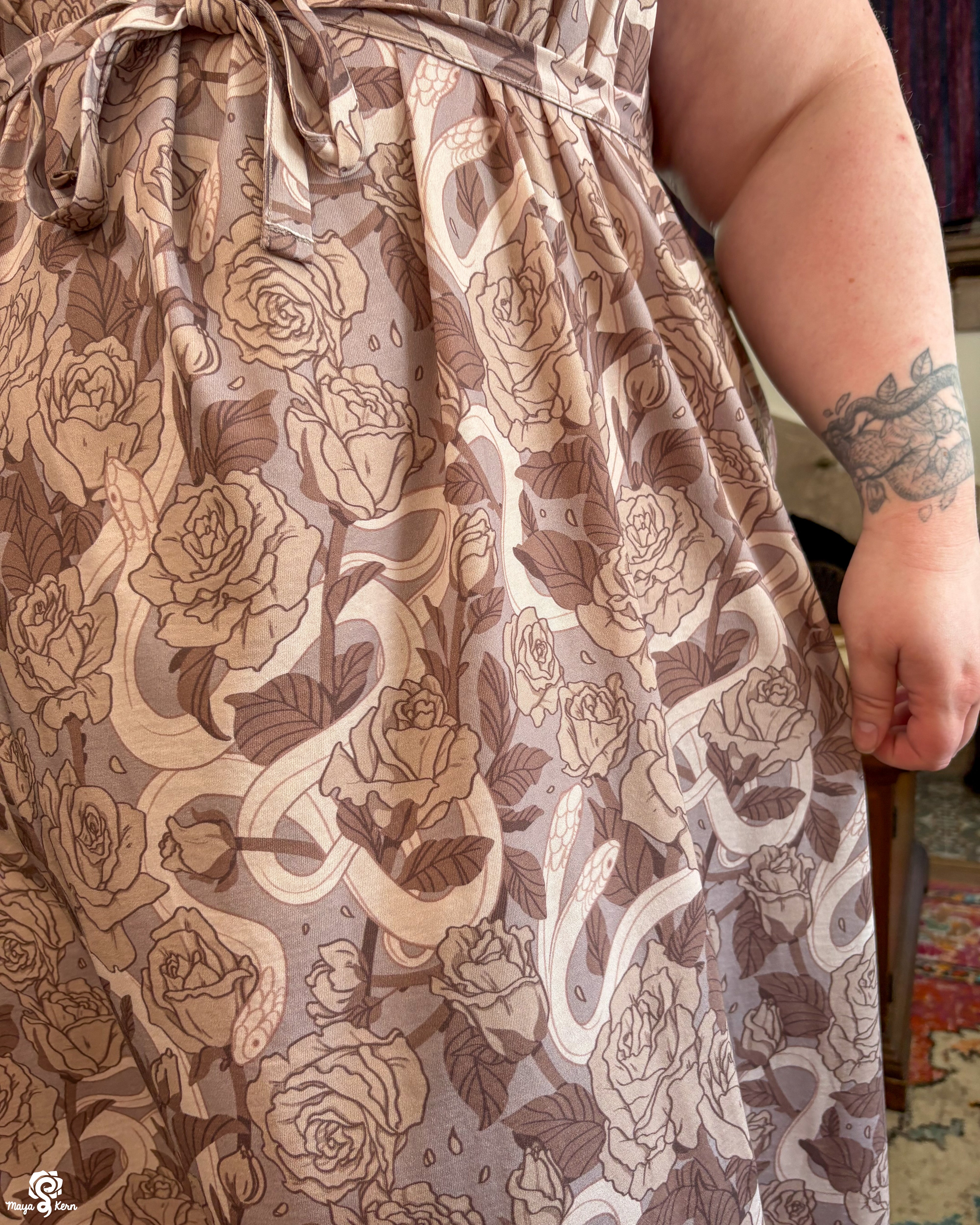 A breezy, 100% cotton maxi dress featuring my Hiss From a Rose design in a Latte color way. This design features white snakes and warm gray roses (similar to a muted sandy brown) on a light, cool-toned gray background. Over all it has a soft, elegant look to it.