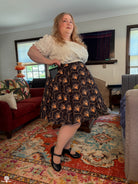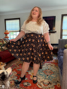 Stretchy circle skirt featuring my Bee design on a black background. These skirts have pockets large enough to fit your phone, DS, Switch, hands, and maybe a small cat. Petticoat not included.