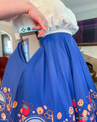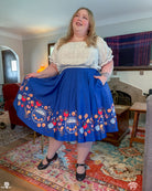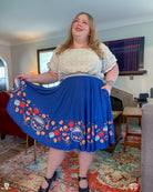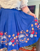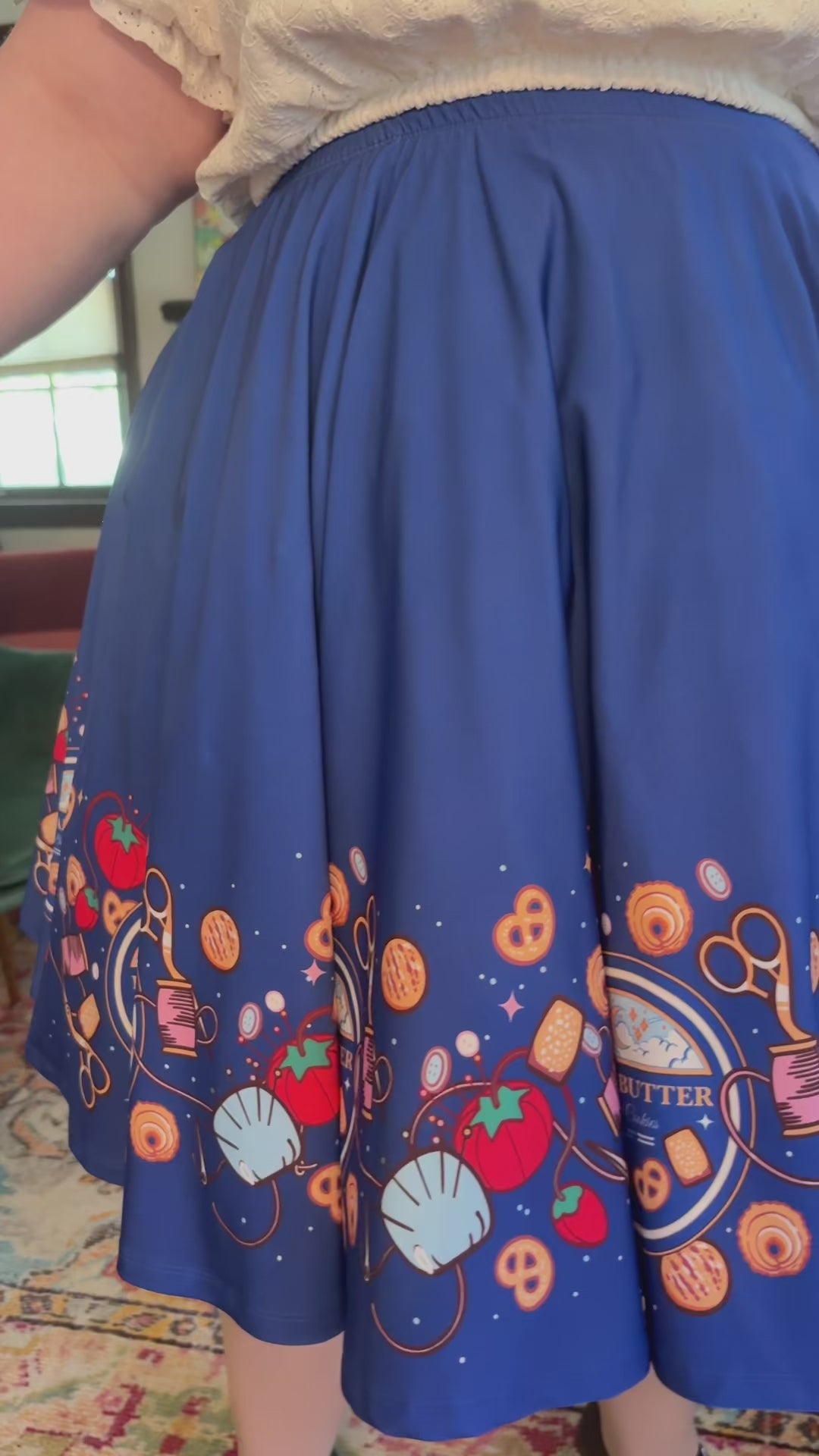 Stretchy circle skirt featuring Meyoco's Butter Cookies Sewing Tin design on a rich royal blue background. These skirts have pockets large enough to fit your phone, DS, Switch, hands, and maybe a small cat. Petticoat not included.