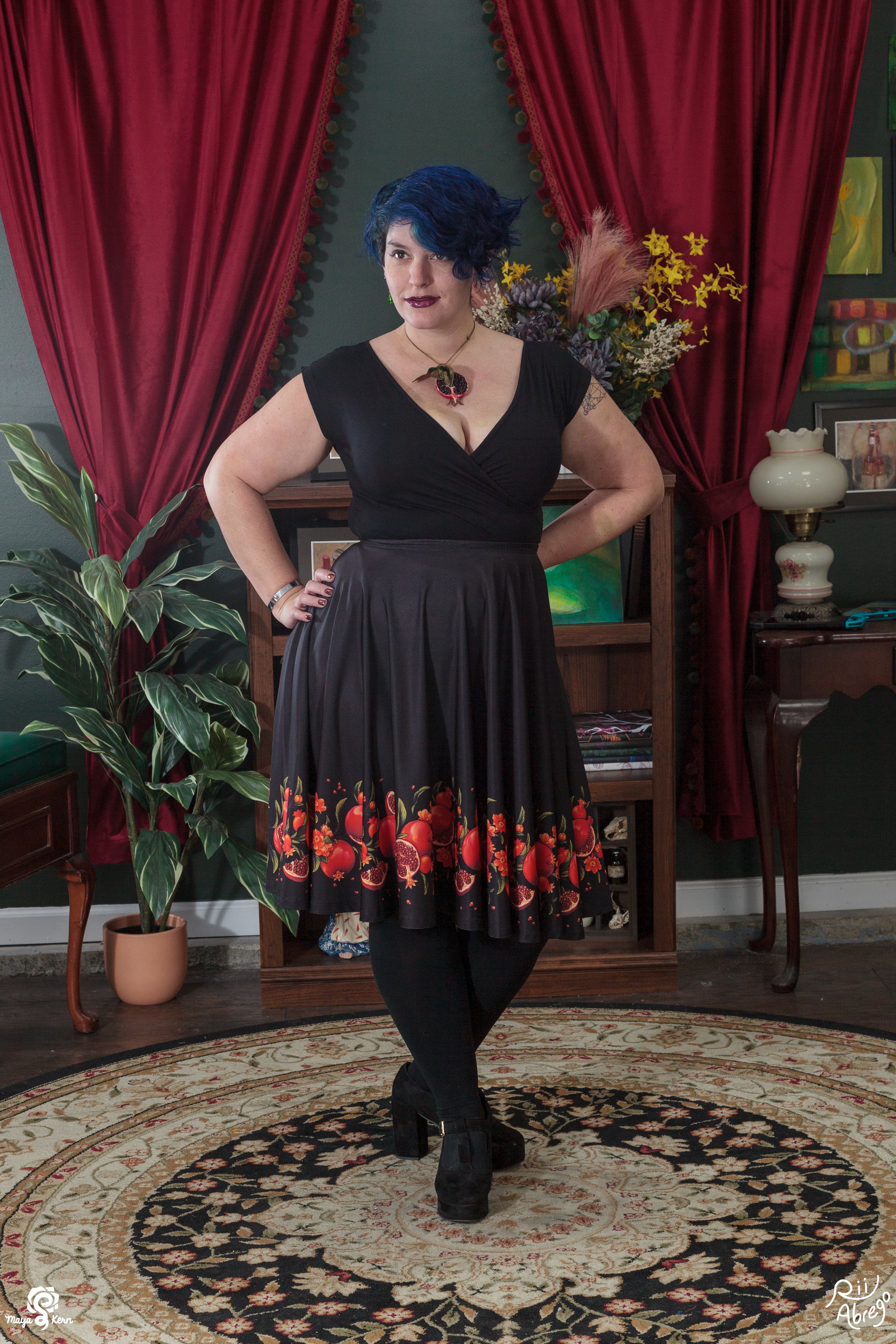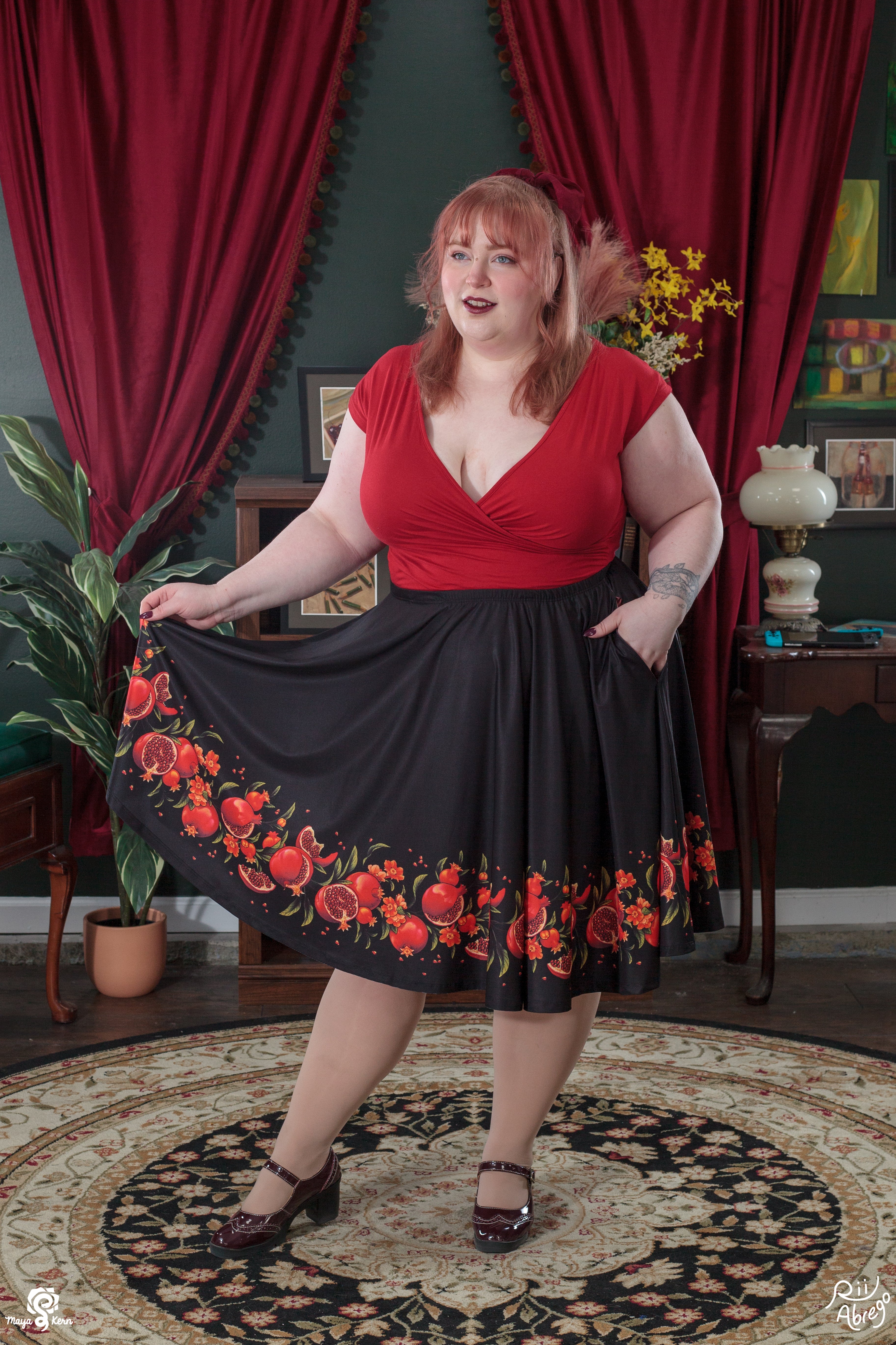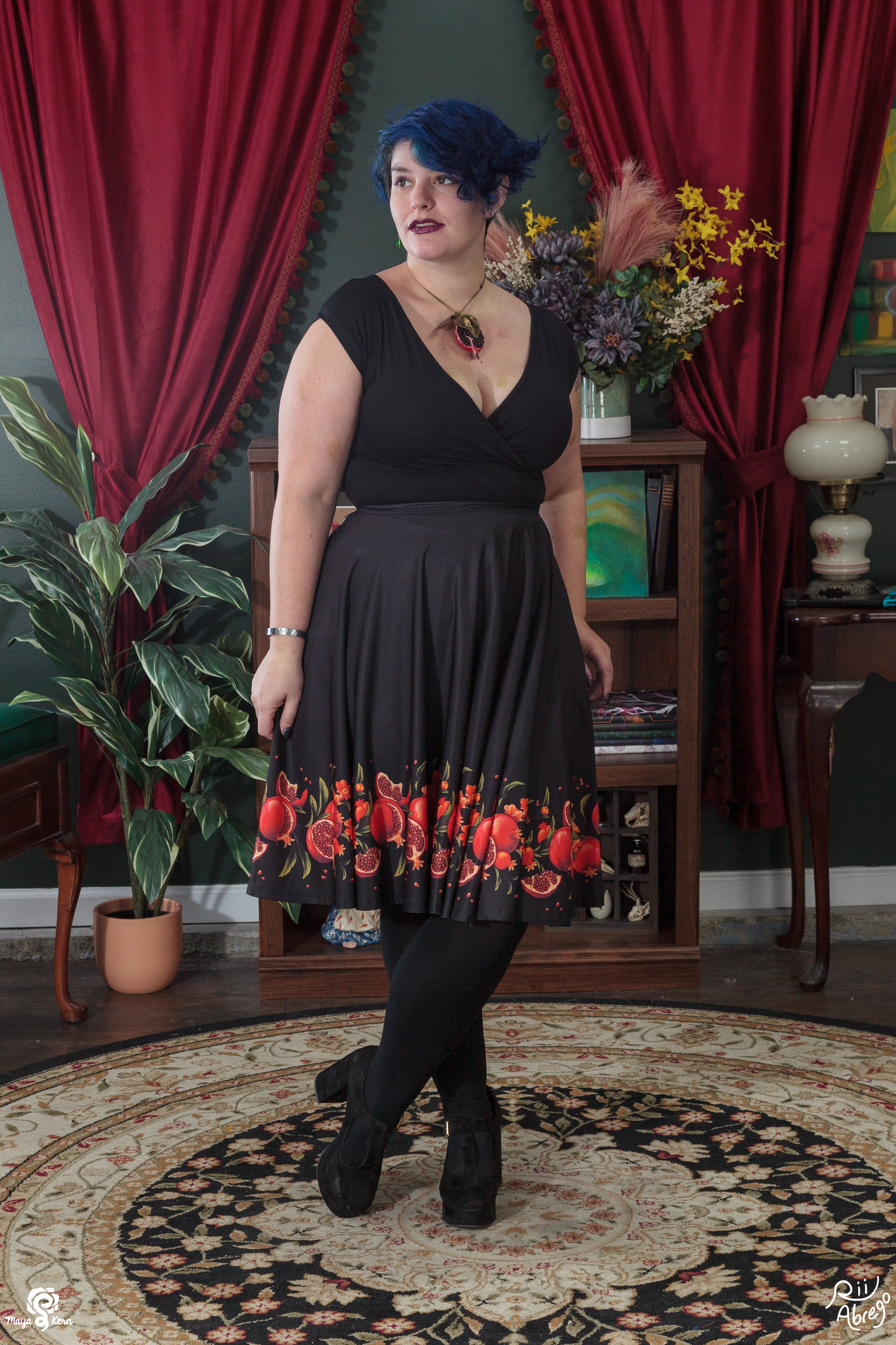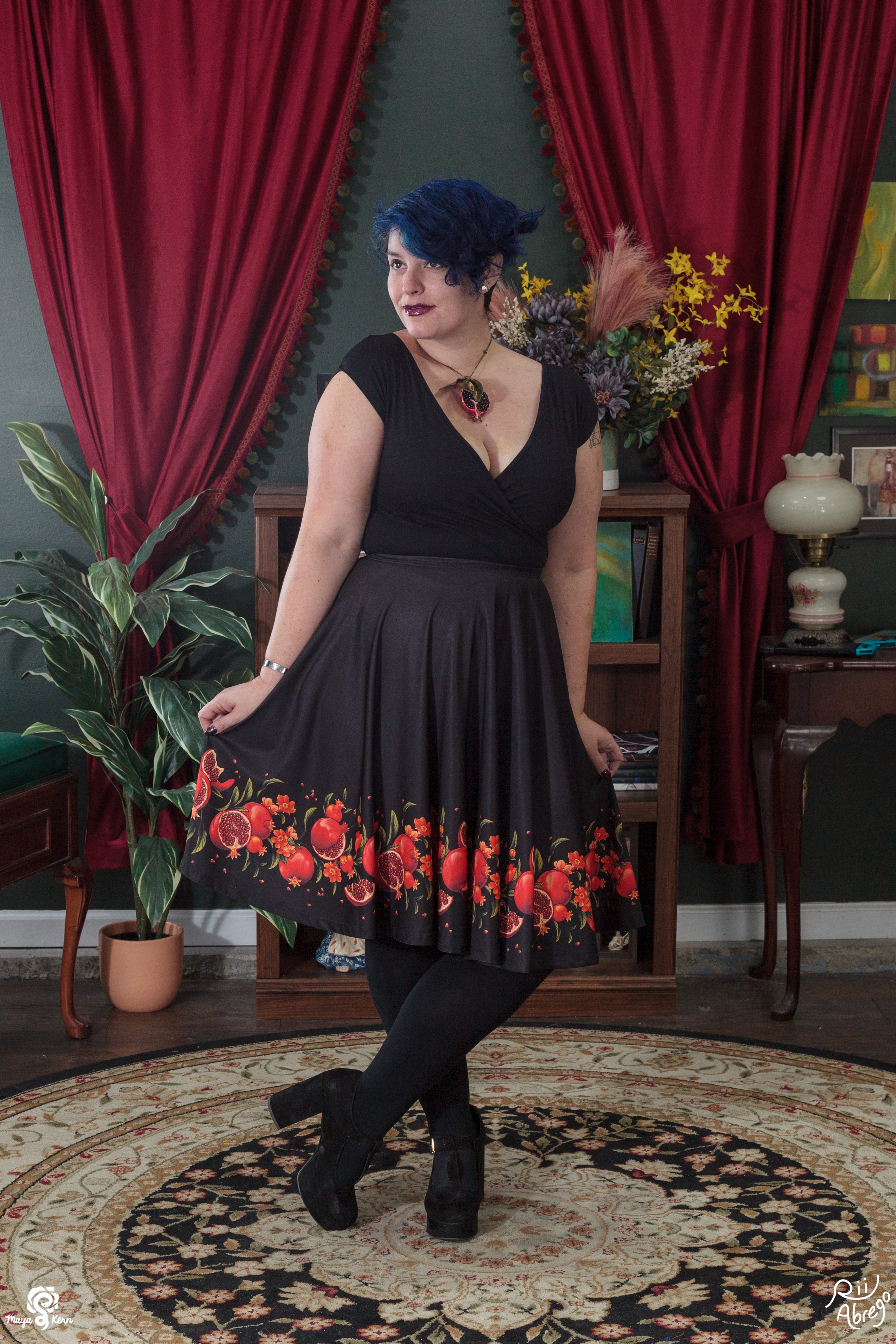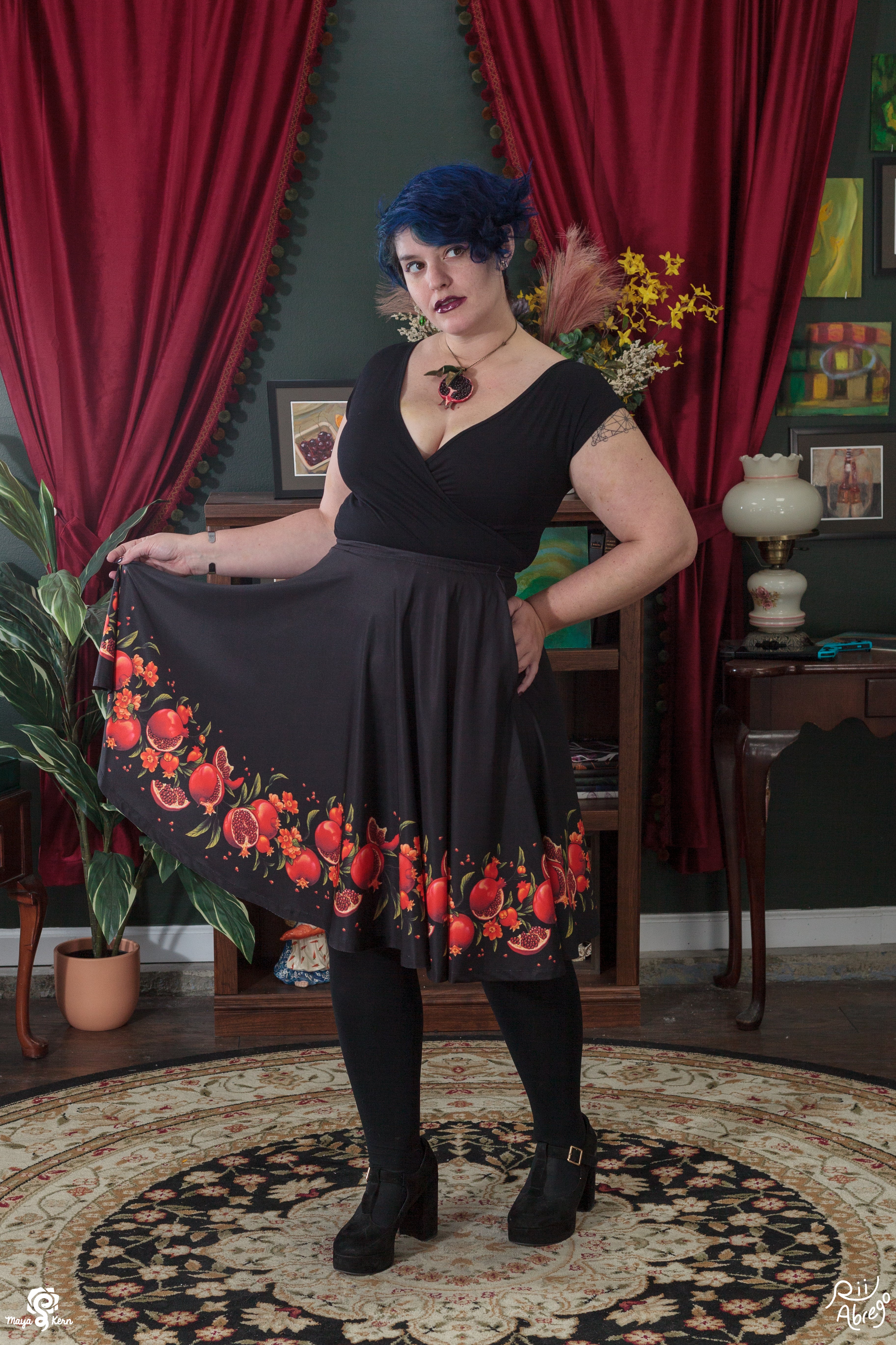 Stretchy circle skirt featuring Rii Abrego's Pomegranate design on a black background. These skirts have pockets large enough to fit your phone, DS, Switch, hands, and maybe a small cat. Petticoat not included.
