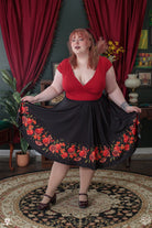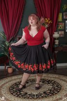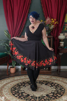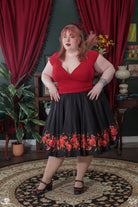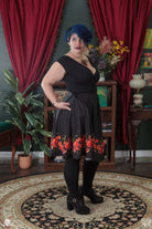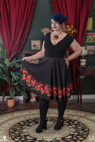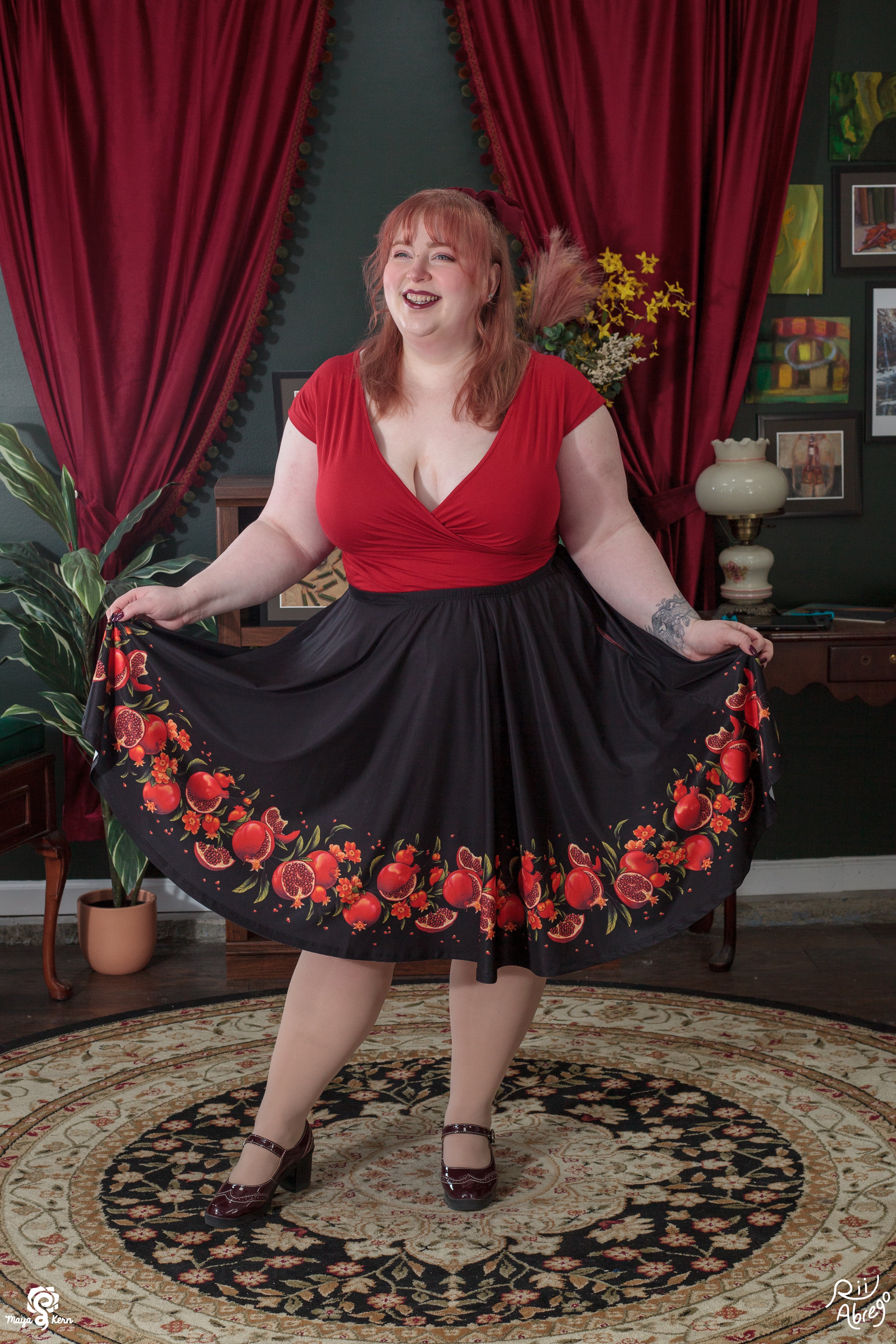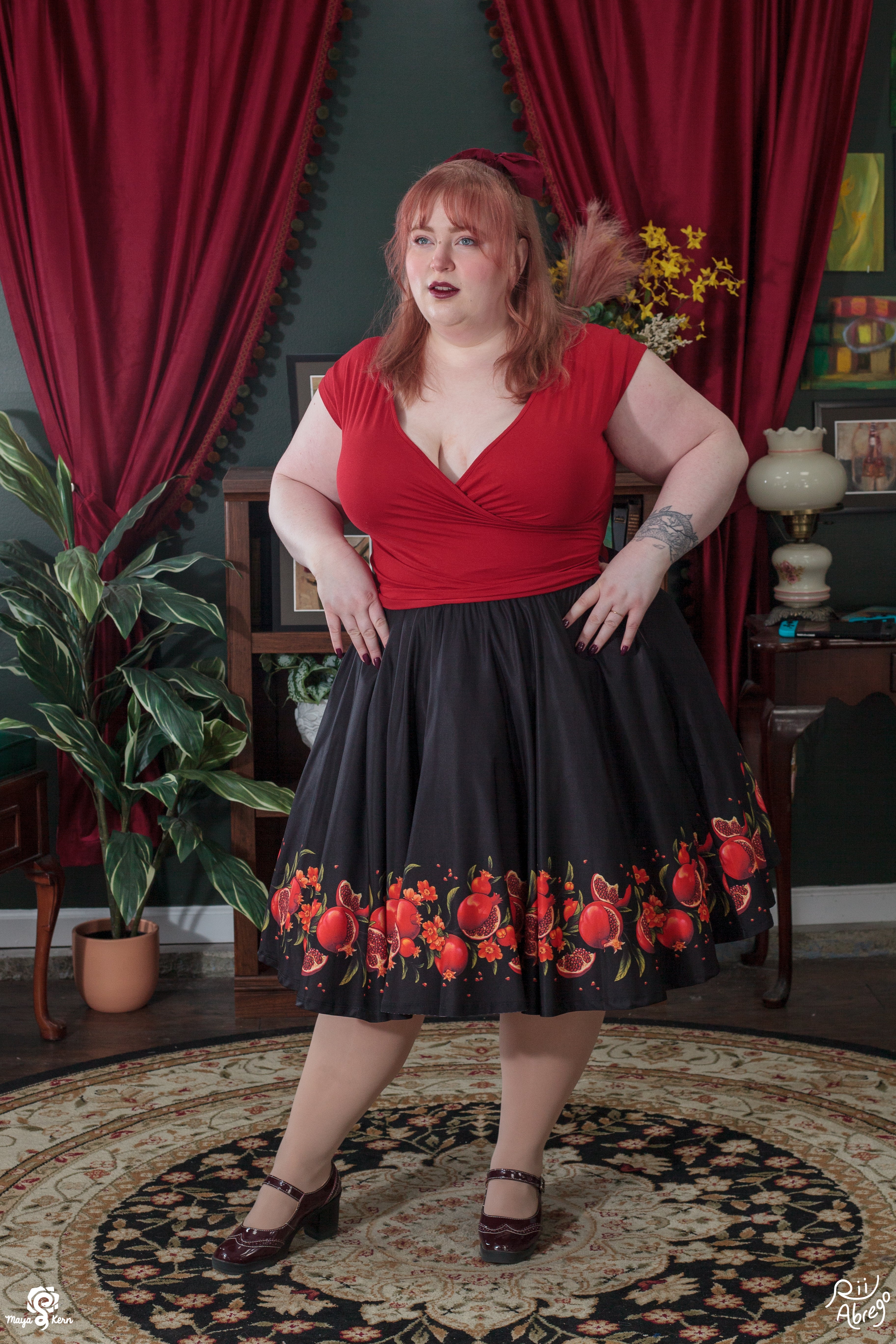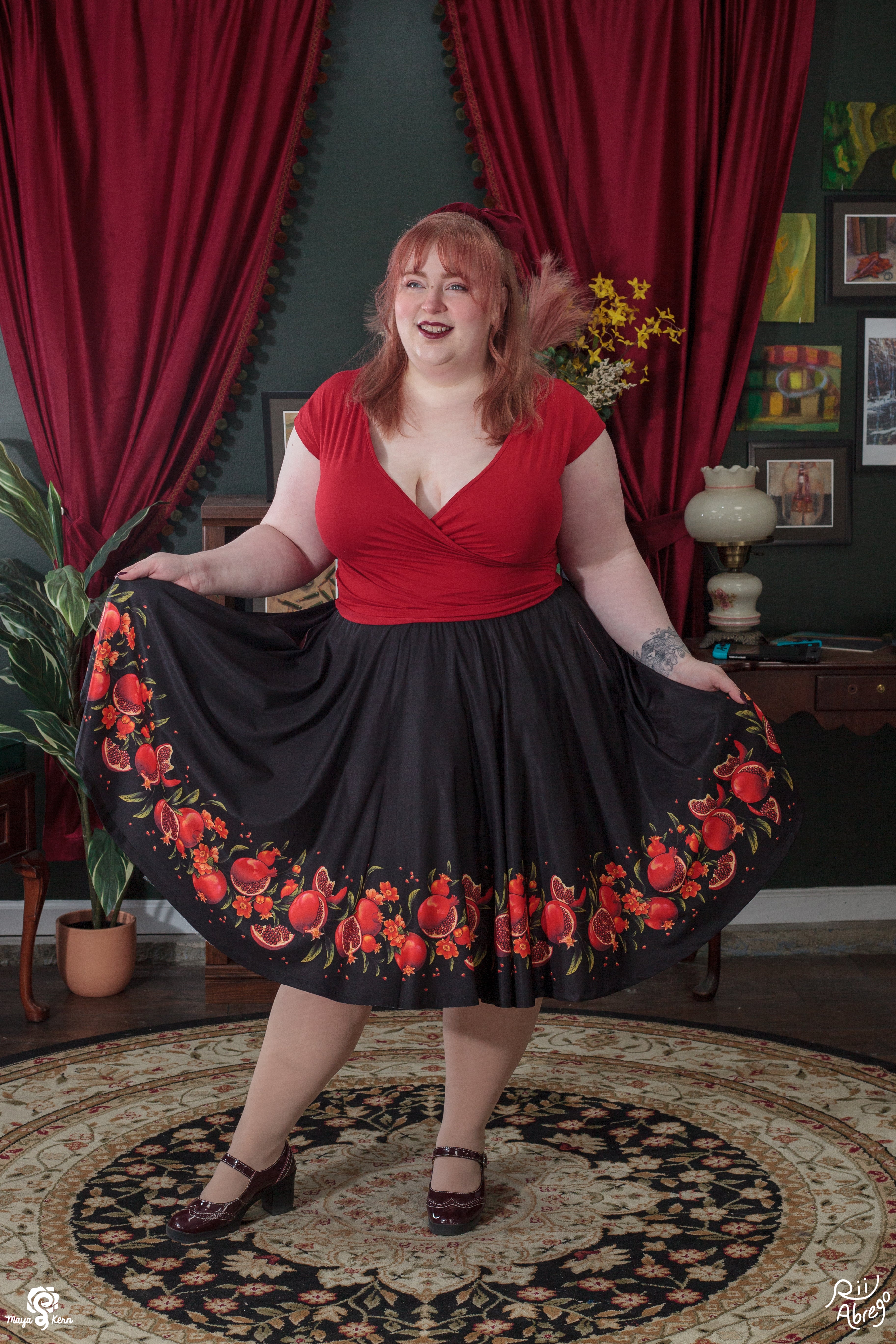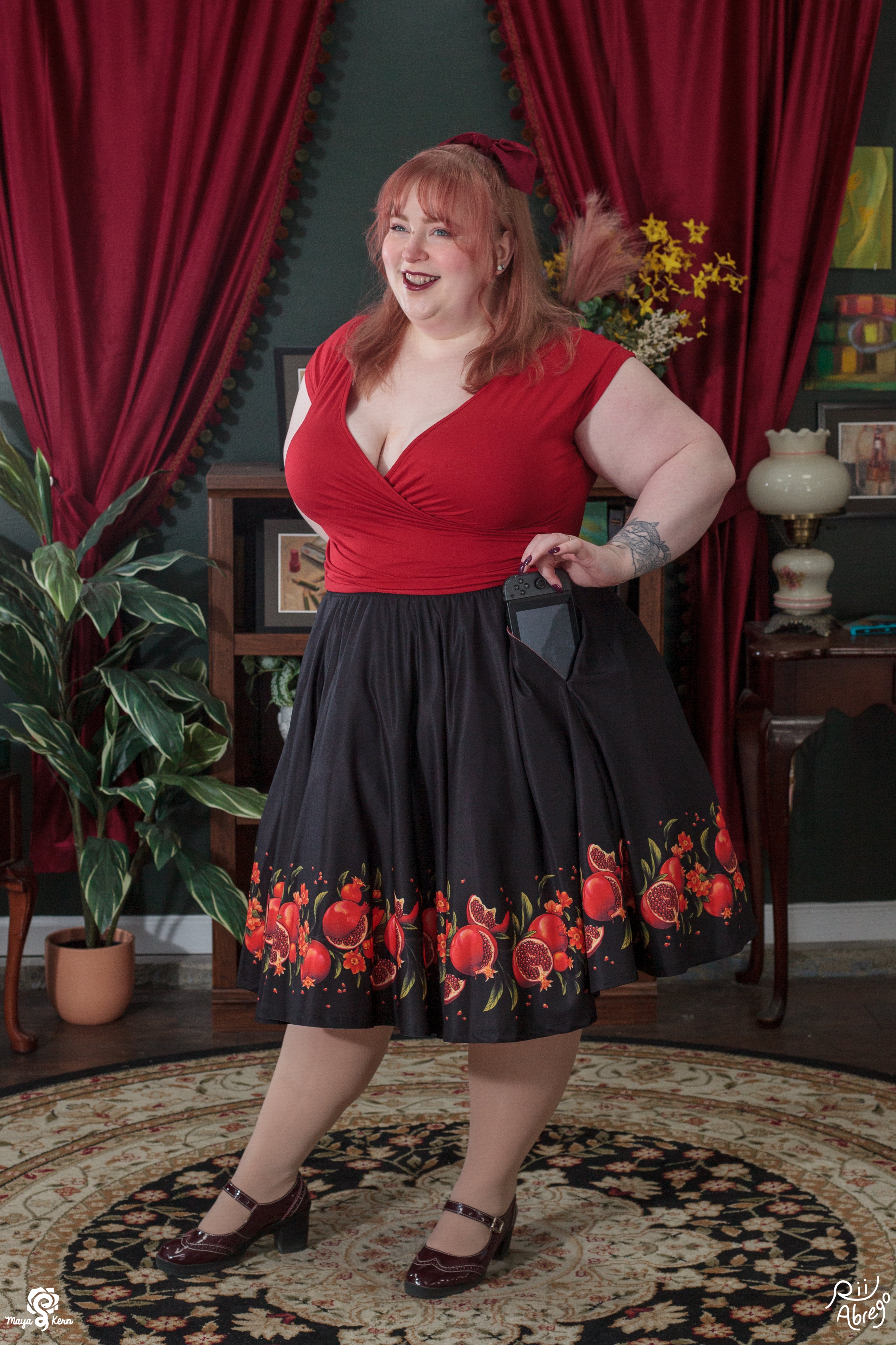 Stretchy circle skirt featuring Rii Abrego's Pomegranate design on a black background. These skirts have pockets large enough to fit your phone, DS, Switch, hands, and maybe a small cat. Petticoat not included.