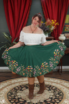Stretchy circle skirt featuring Rii Abrego's Wildflower on a green background. These skirts have pockets large enough to fit your phone, DS, Switch, hands, and maybe a small cat. Petticoat not included.