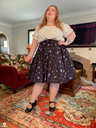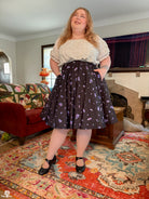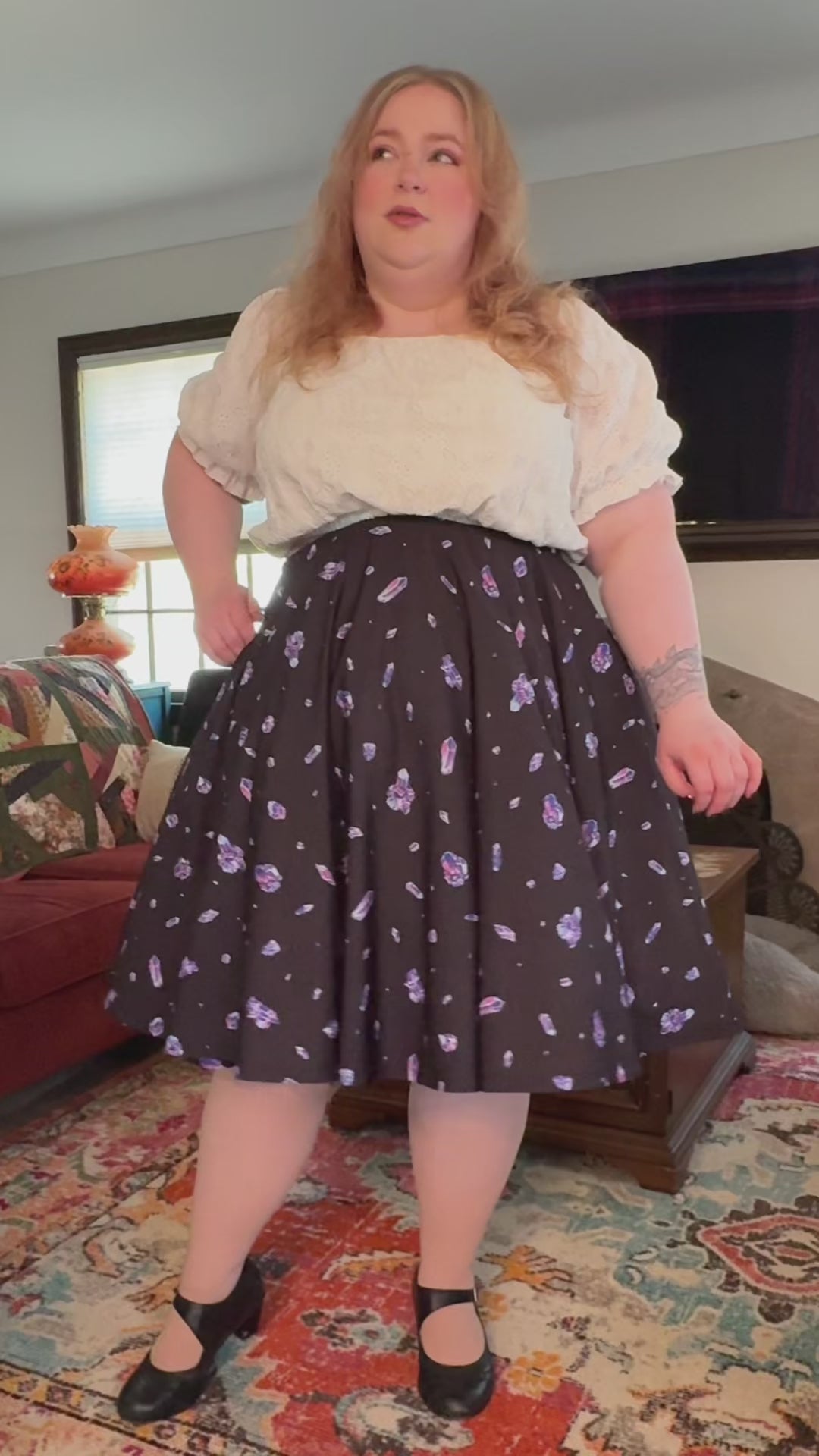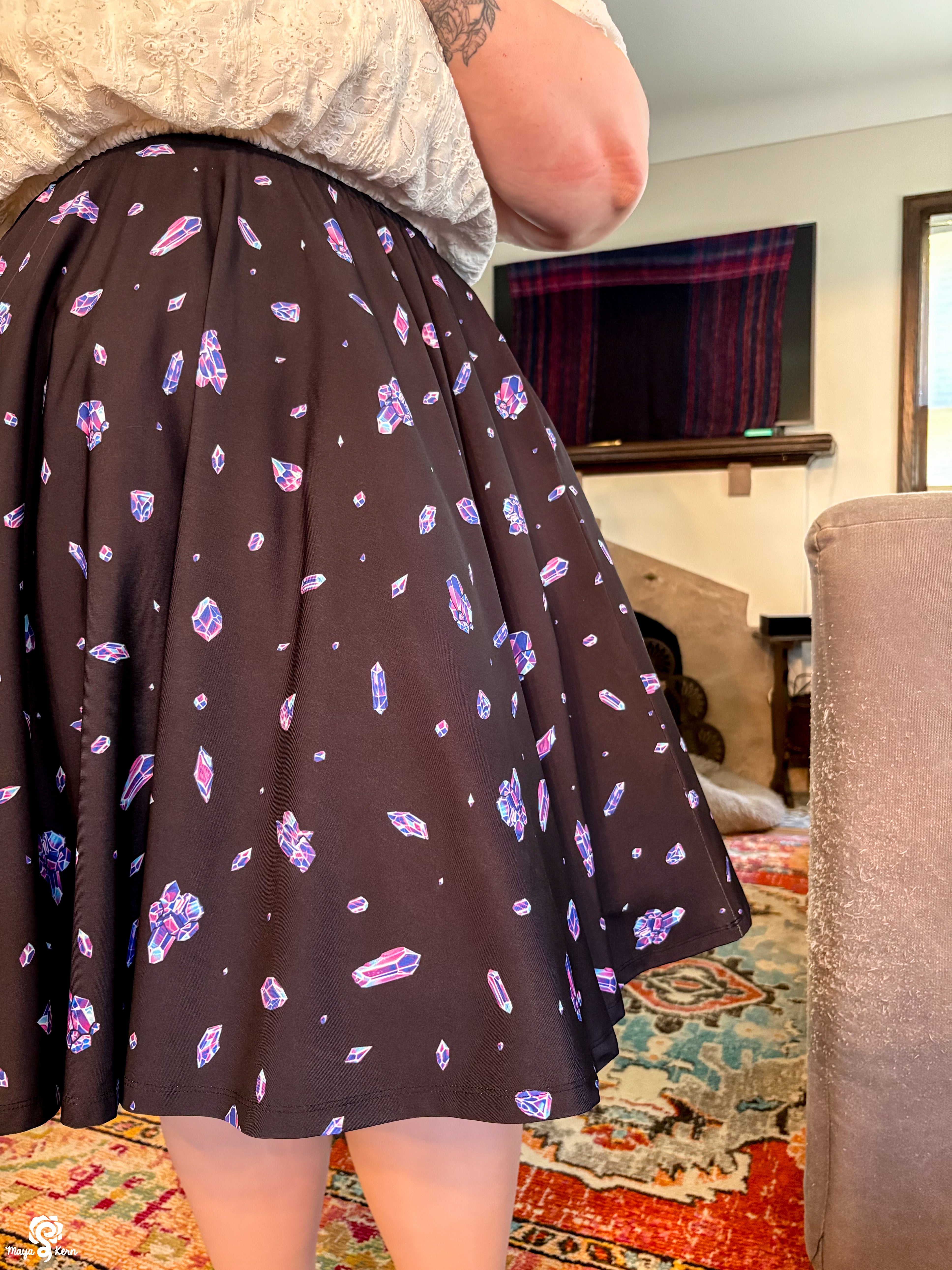 Stretchy circle skirt featuring my Gemstone design on a black background. These skirts have pockets large enough to fit your phone, DS, Switch, hands, and maybe a small cat. Petticoat not included.