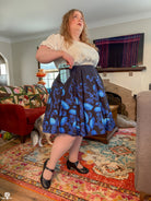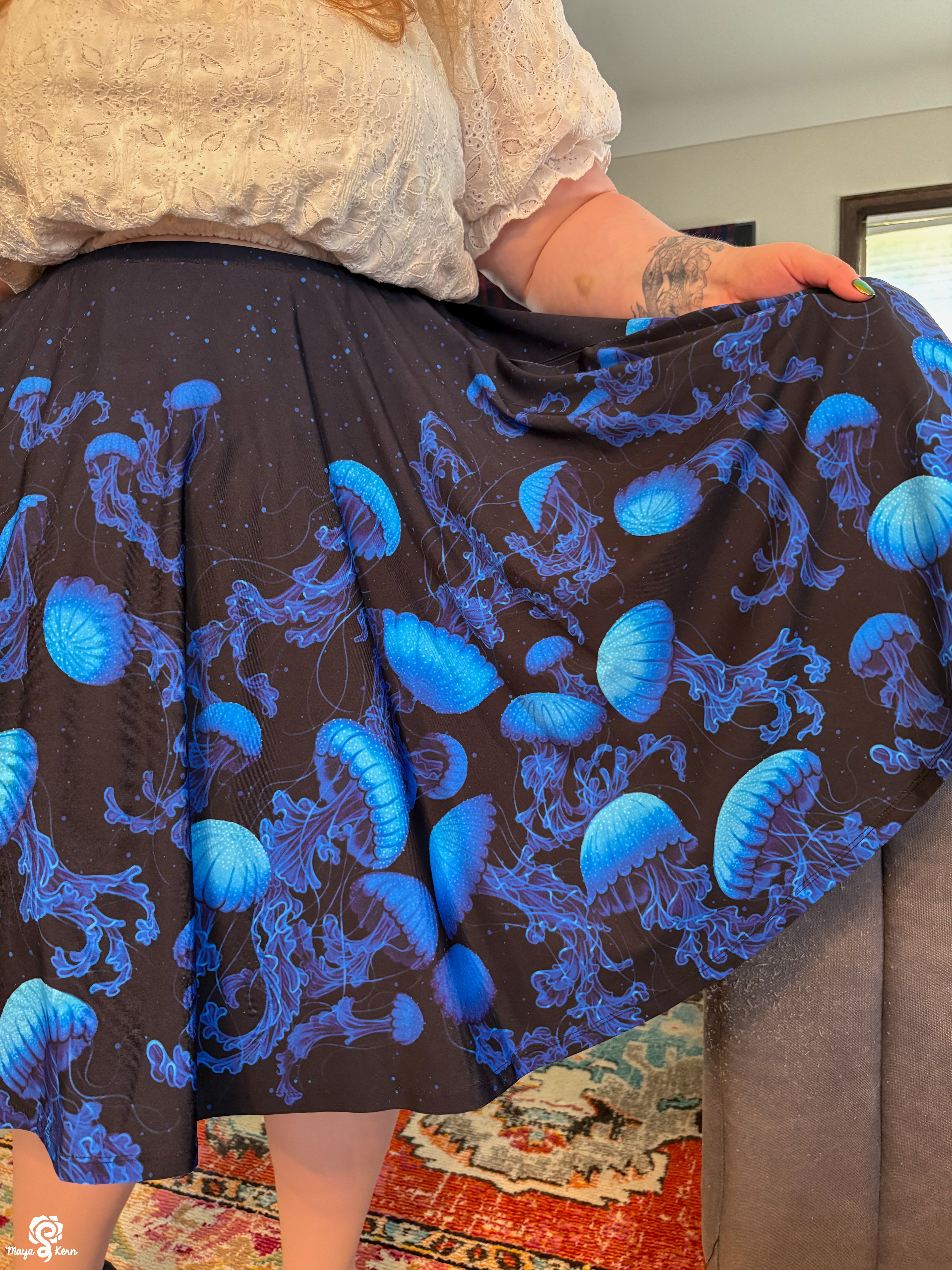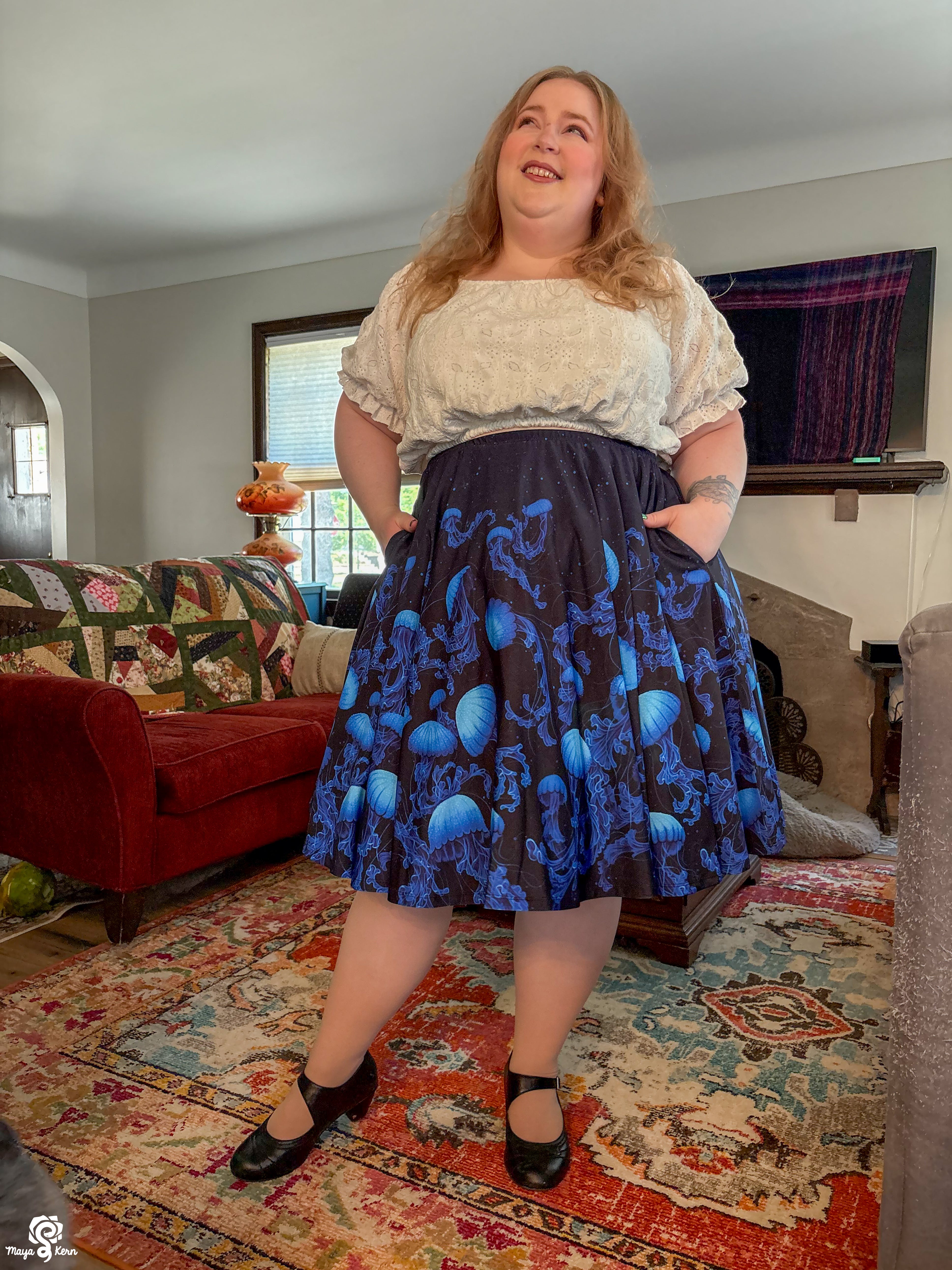 Stretchy circle skirt featuring my Jellyfish design on a dark blue background. These skirts have pockets large enough to fit your phone, DS, Switch, hands, and maybe a small cat. Petticoat not included.