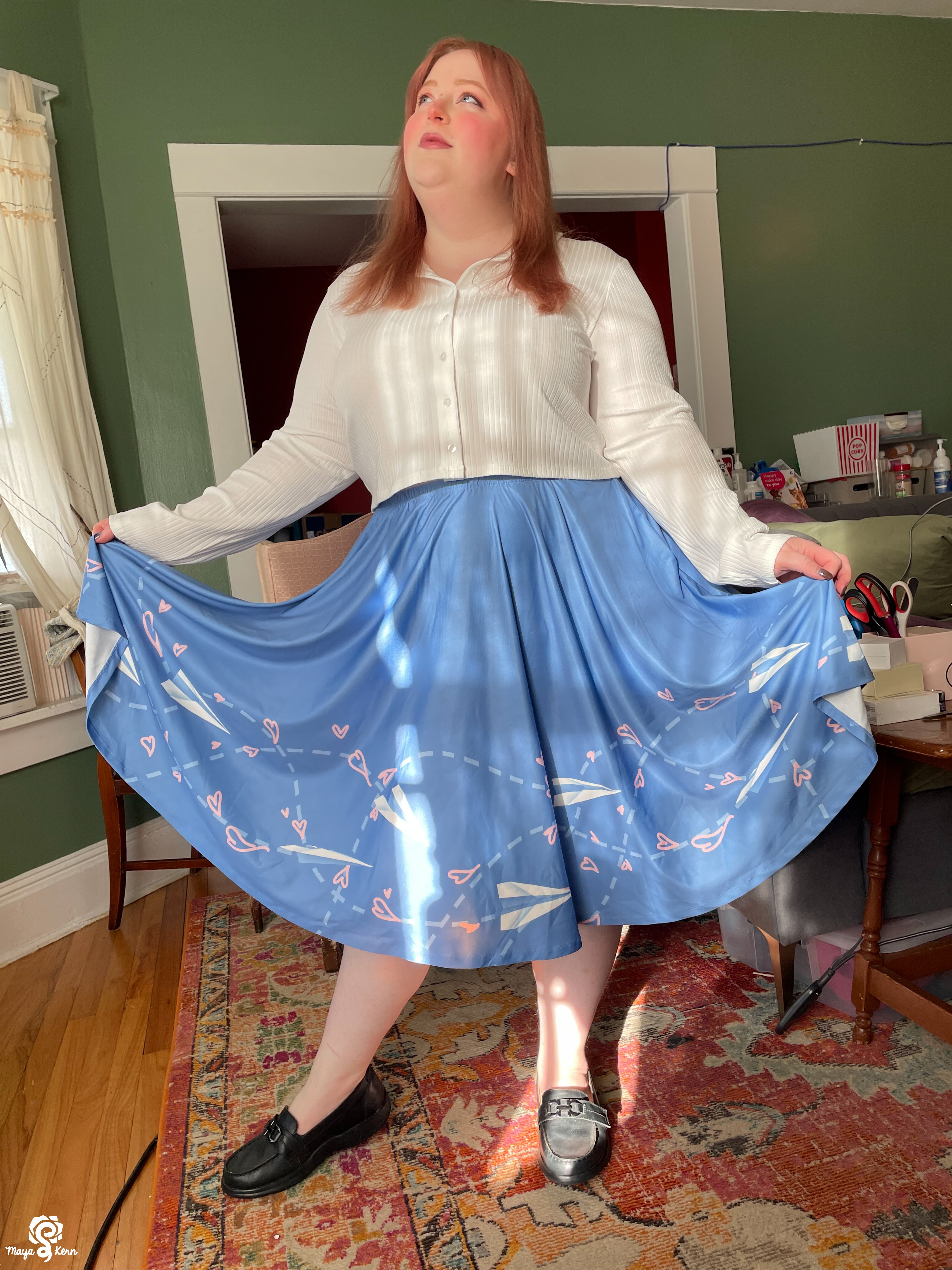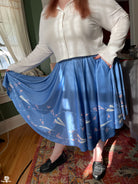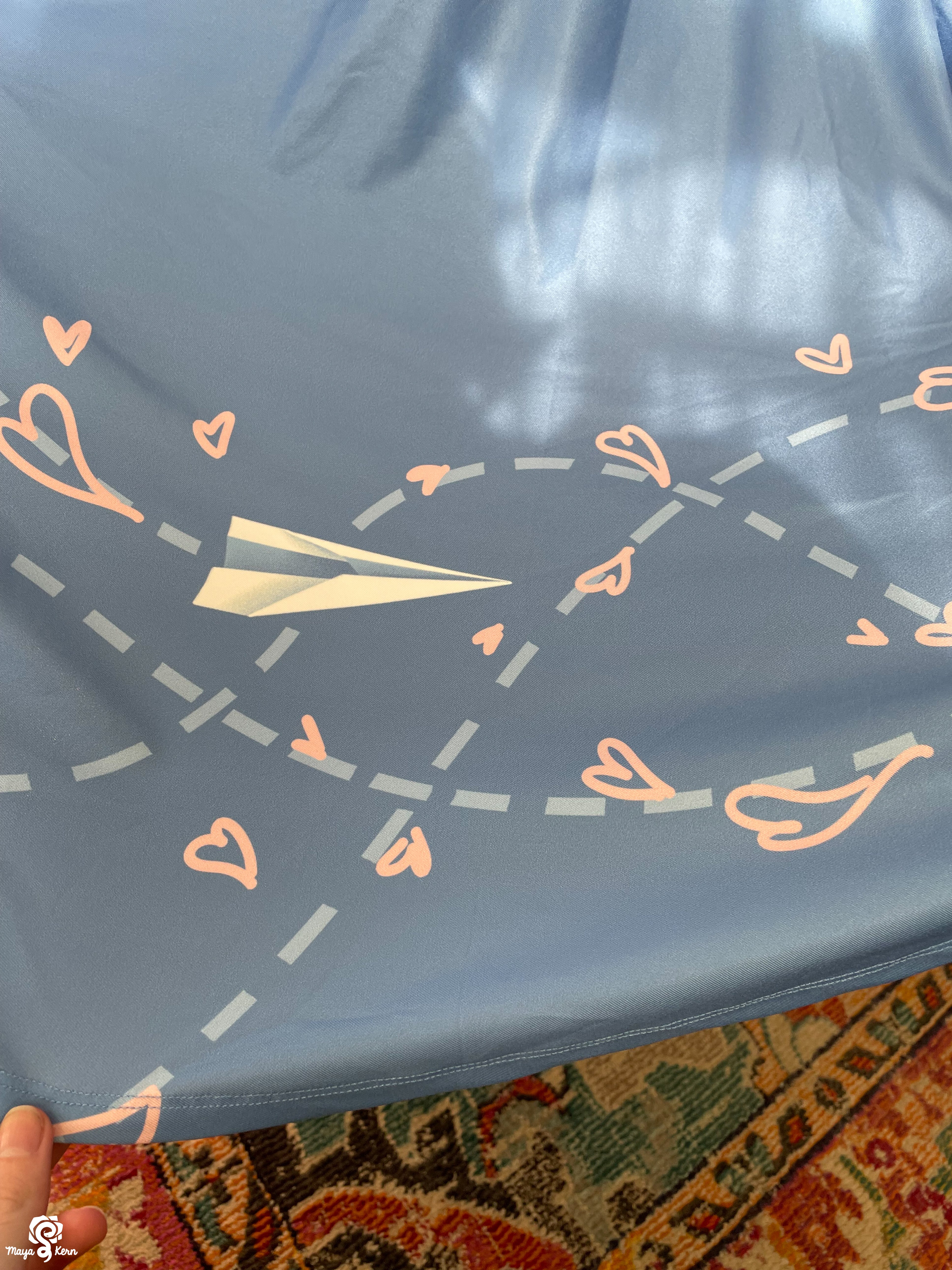 Stretchy circle skirt featuring my Paper Airplane design on a soft cornflower blue background. These skirts have pockets large enough to fit your phone, DS, Switch, hands, and maybe a small cat. Petticoat not included.