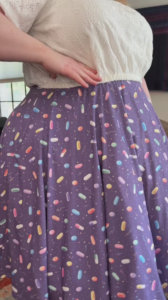 Stretchy circle skirt featuring my Pills design on a heather purple background. These skirts have pockets large enough to fit your phone, DS, Switch, hands, and maybe a small cat. Petticoat not included.