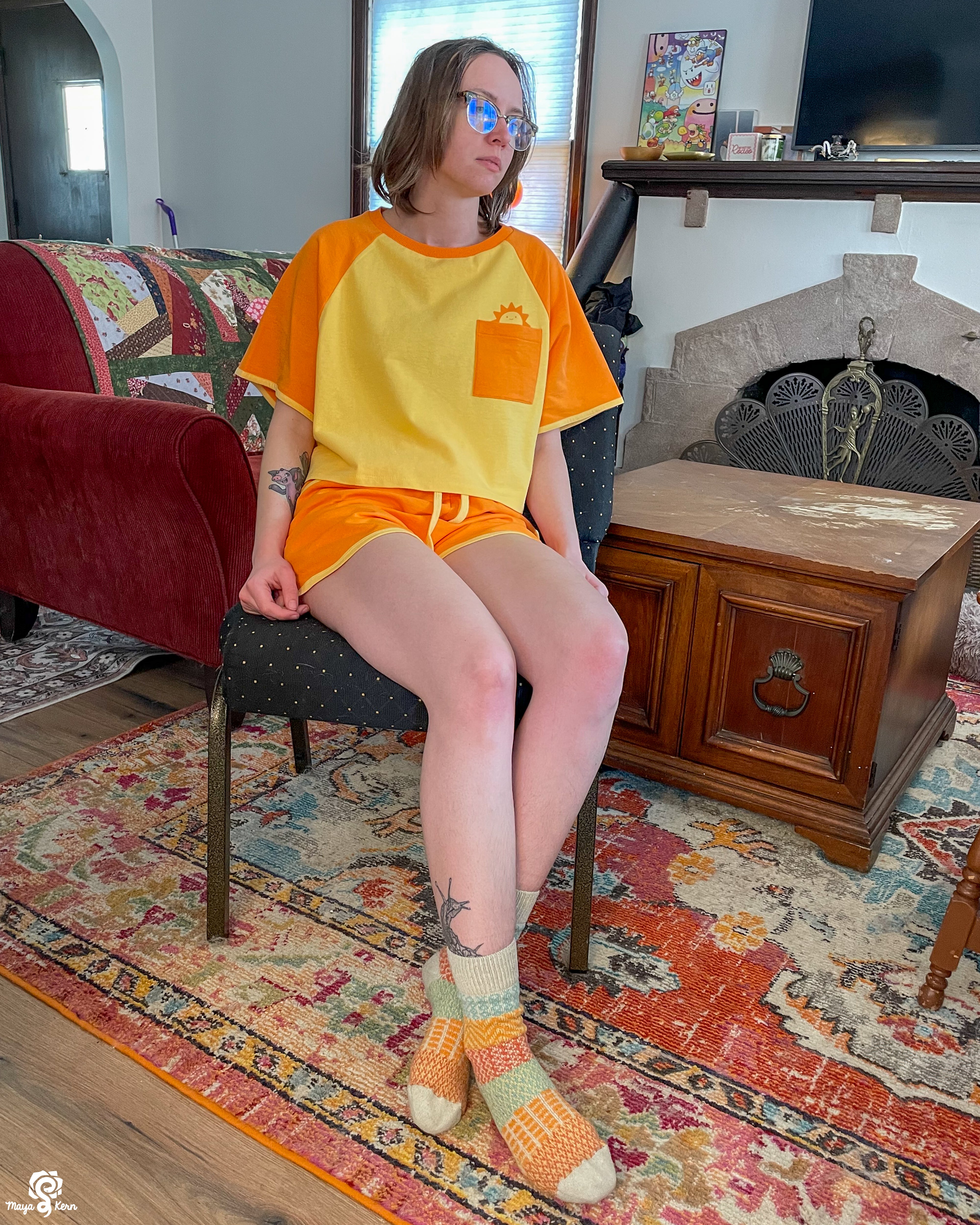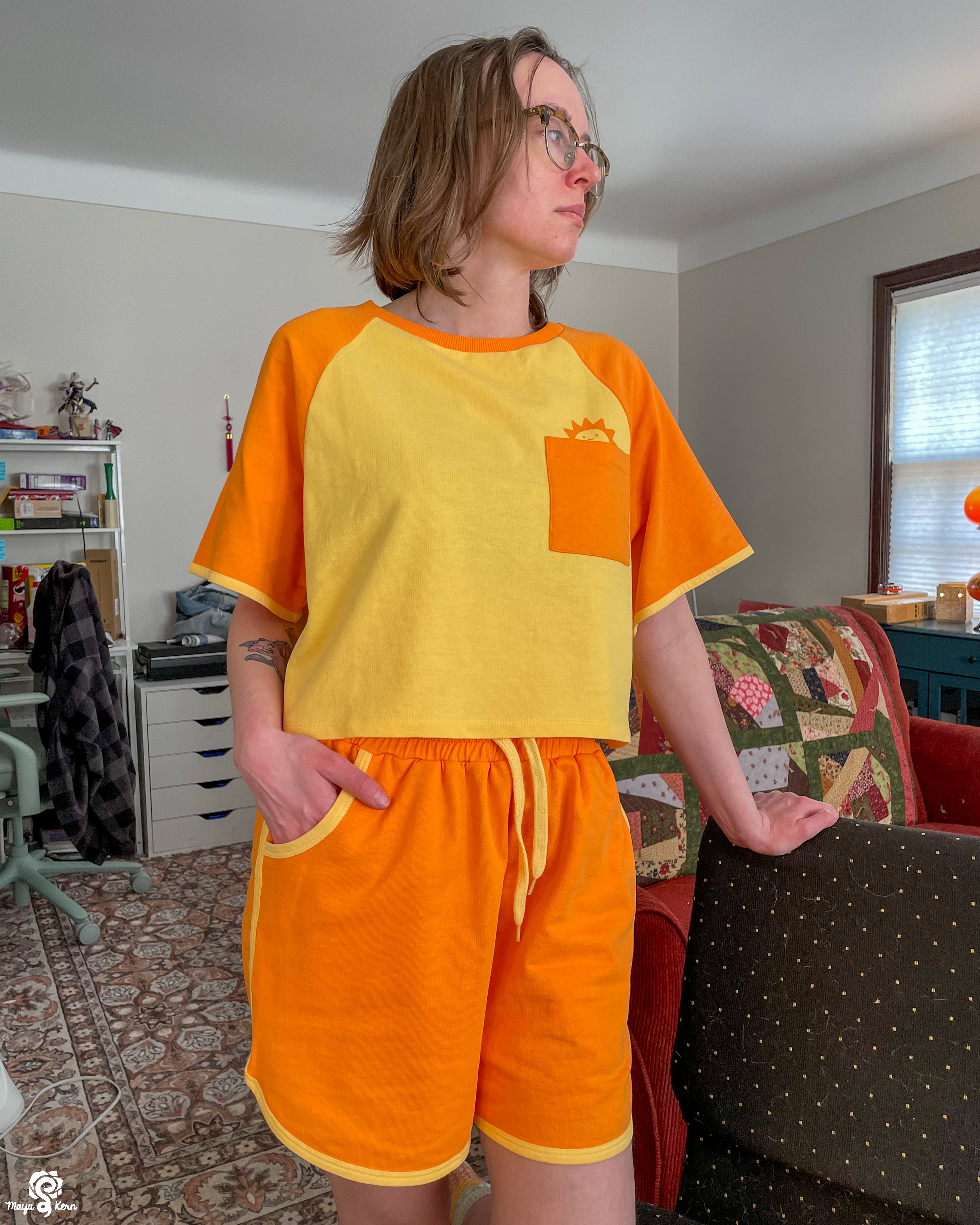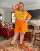 These shorts are a vibrant, sunny orange with buttery yellow piping.