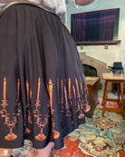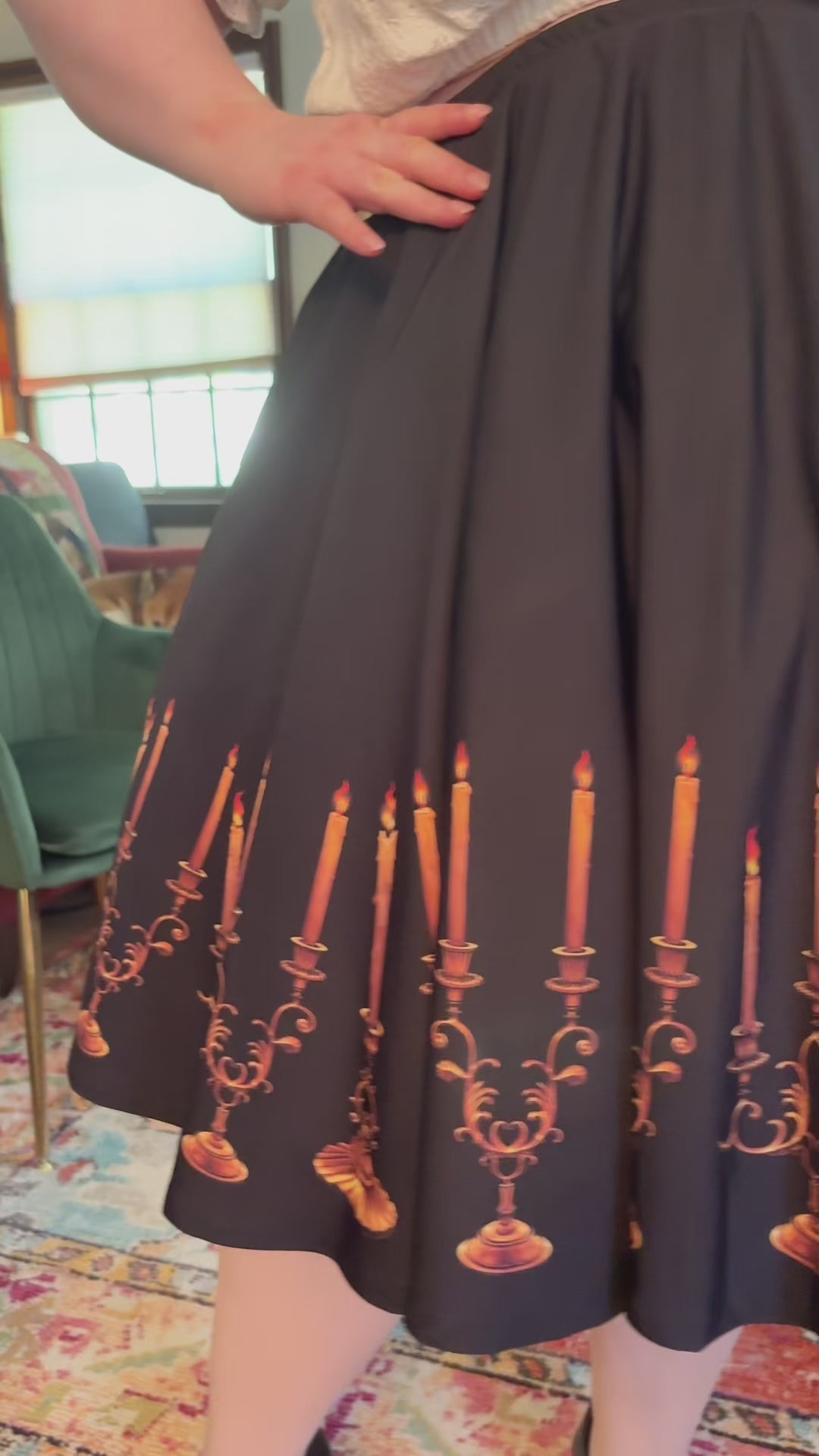 Stretchy circle skirt featuring my candelabra design on a black background. These skirts have pockets large enough to fit your phone, DS, Switch, hands, and maybe a small cat.  Petticoat not included.