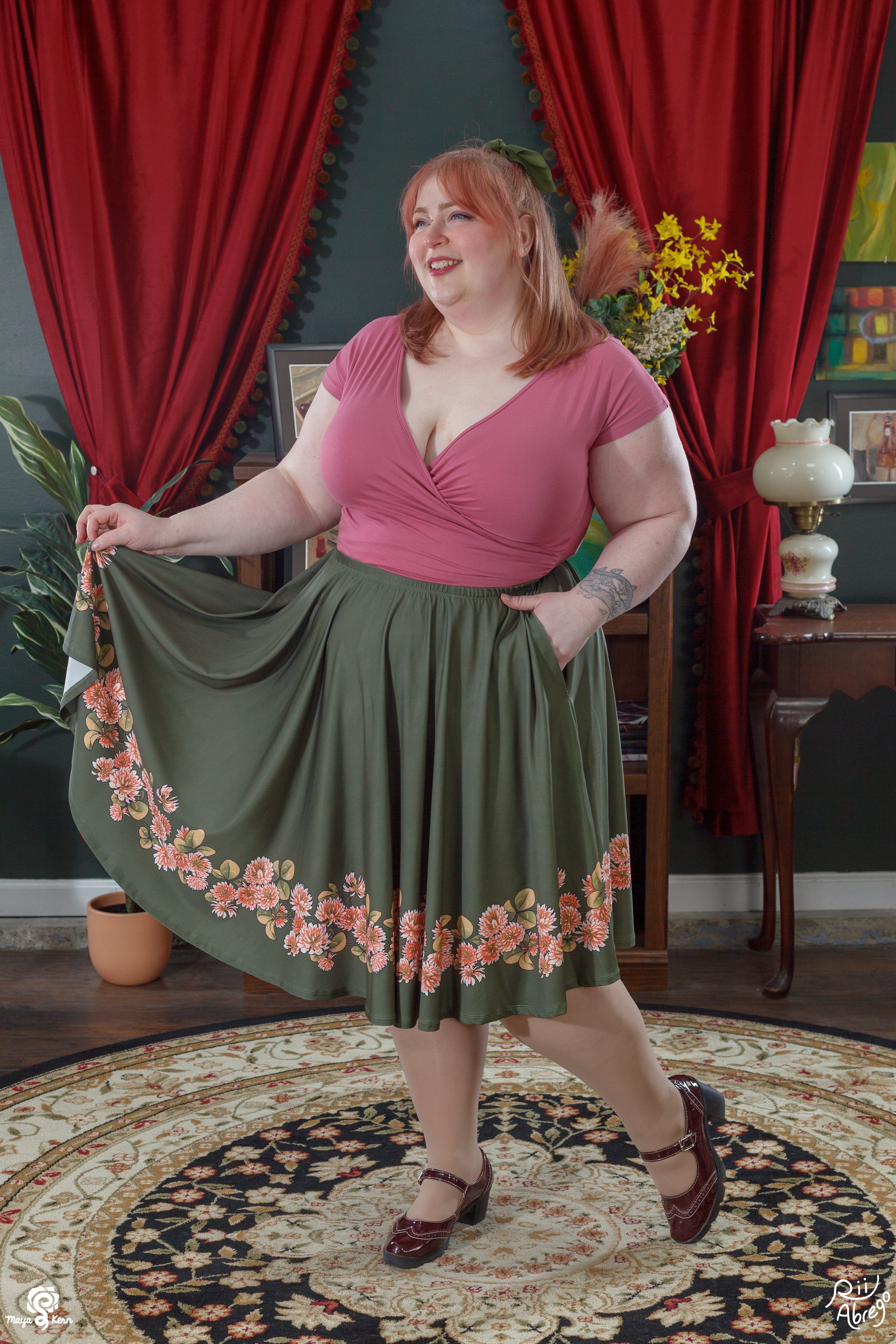 Stretchy circle skirt featuring Rii Abrego's Clover design on a fern green background. These skirts have pockets large enough to fit your phone, DS, Switch, hands, and maybe a small cat. Petticoat not included.