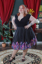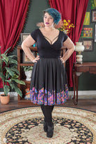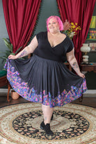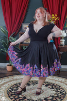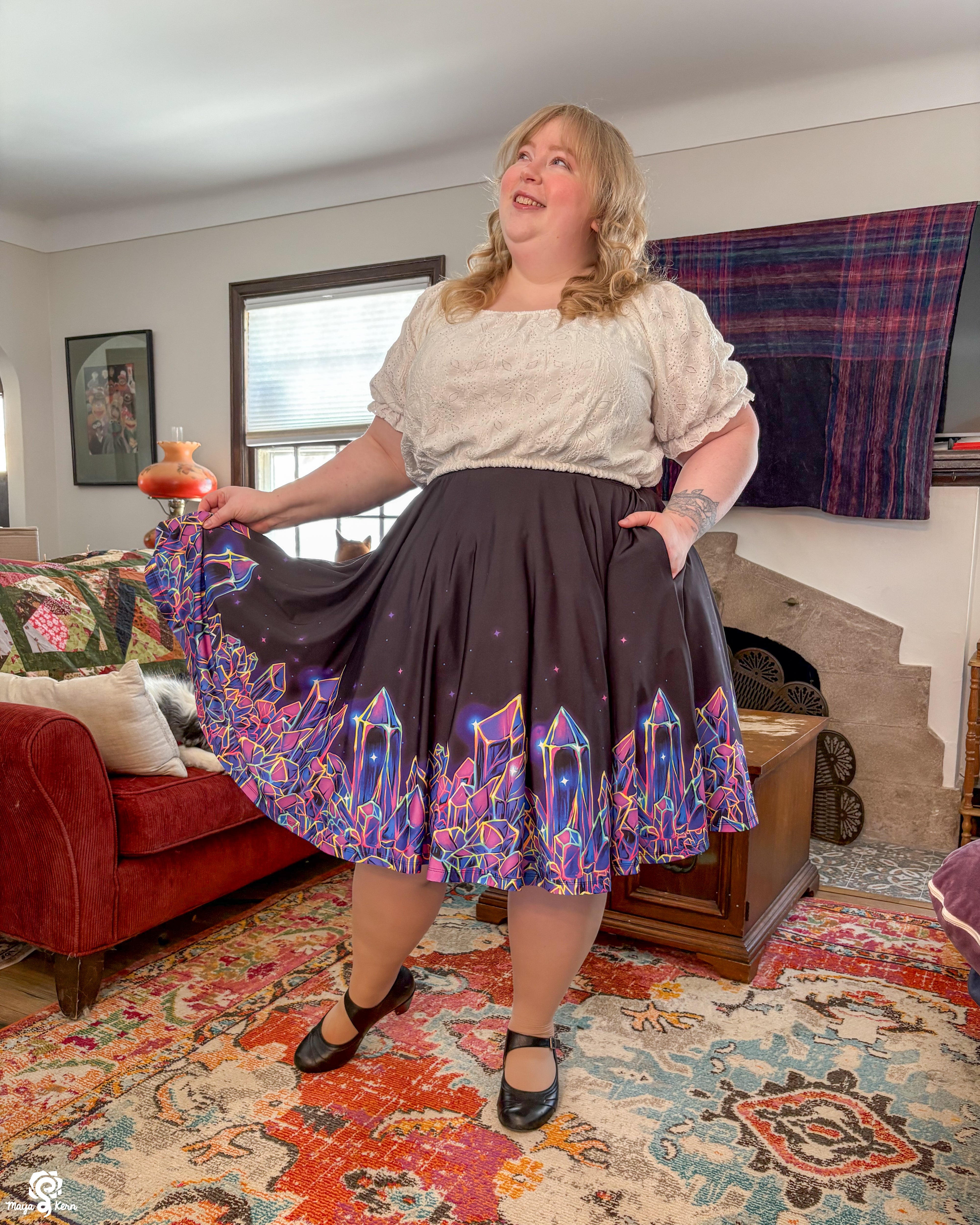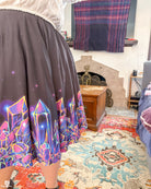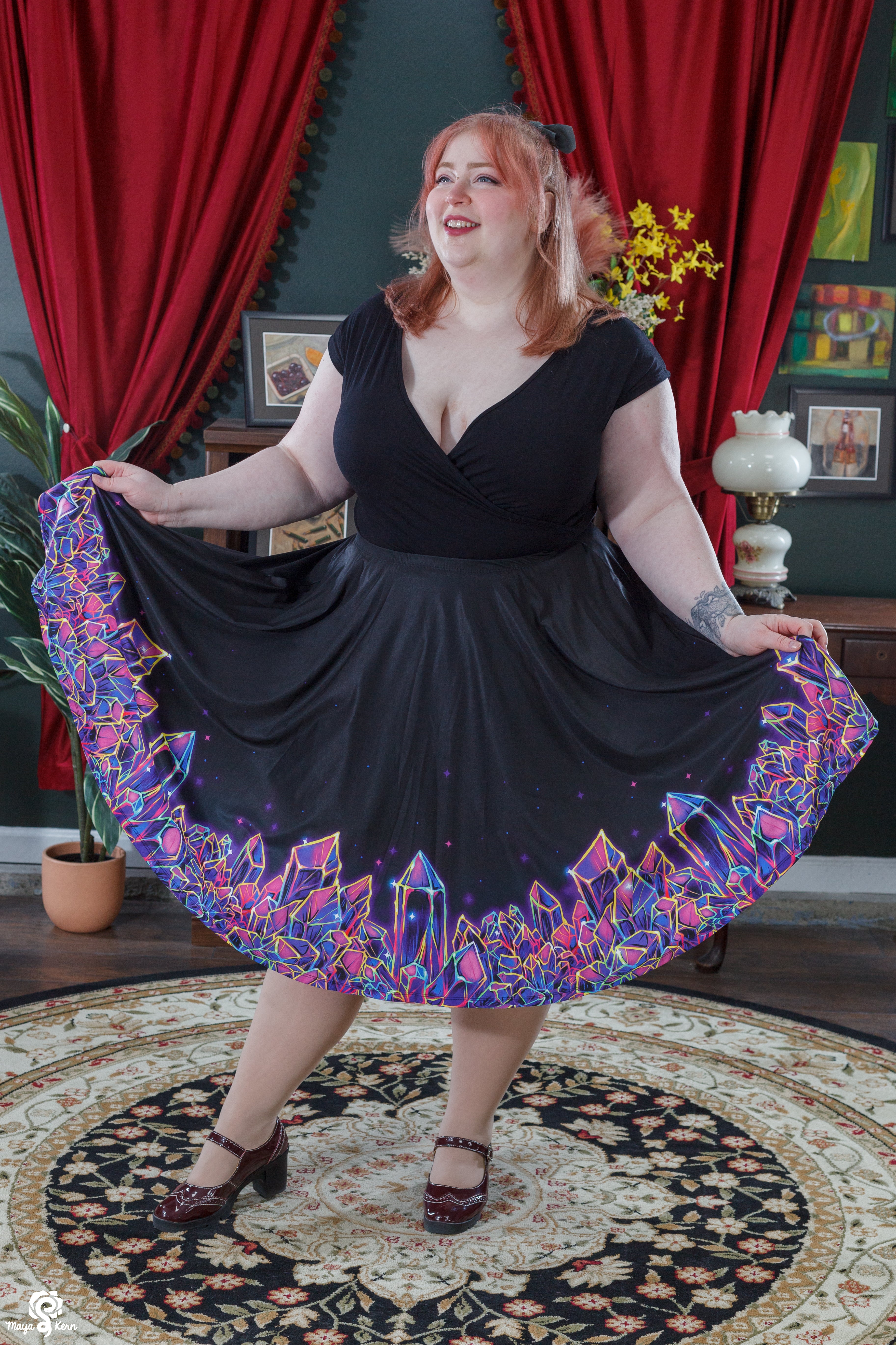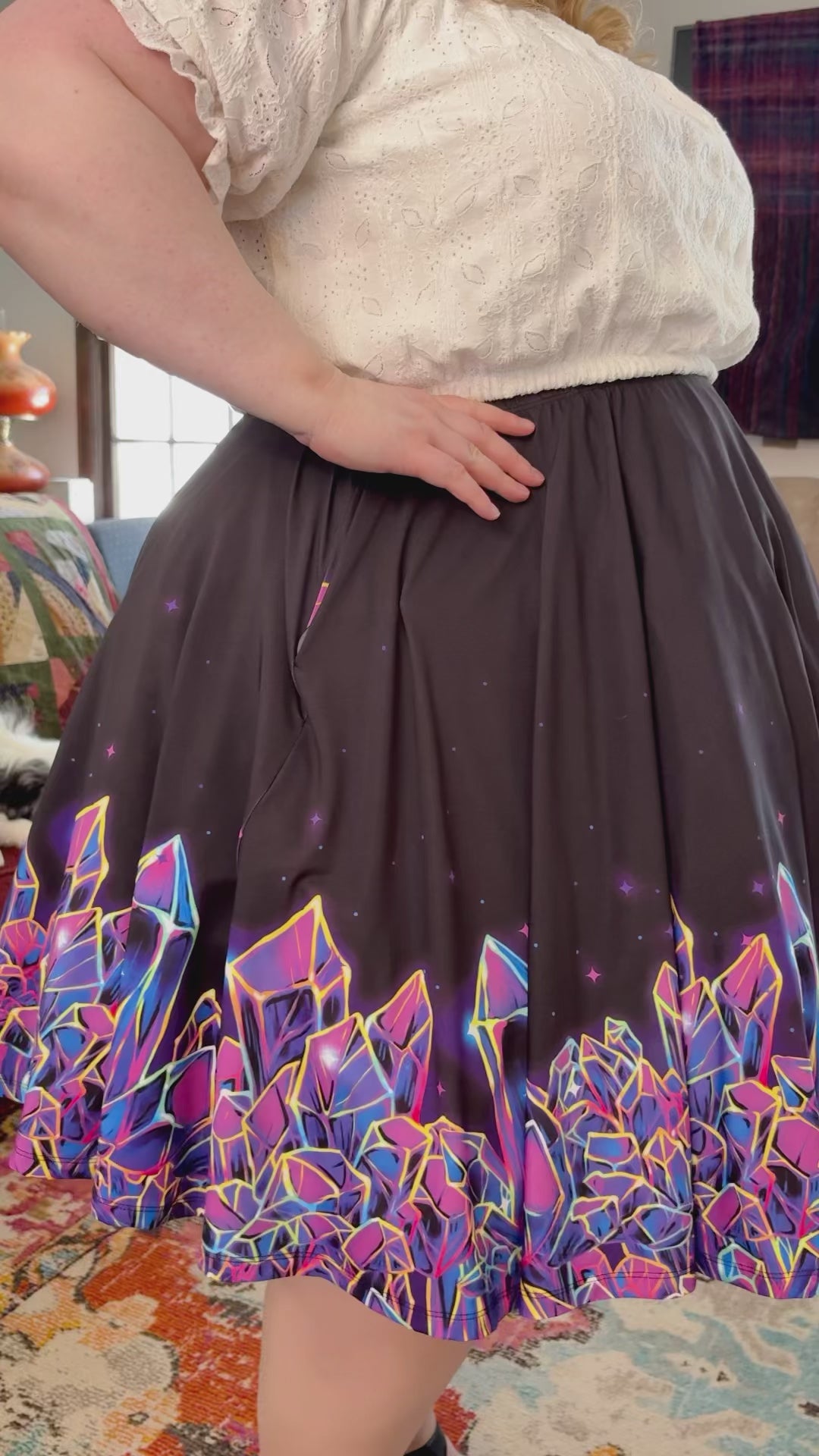 Stretchy circle skirt featuring my Crystal Cluster design on a black background. These skirts have pockets large enough to fit your phone, DS, Switch, hands, and maybe a small cat. Petticoat not included.
