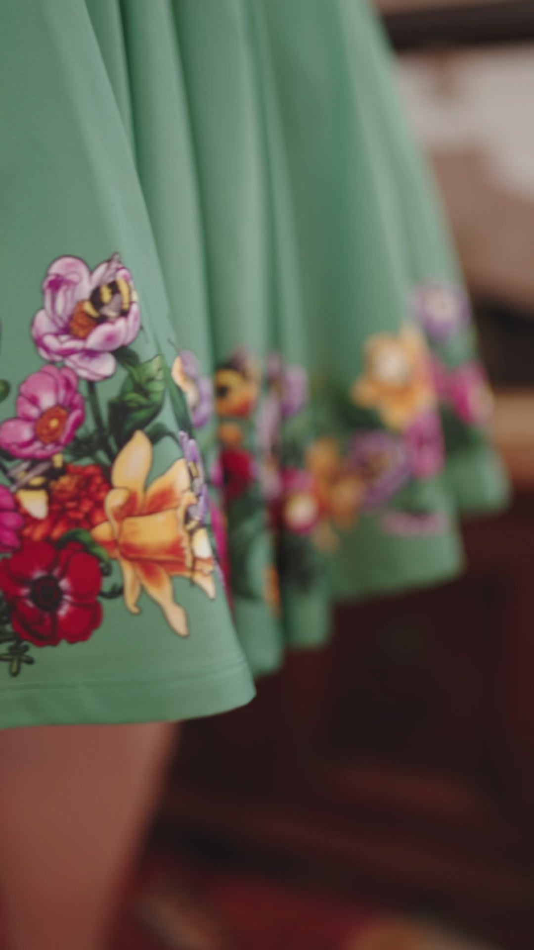 Stretchy circle skirt featuring my Sleepy Bees design on a spring fern green background. These skirts have pockets large enough to fit your phone, DS, Switch, hands, and maybe a small cat. Petticoat not included.