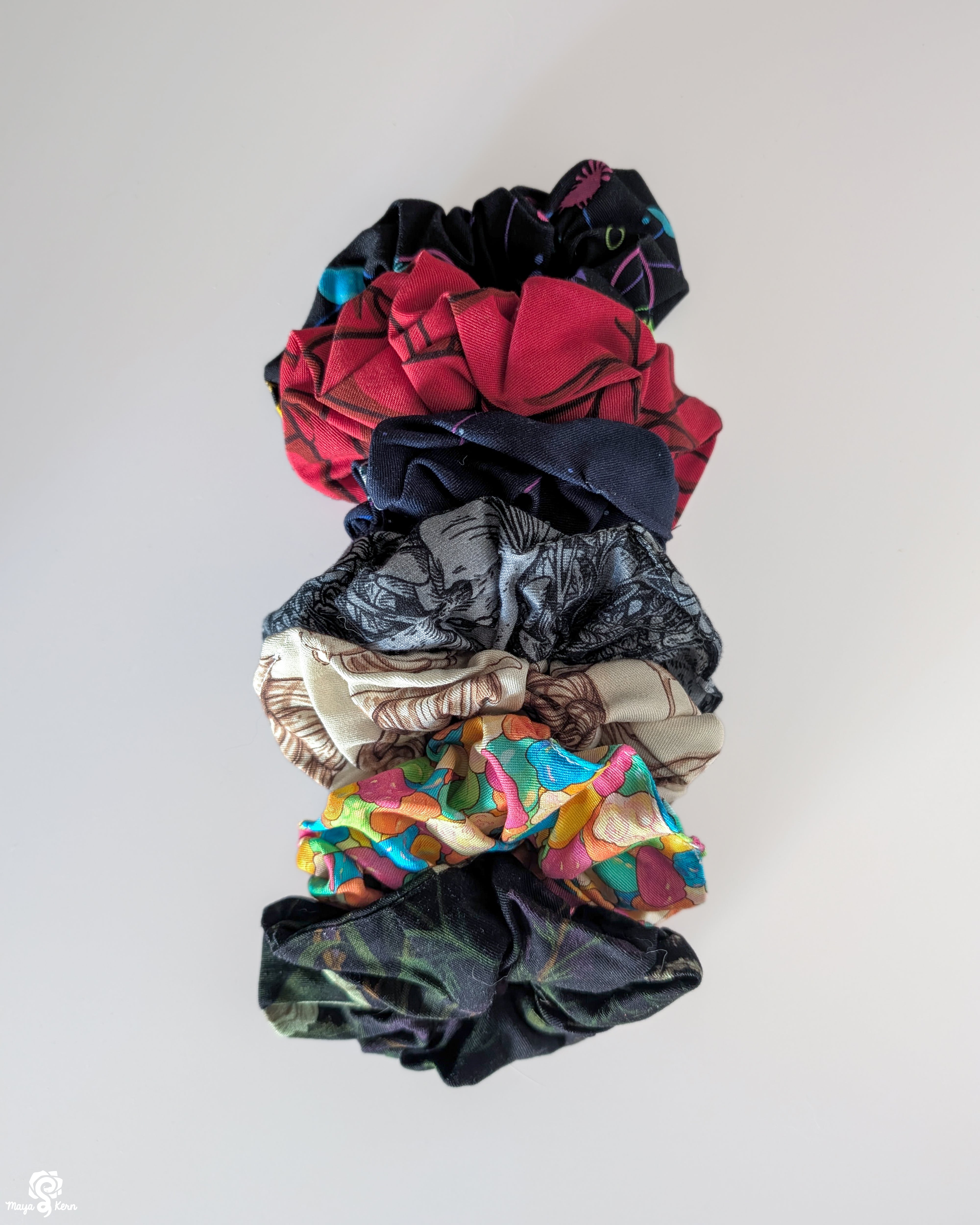 Scrunchies sewn in-house using sample fabrics we've received from our factory over the years! Most of these scrunchies are made with EcoVero Viscose, with some made from a soft, stretchy cotton.