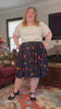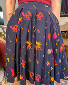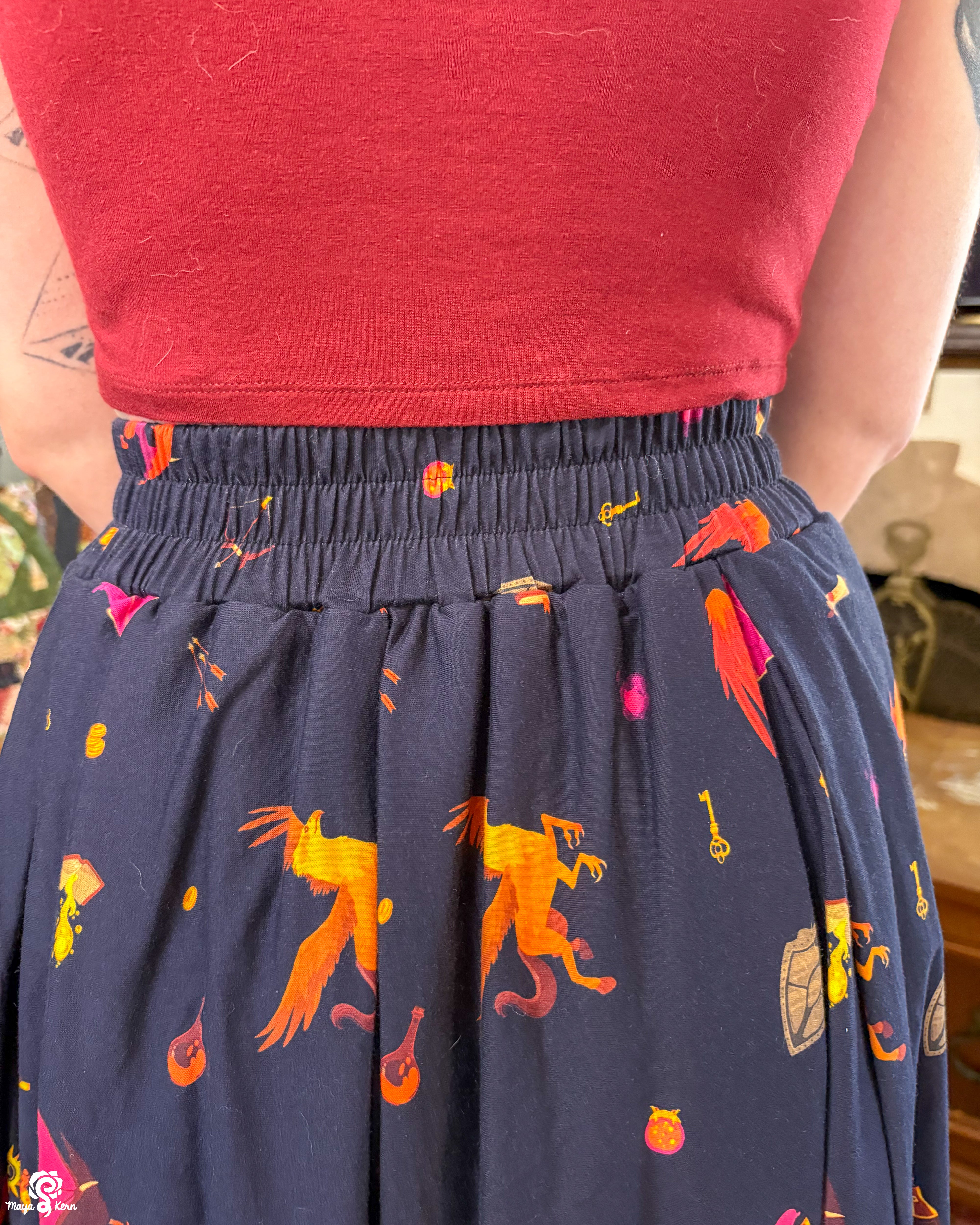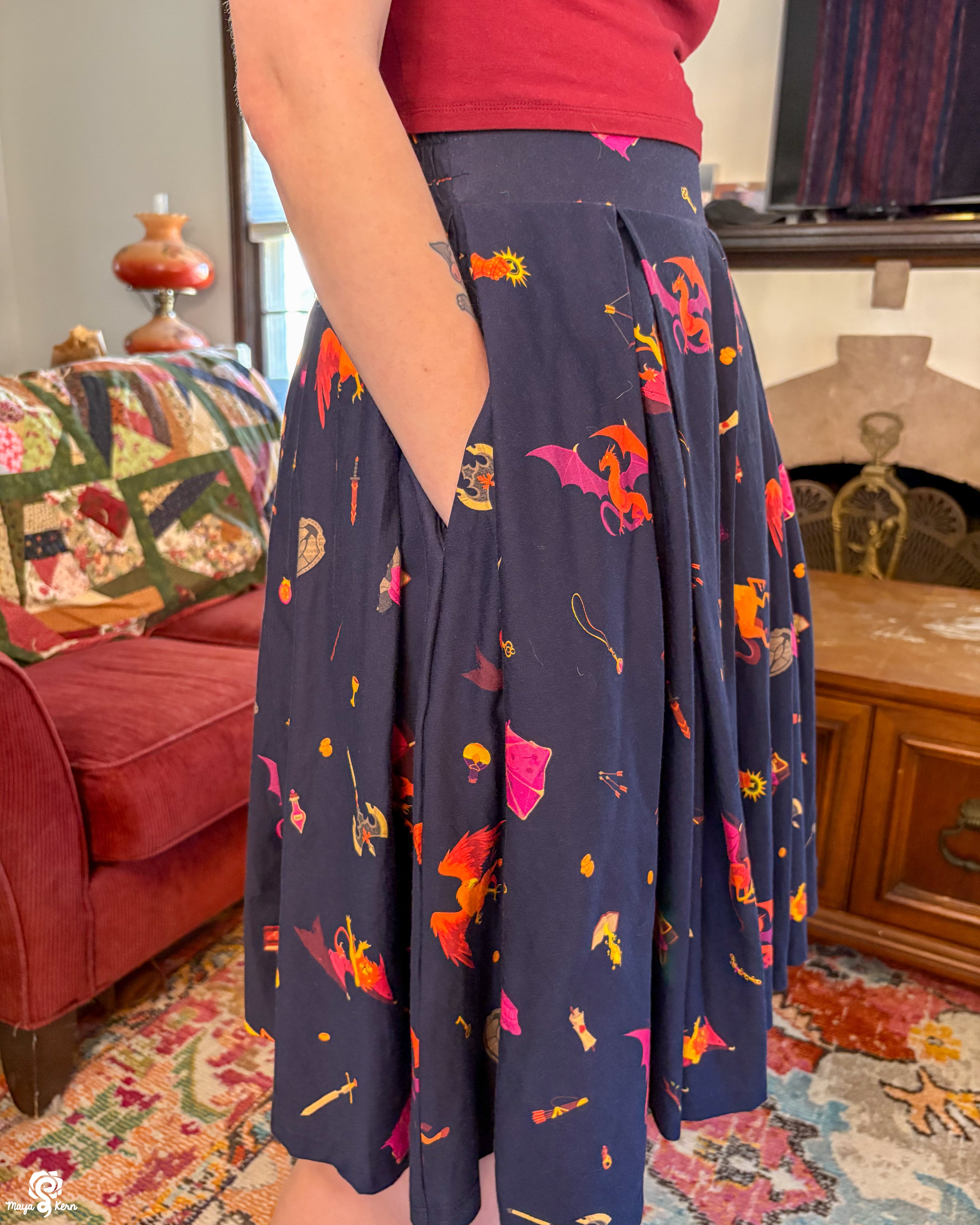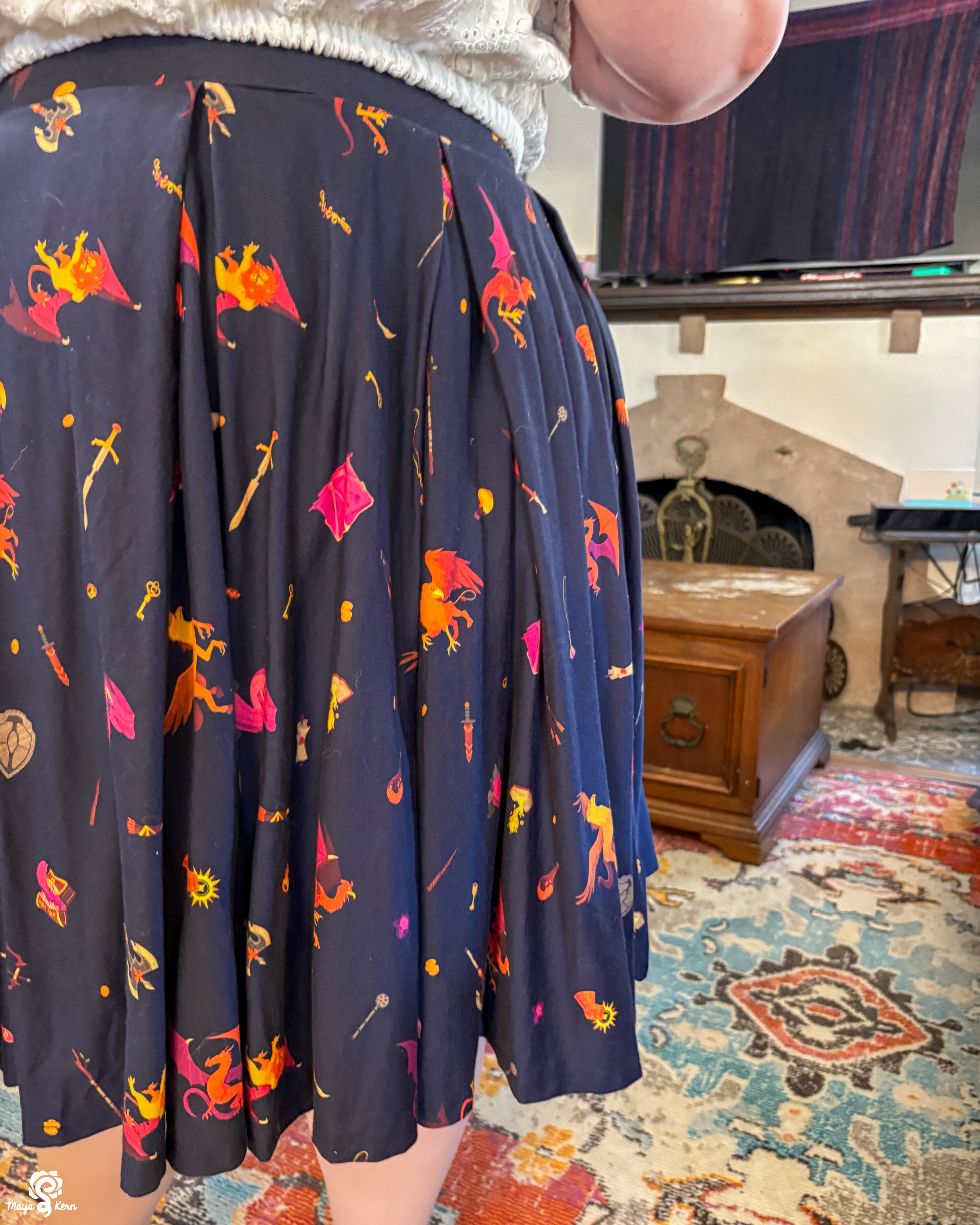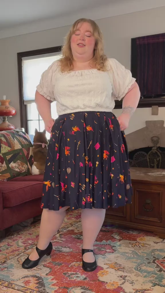 A midi length pleated box skirt featuring my Dungeon Delver design. This pattern depicts various fantasy creatures and items often found in your favorite RPGs and TTRPGs, all rendered in warm, vibrant colors on a deep navy background.