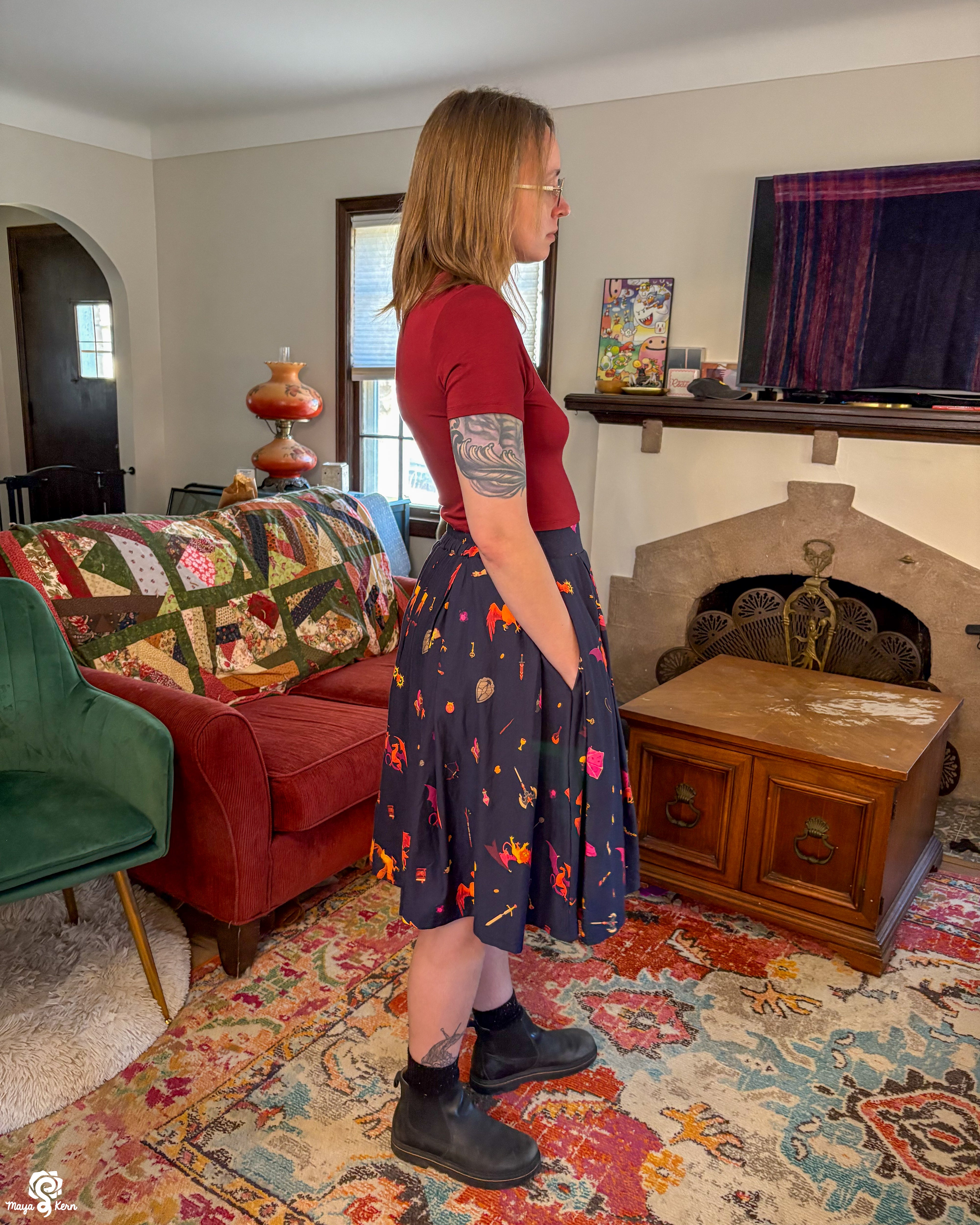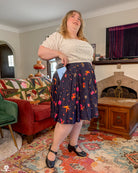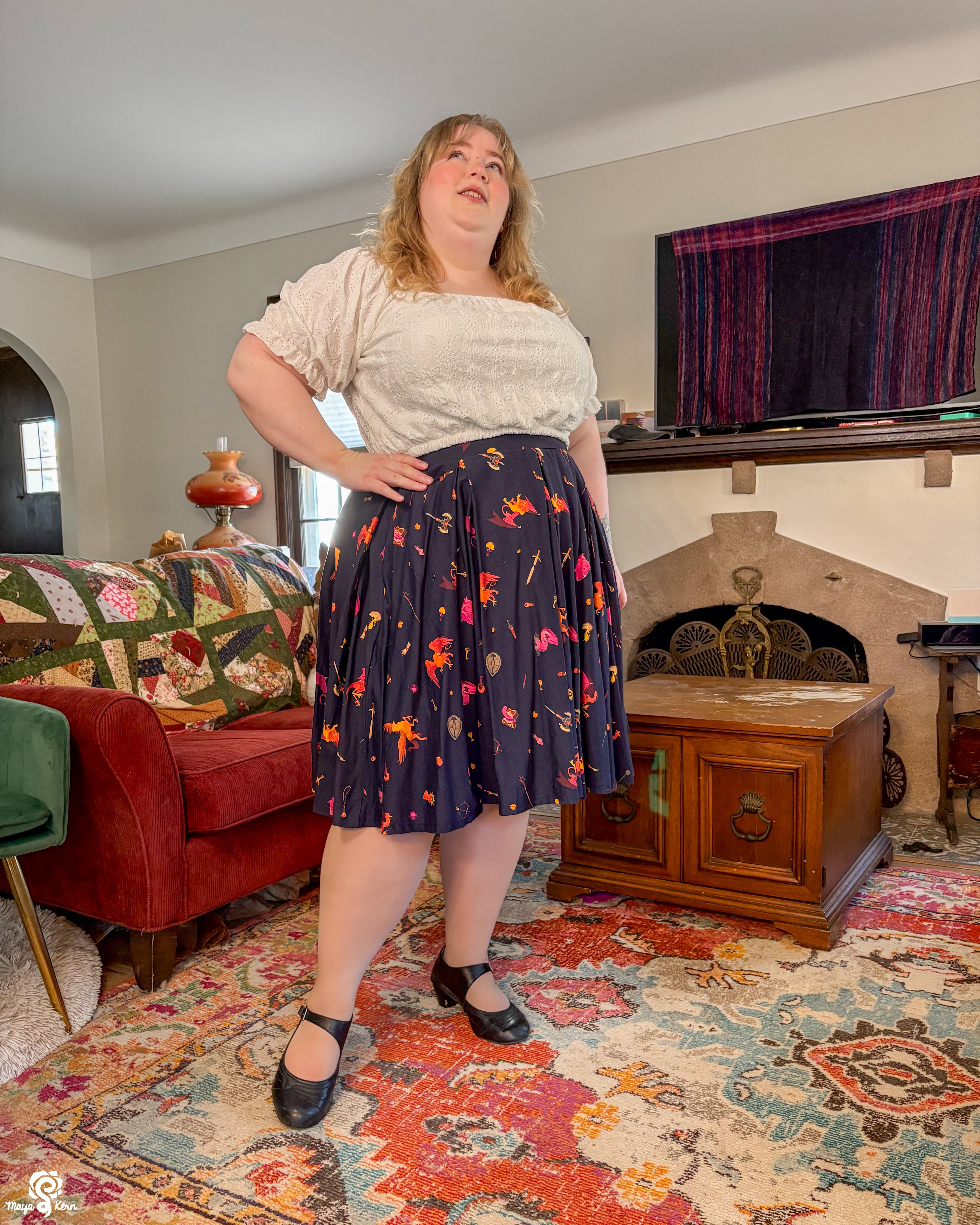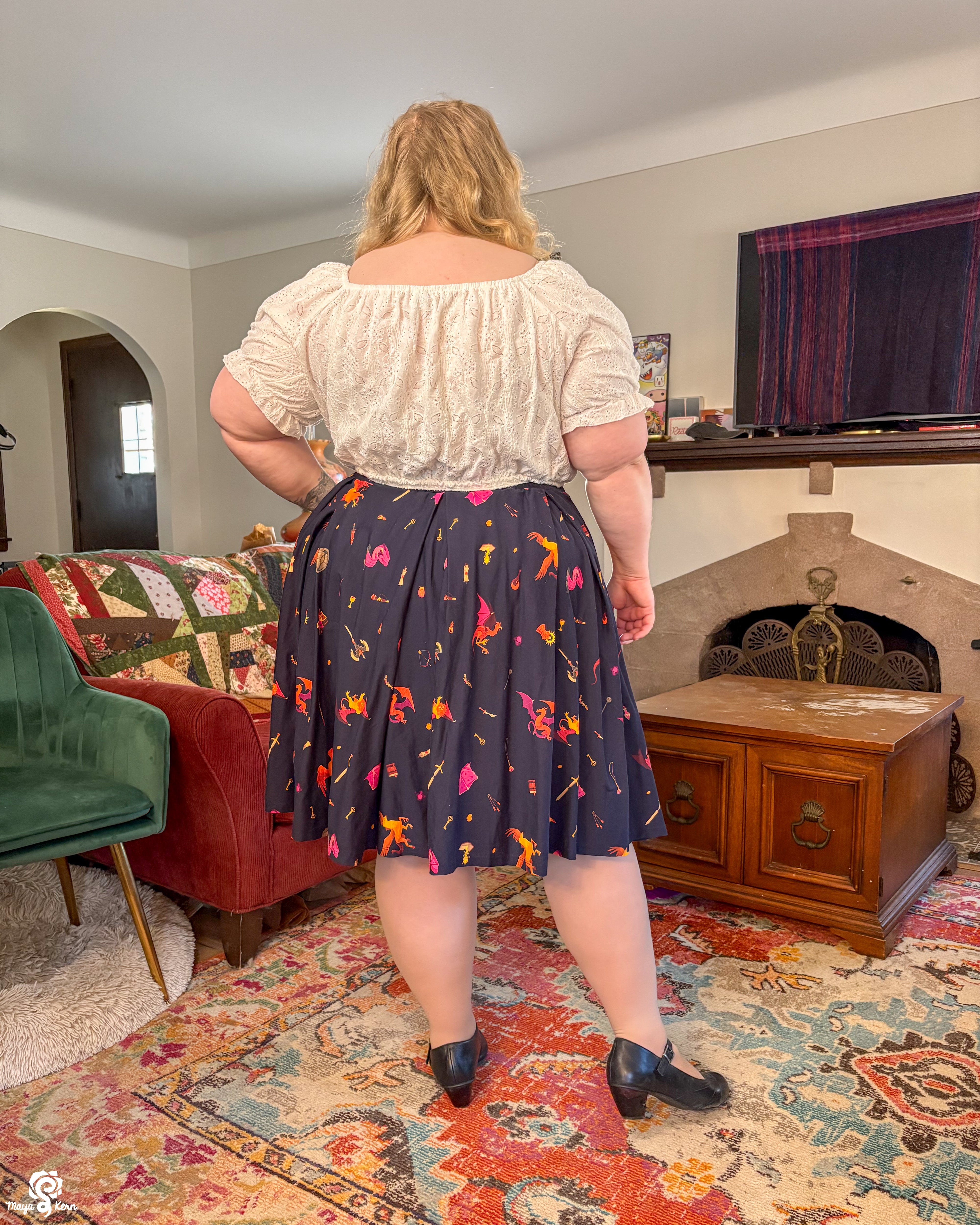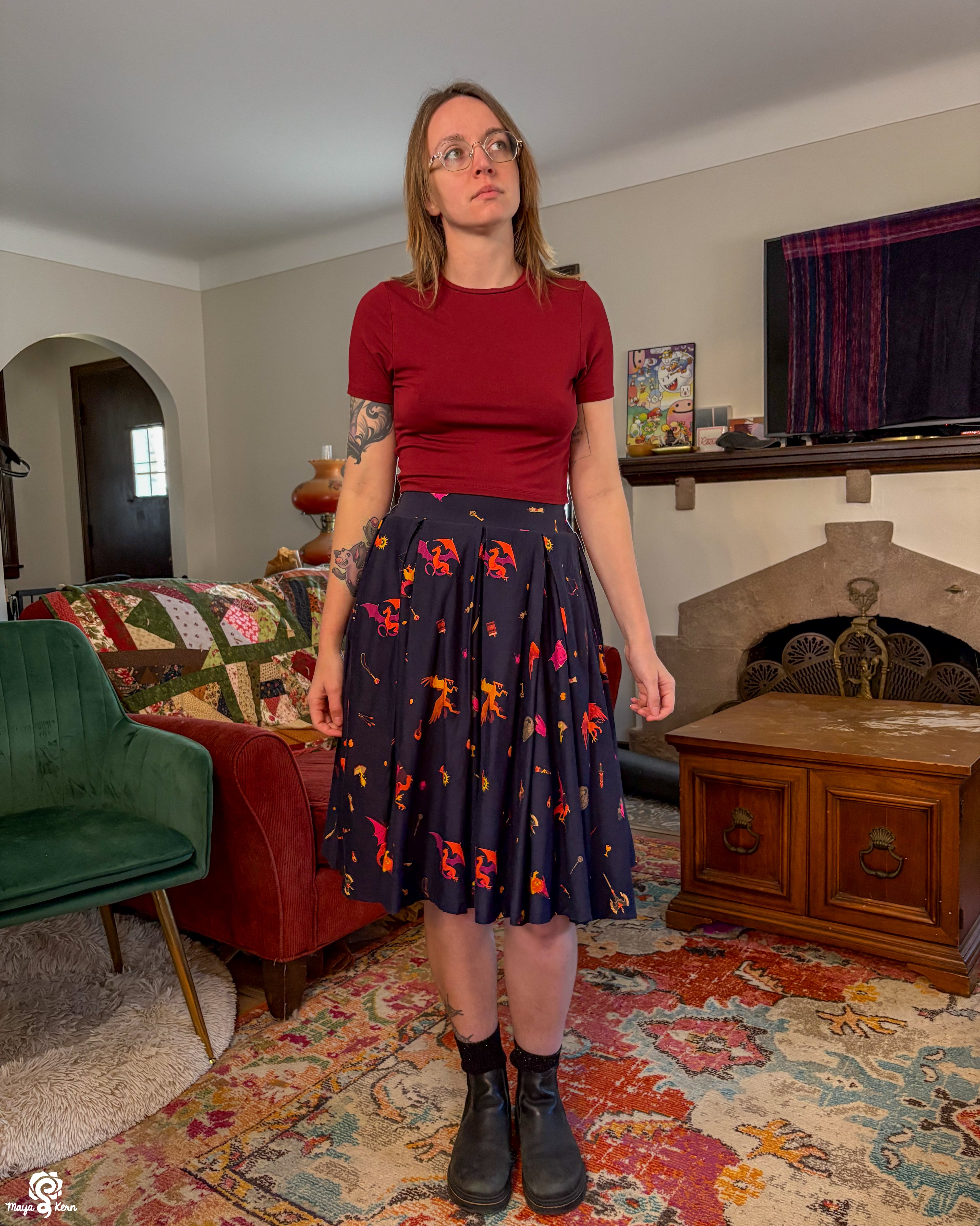 A midi length pleated box skirt featuring my Dungeon Delver design. This pattern depicts various fantasy creatures and items often found in your favorite RPGs and TTRPGs, all rendered in warm, vibrant colors on a deep navy background.