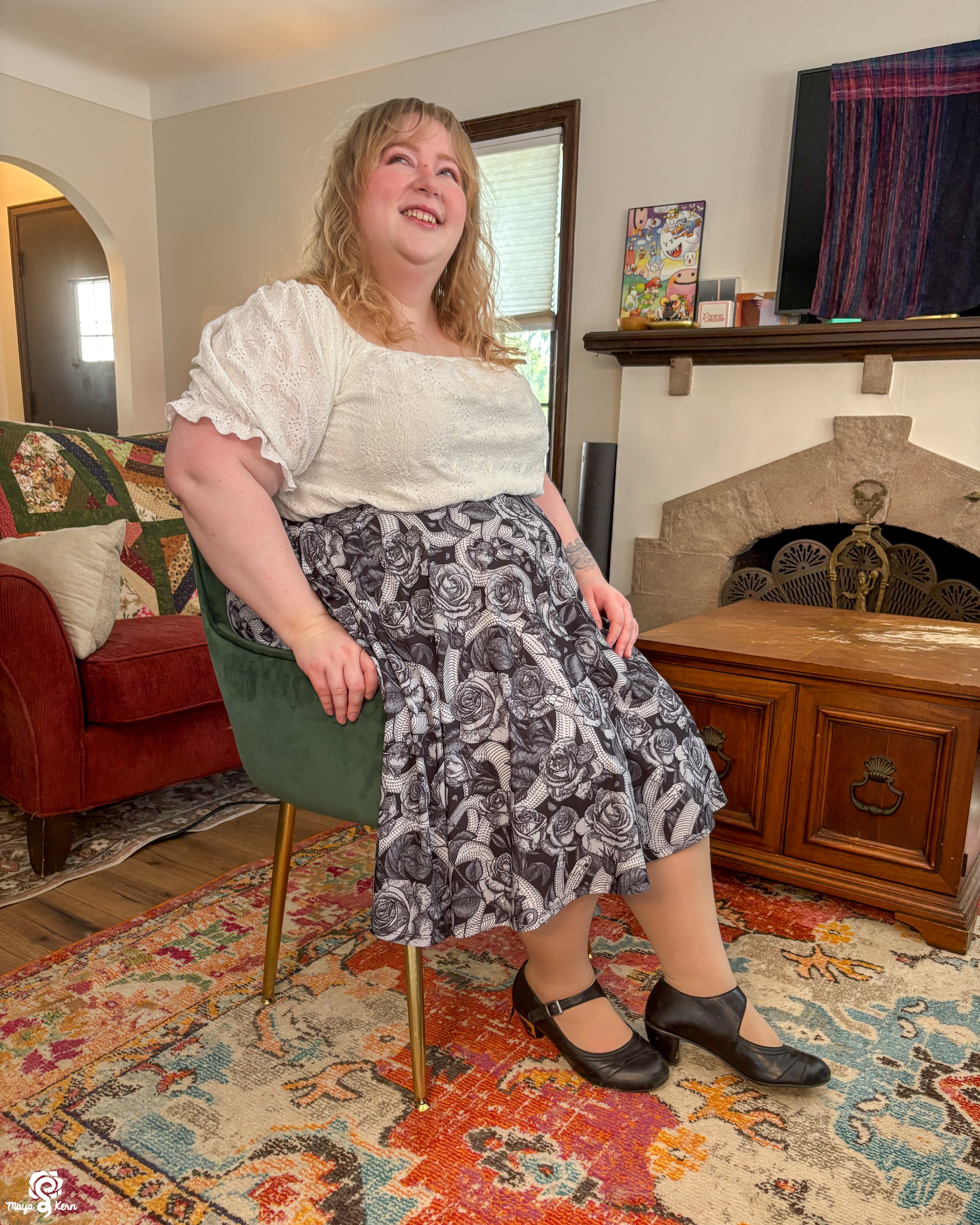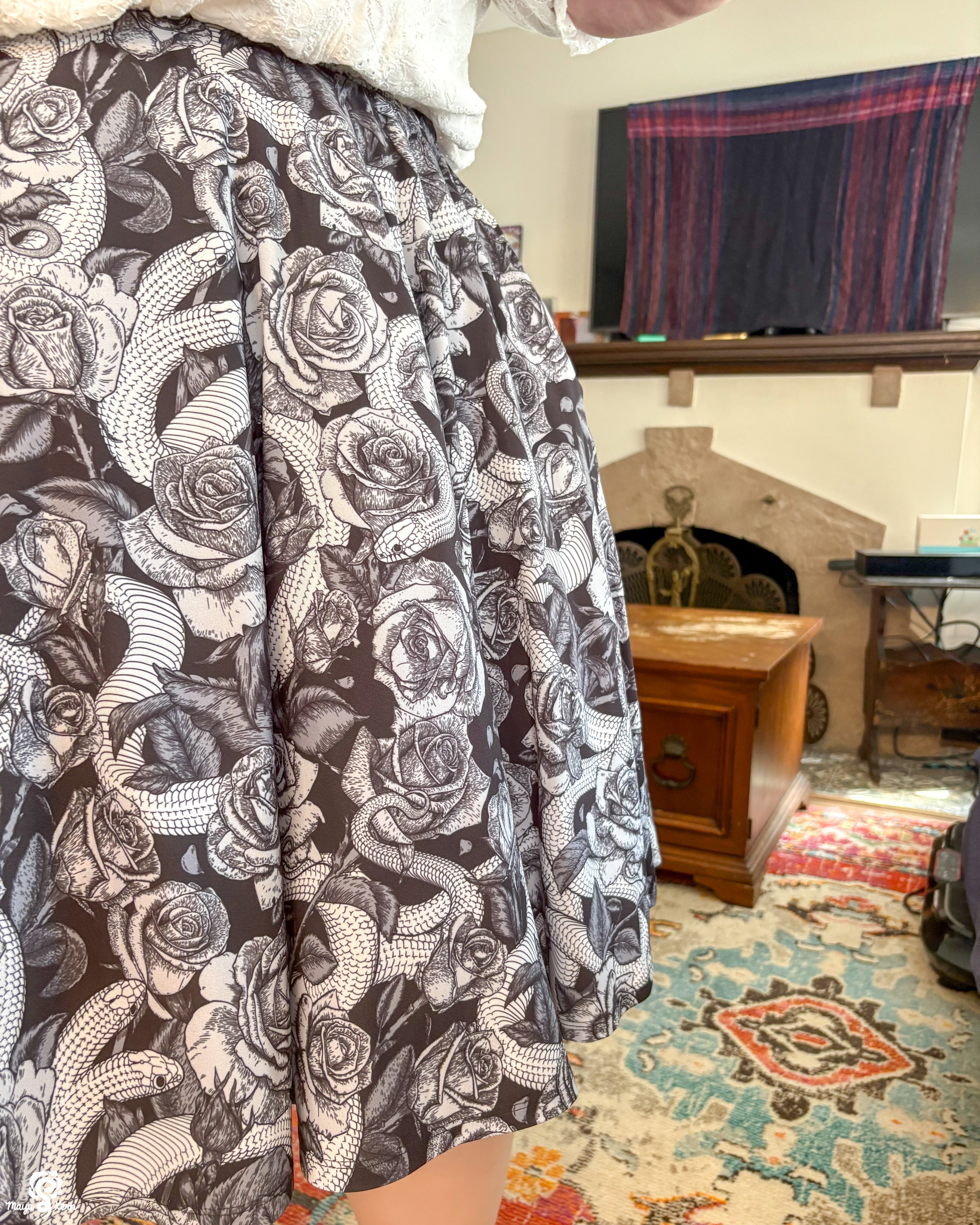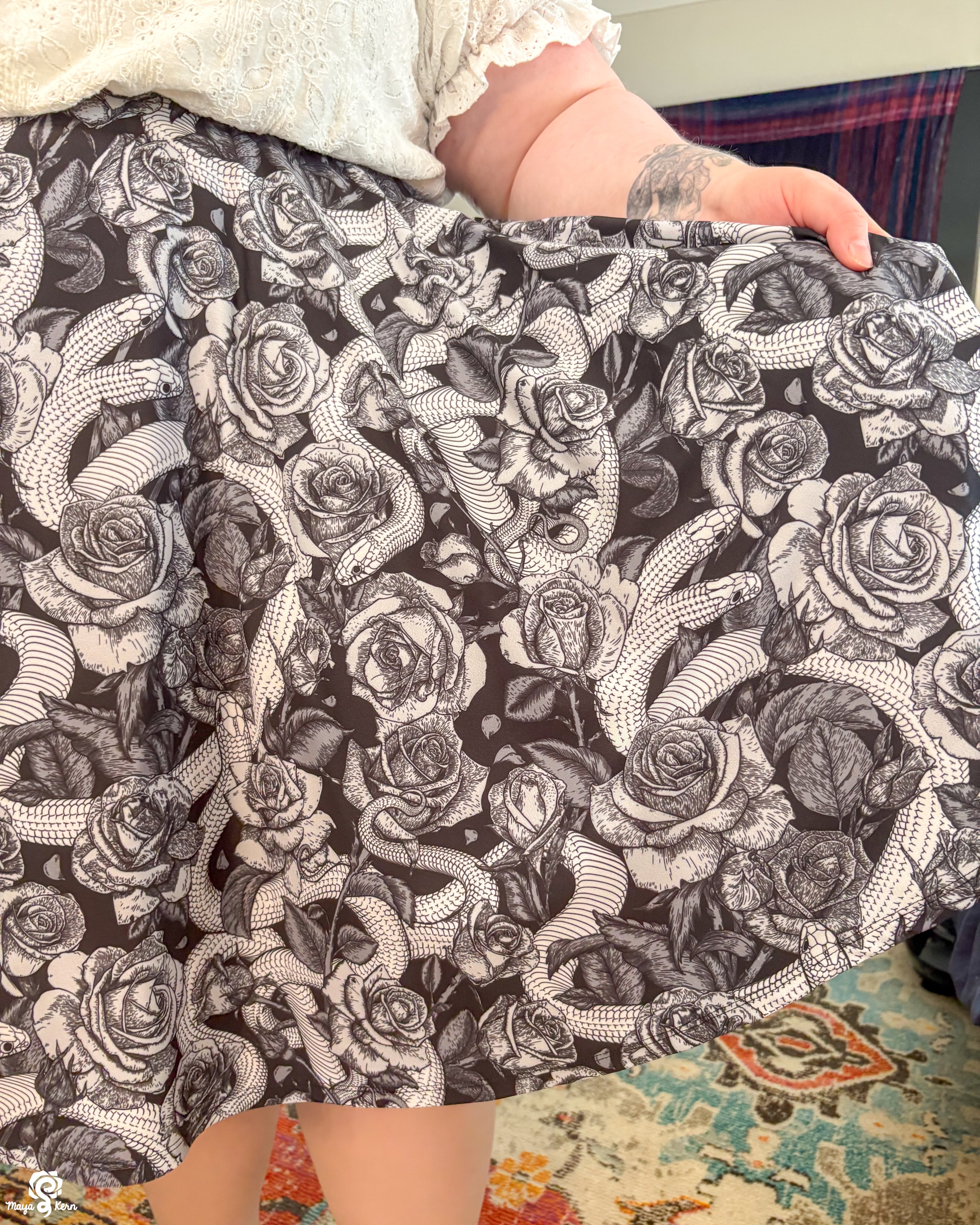 Stretchy circle skirt featuring my Hiss from a Rose Redux pattern on a black background. These skirts have pockets large enough to fit your phone, DS, Switch, hands, and maybe a small cat. Petticoat not included.