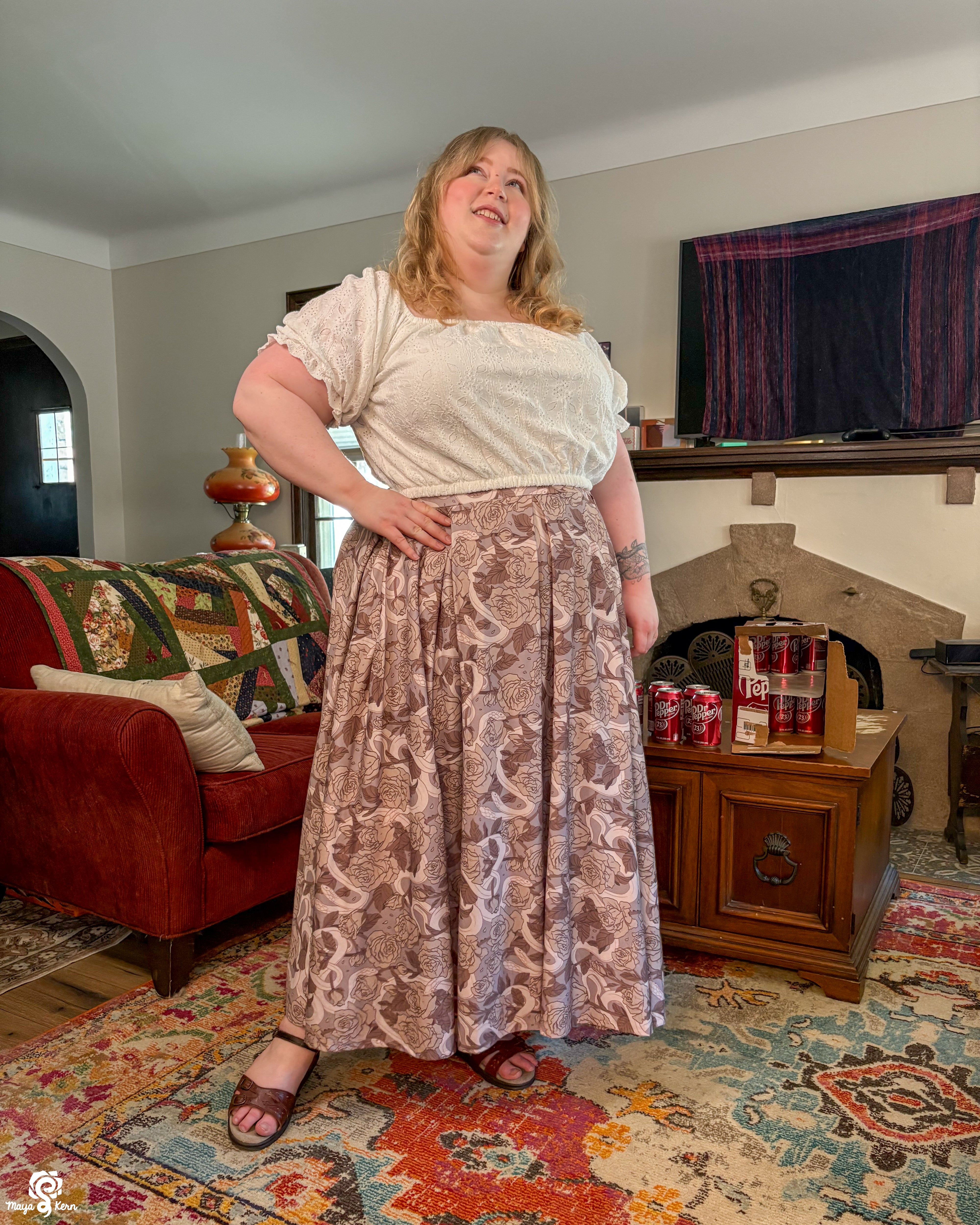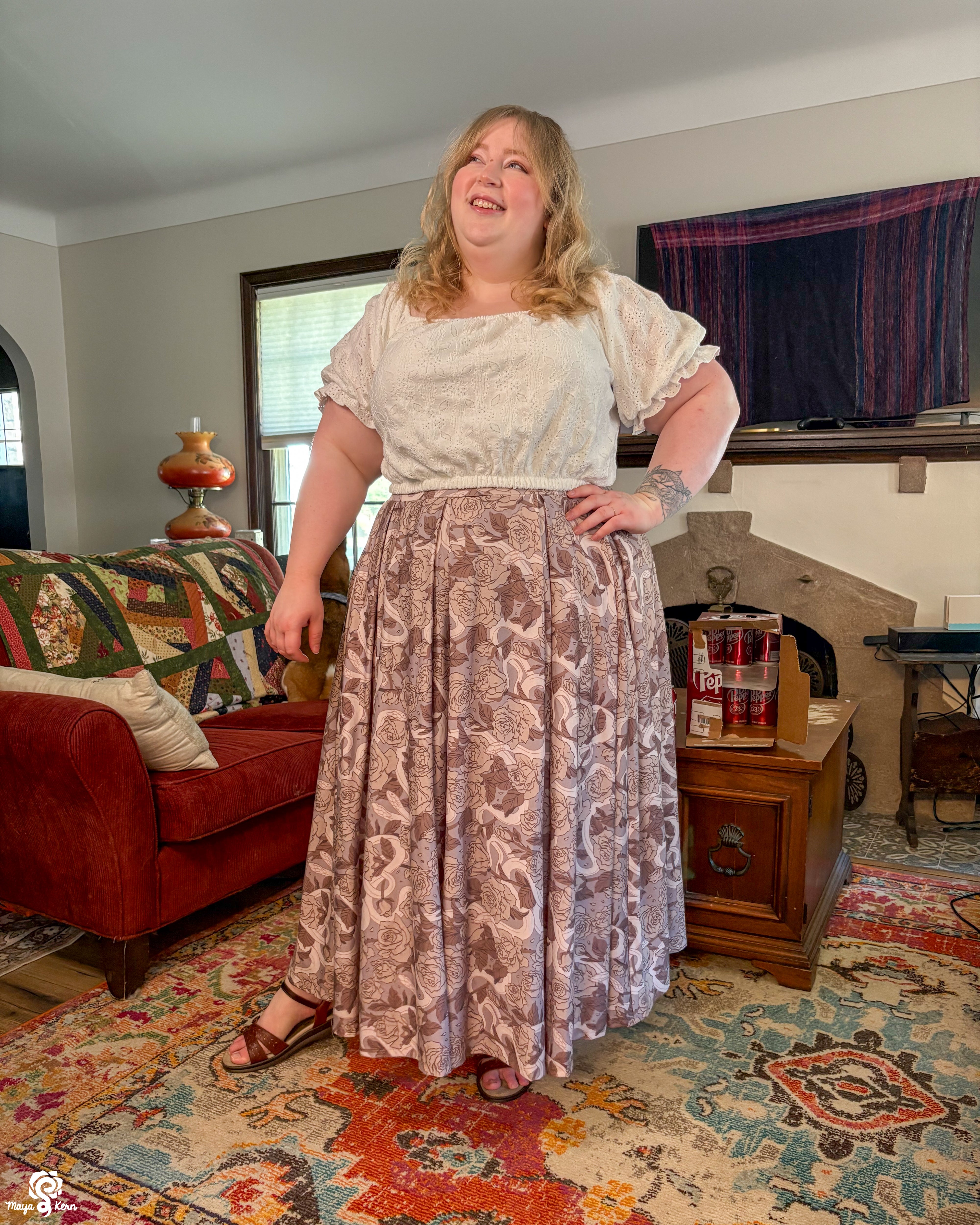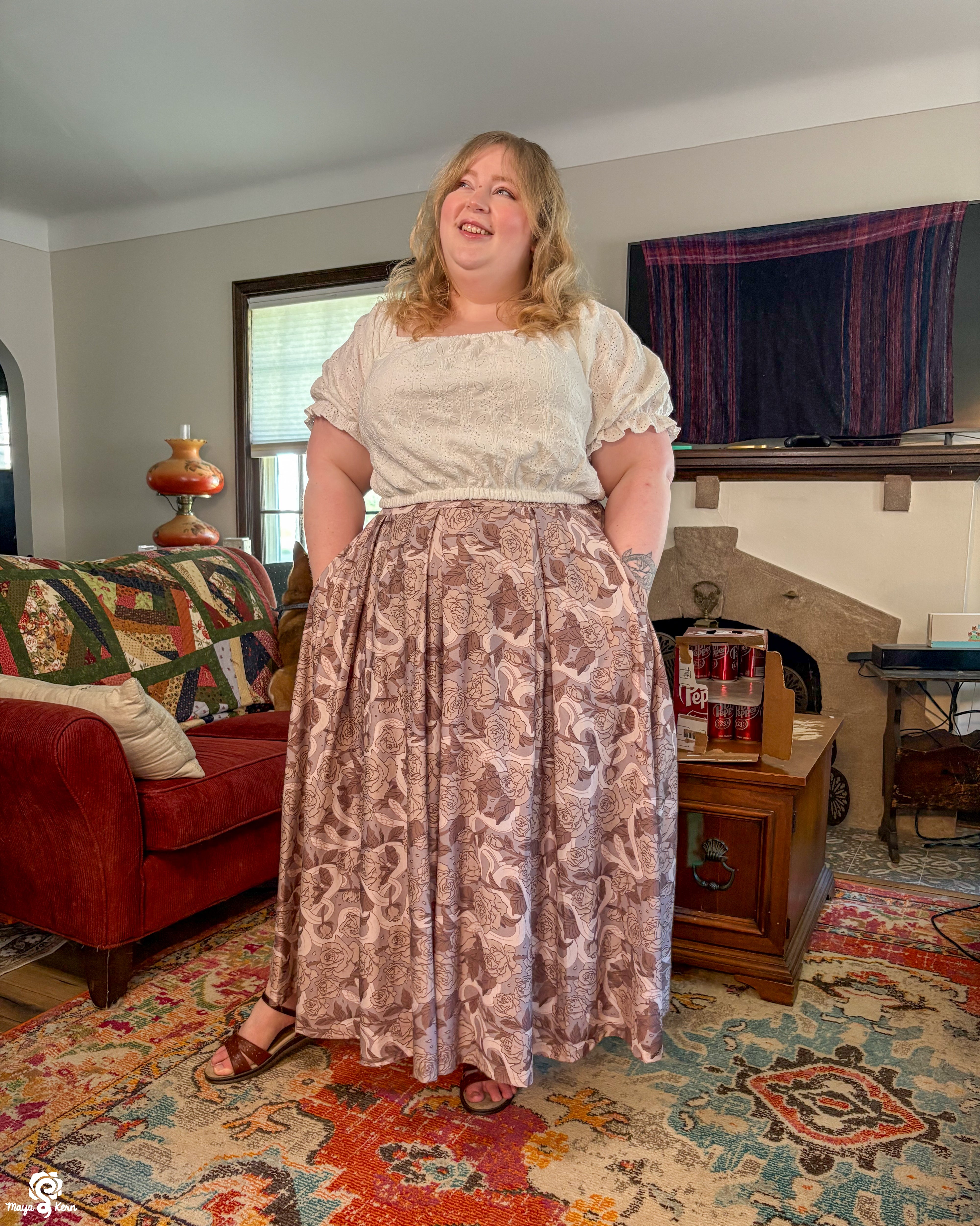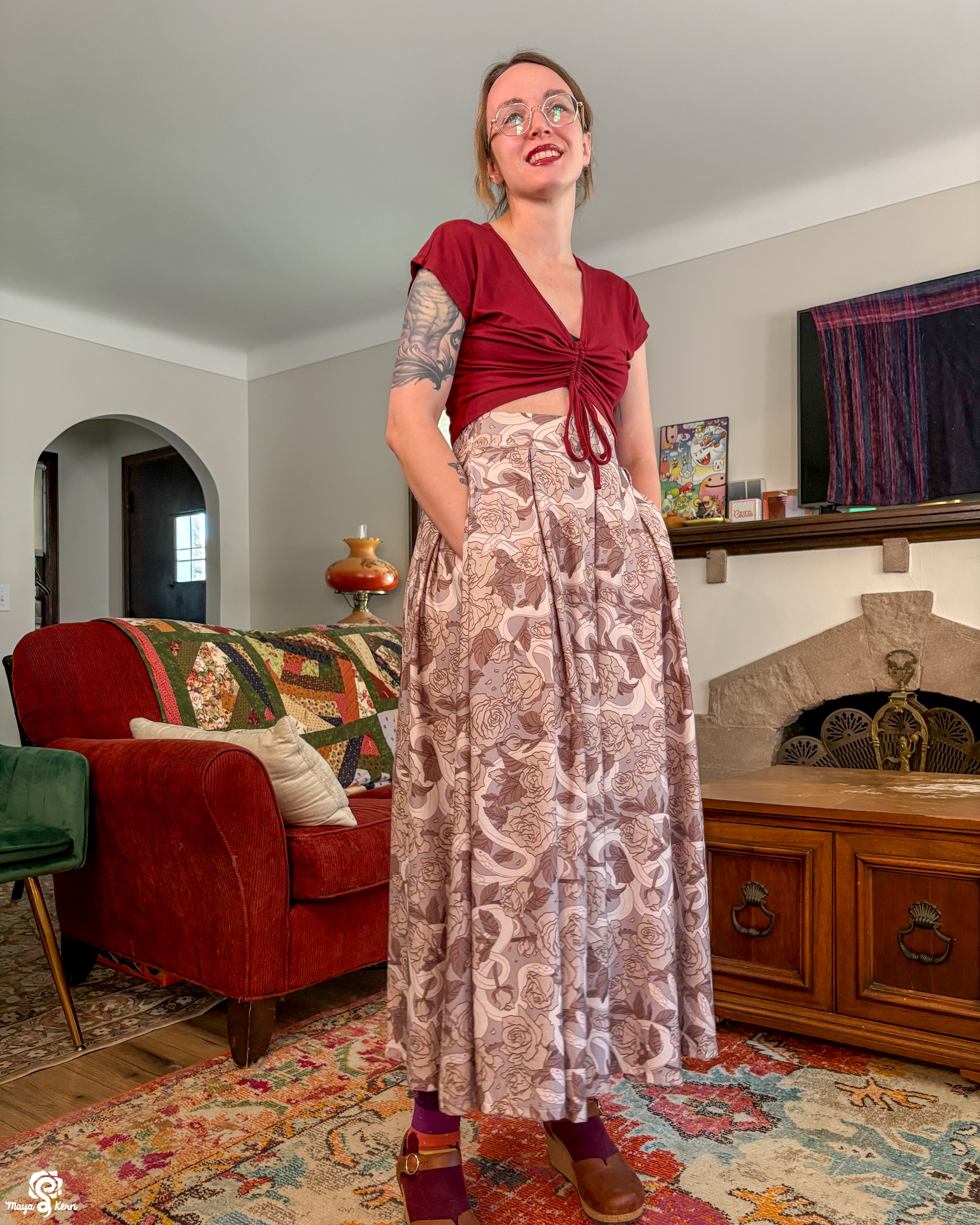 A maxi length pleated box skirt featuring my Hiss From a Rose design in a Latte color way. This design features white snakes and warm gray roses (similar to a muted sandy brown) on a light, cool-toned gray background. Over all it has a soft, elegant look to it.