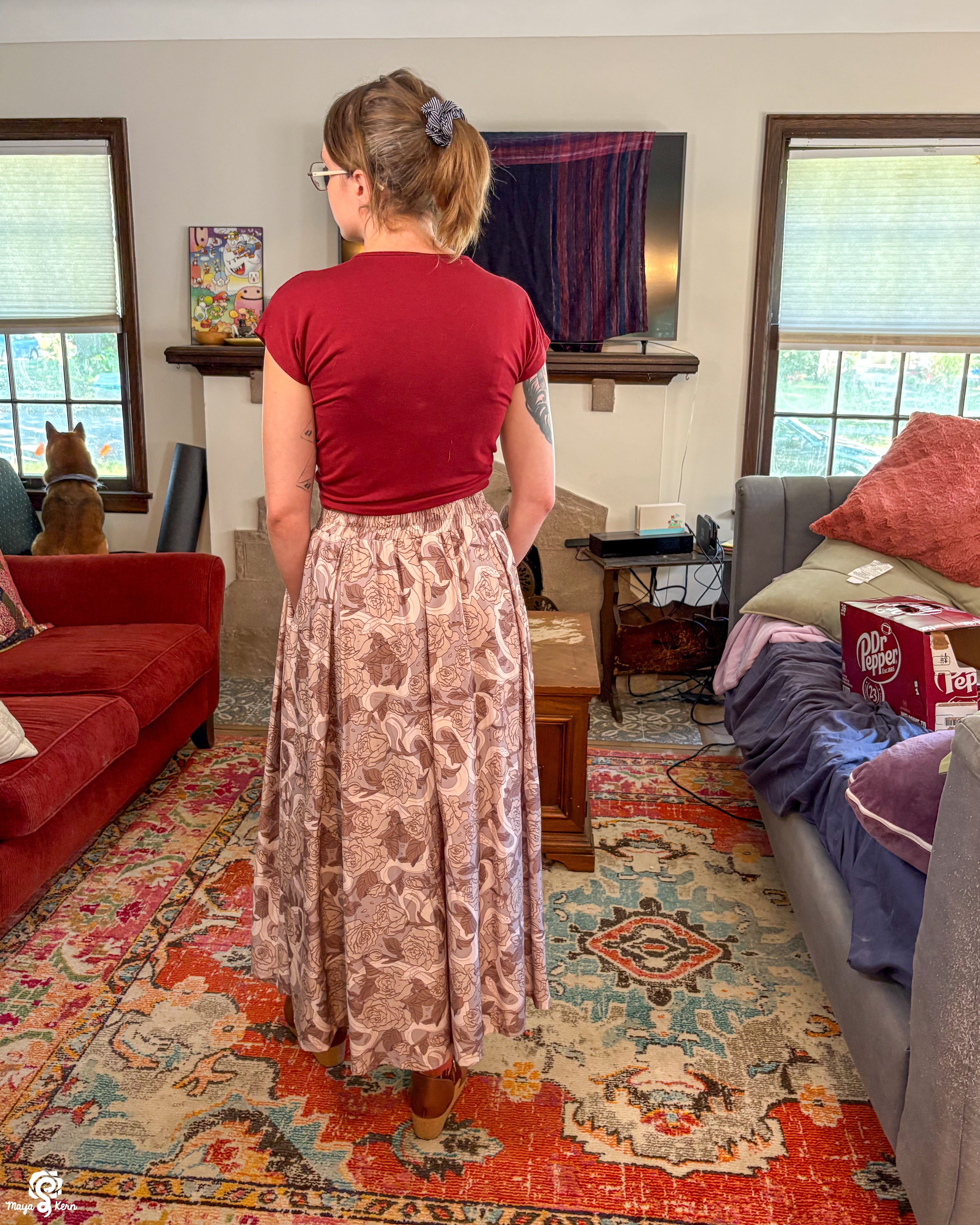 This modest box skirt features a thick waistband with an elastic back panel that will stretch with you throughout bloating and weight fluctuations. The waistband's thickness and smaller range of stretch (when compared to our polyester skirts) allow it to be sturdy enough to let you load up your pockets with heavier items, like maybe 10 cans of soda.
