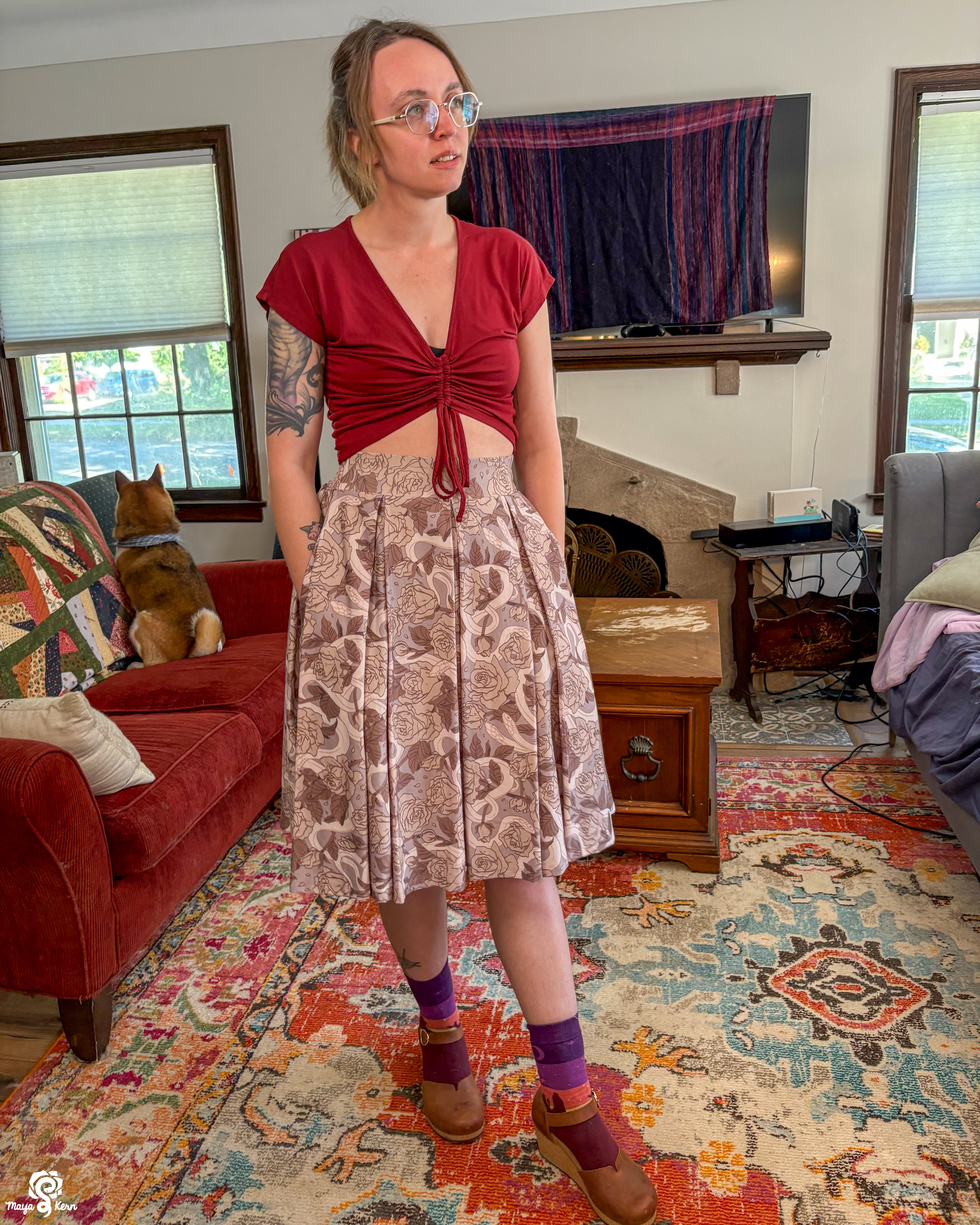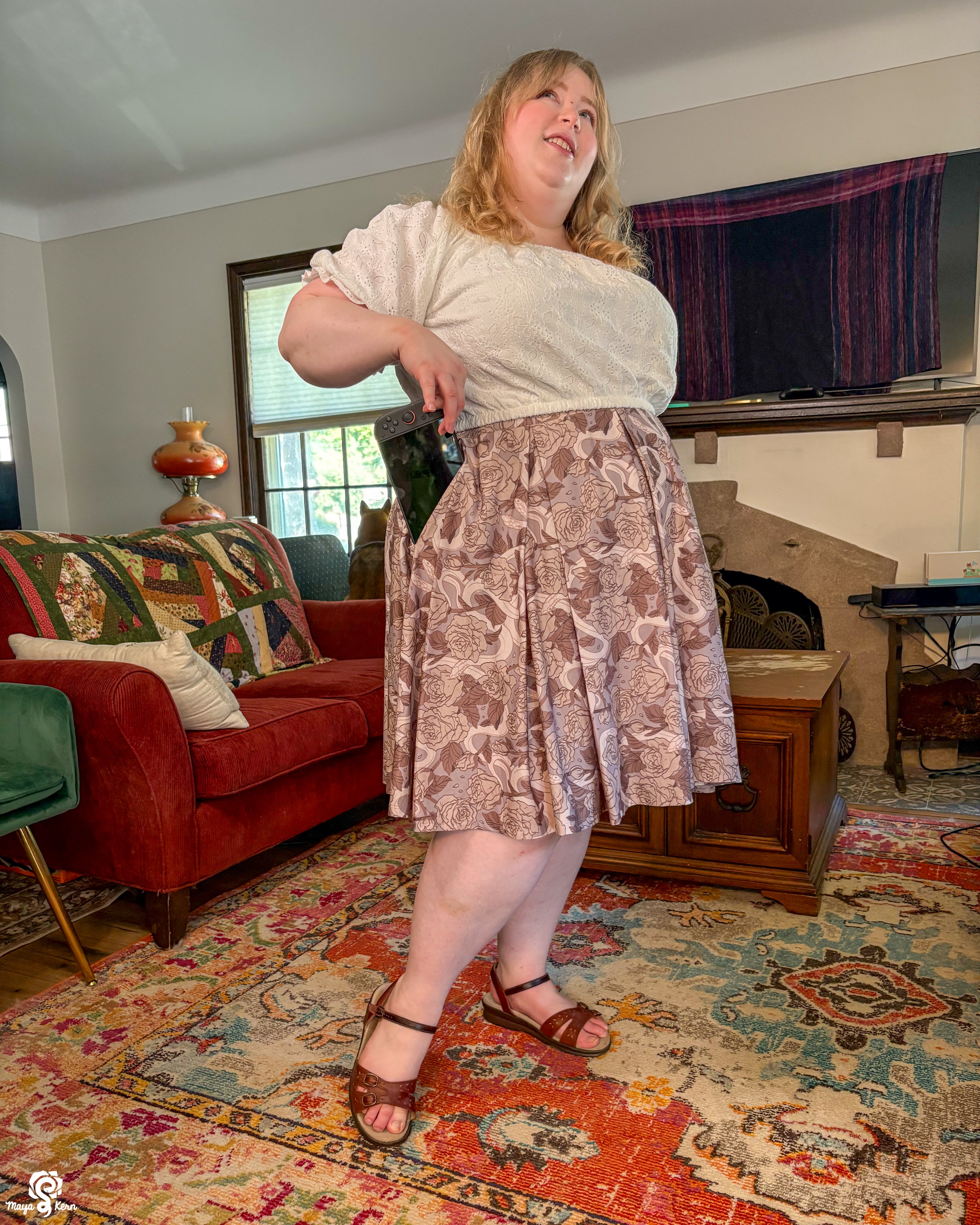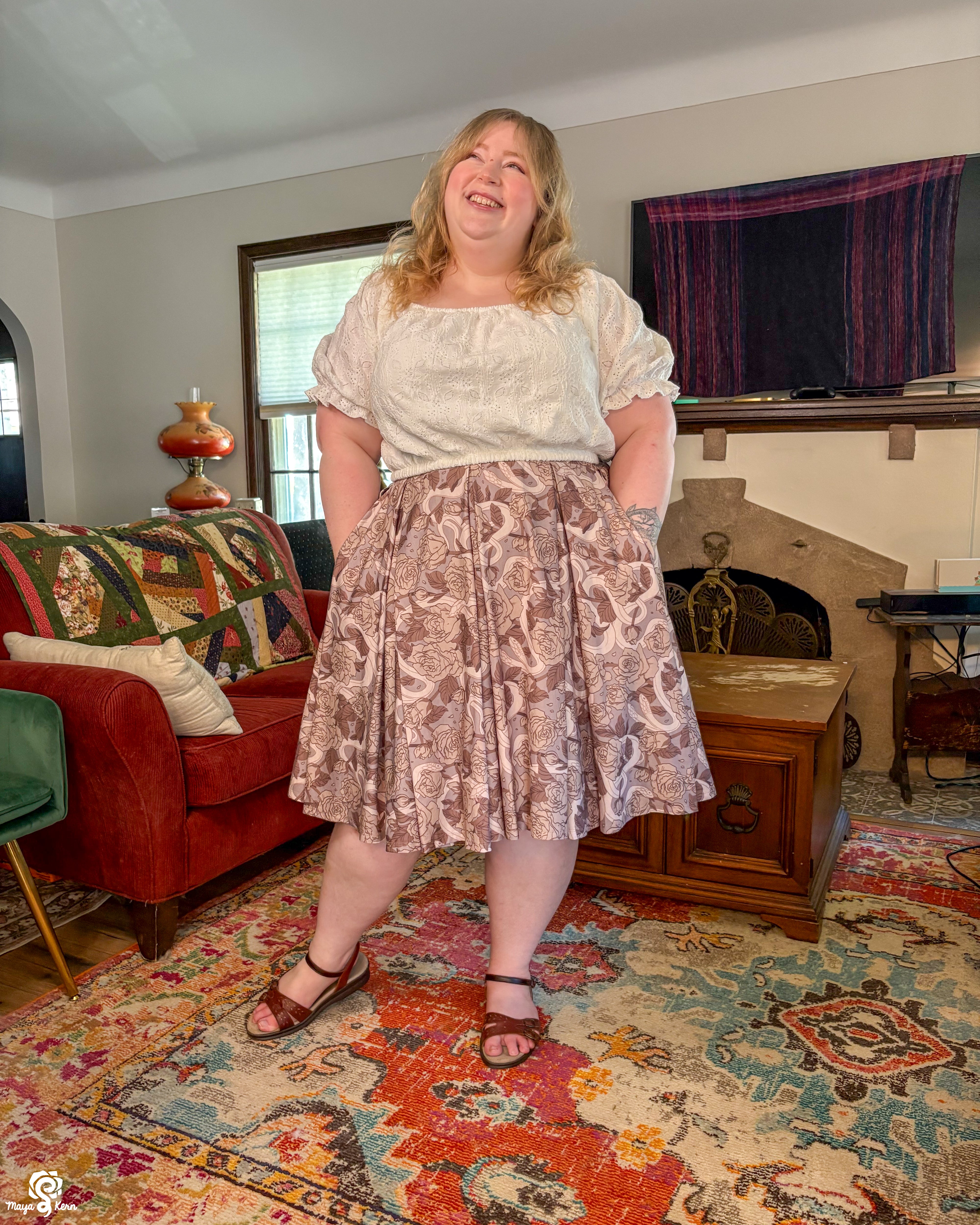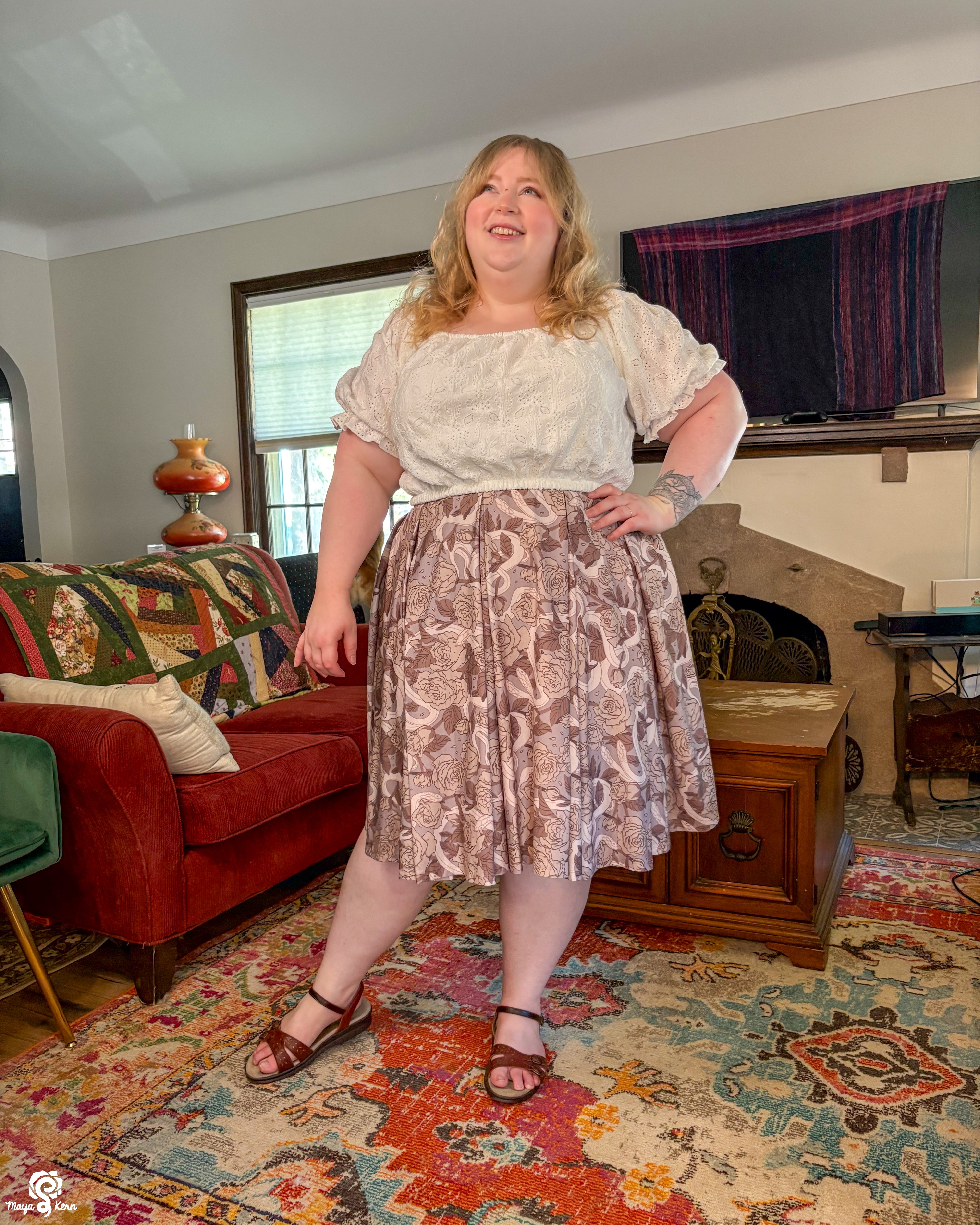 A midi length pleated box skirt featuring my Hiss From a Rose design in a Latte color way. This design features white snakes and warm gray roses (similar to a muted sandy brown) on a light, cool-toned gray background. Over all it has a soft, elegant look to it.