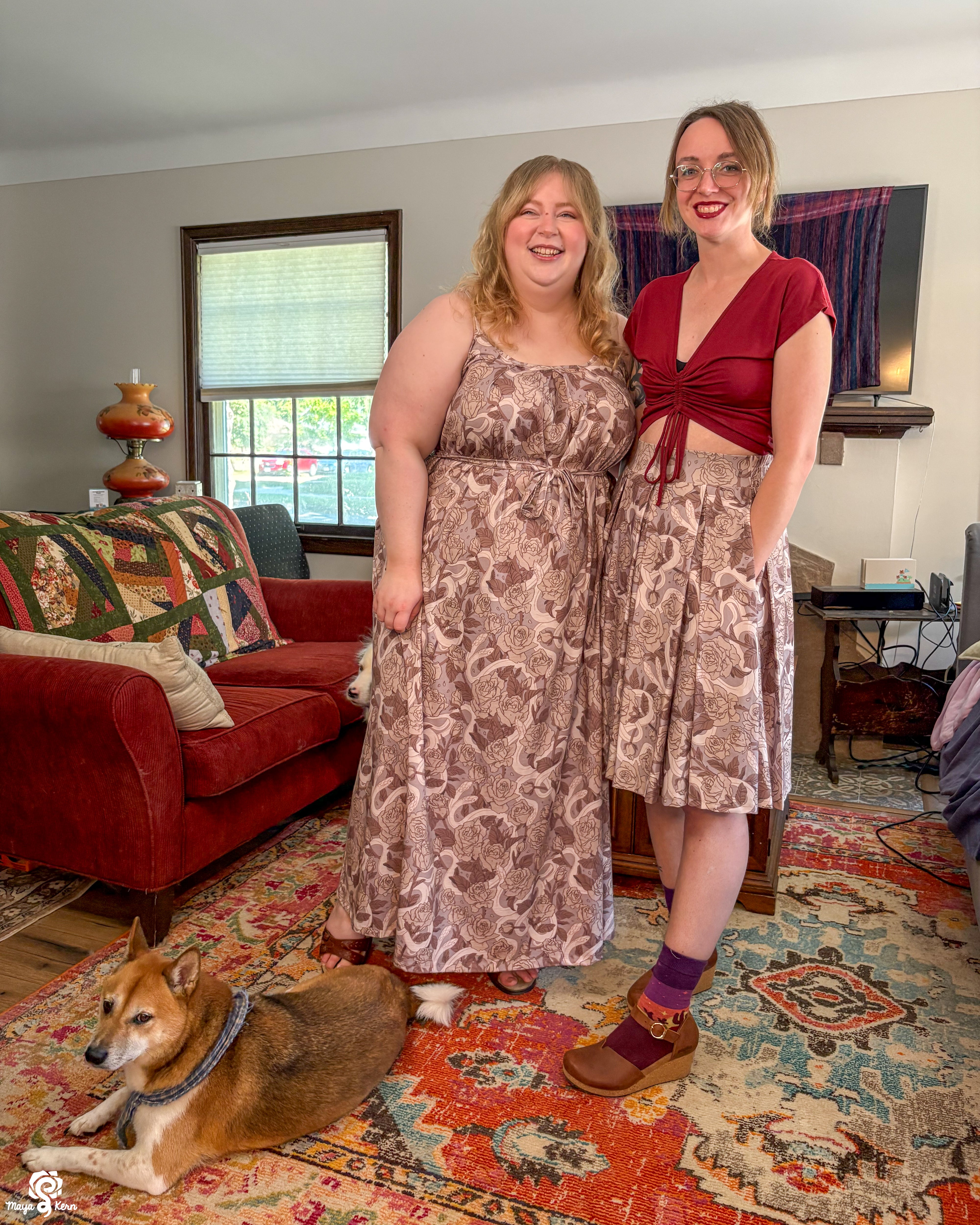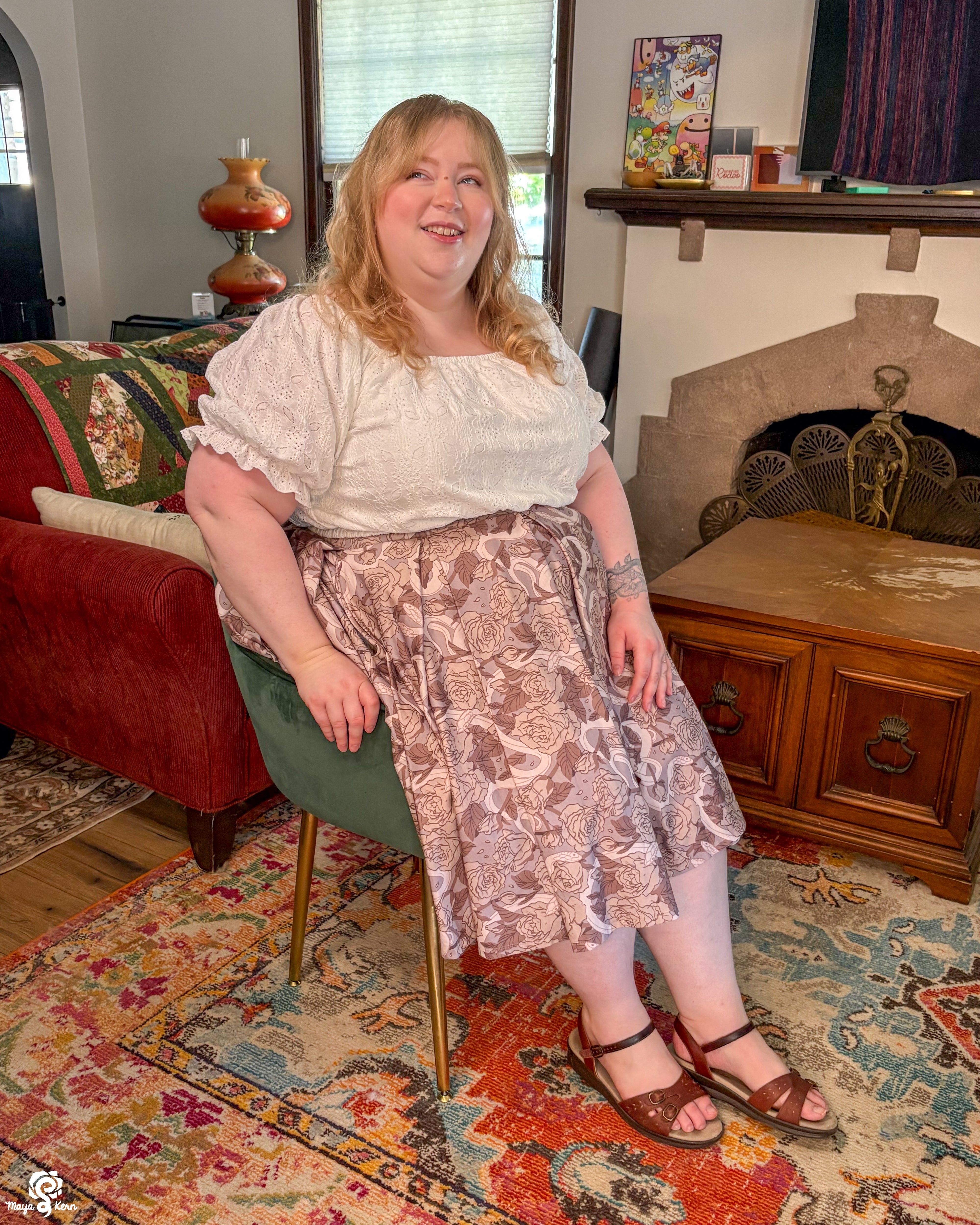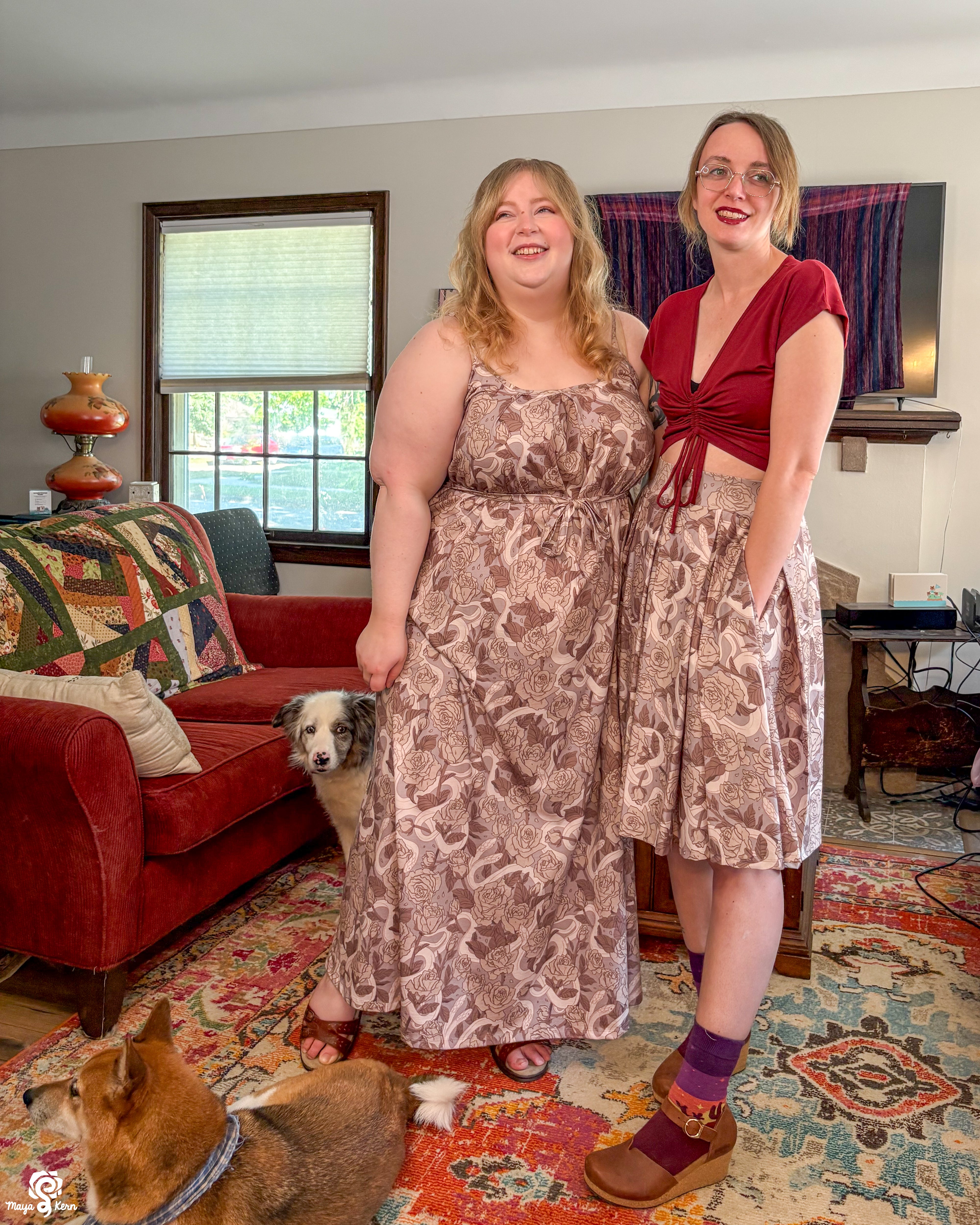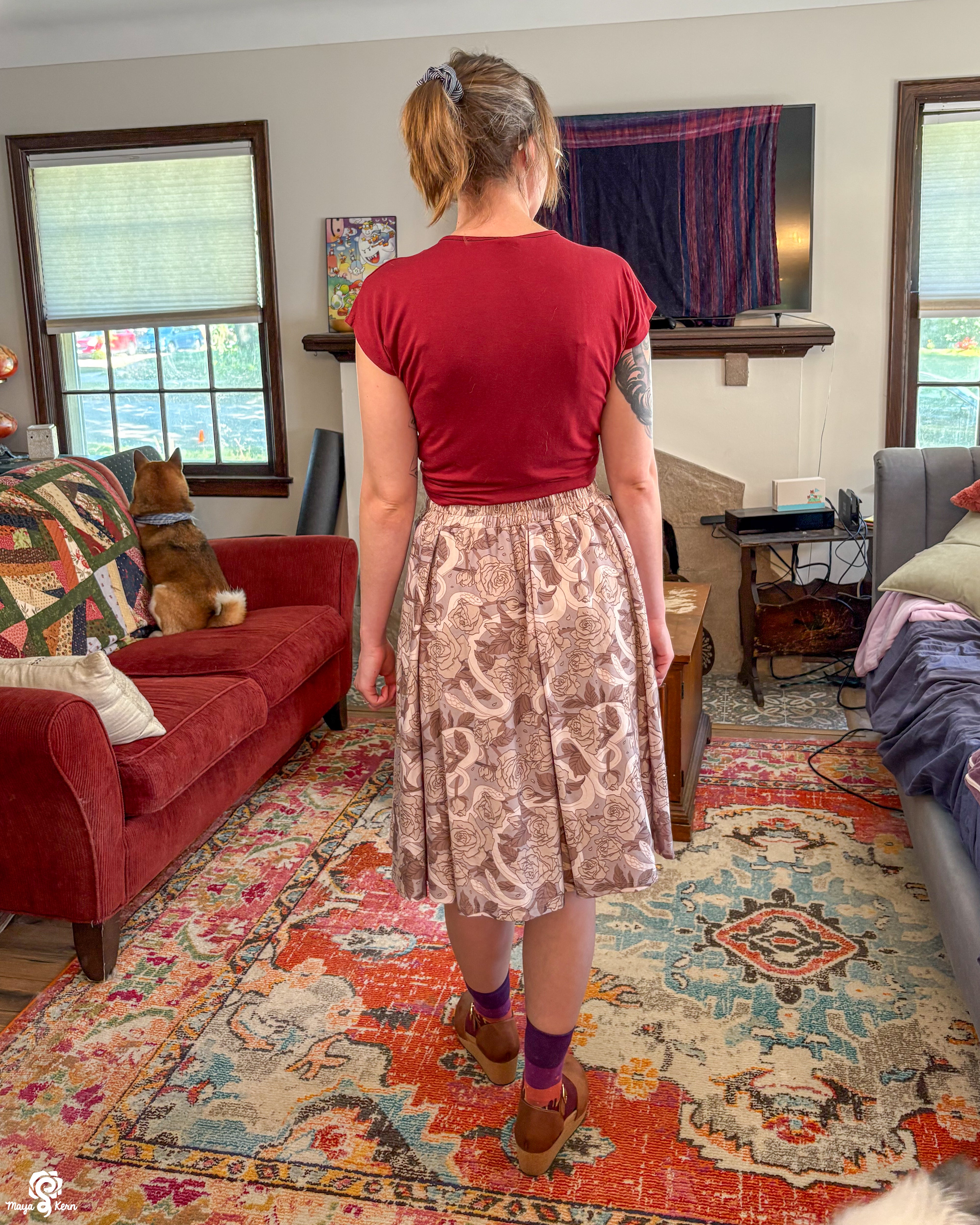 A midi length pleated box skirt featuring my Hiss From a Rose design in a Latte color way. This design features white snakes and warm gray roses (similar to a muted sandy brown) on a light, cool-toned gray background. Over all it has a soft, elegant look to it.
