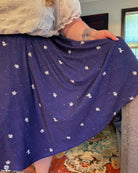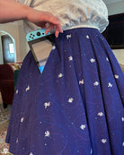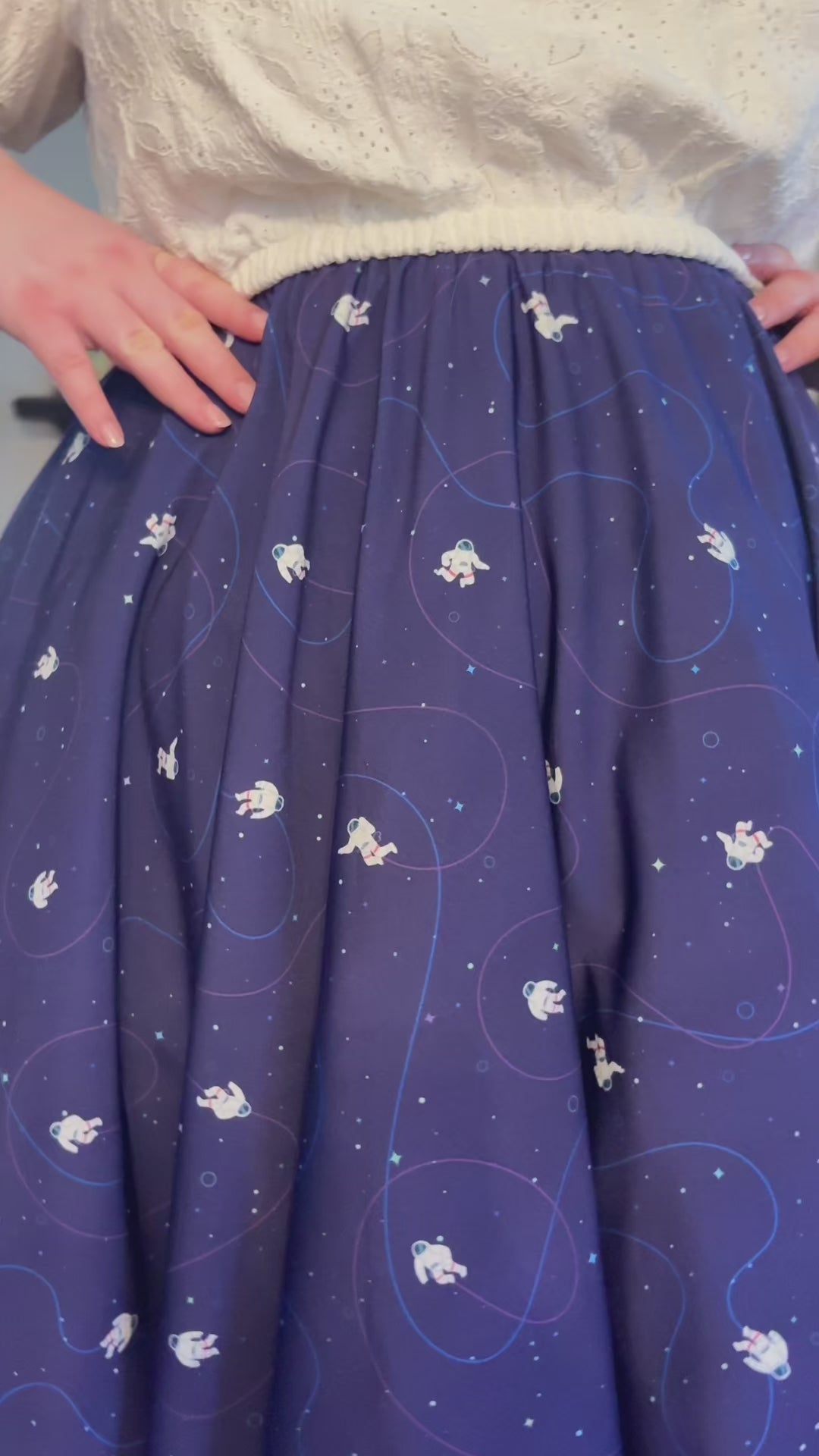 Stretchy circle skirt featuring my adorable astronaut pattern on a blueberry blue background. These skirts have pockets large enough to fit your phone, DS, Switch, hands, and maybe a small cat. Petticoat not included.