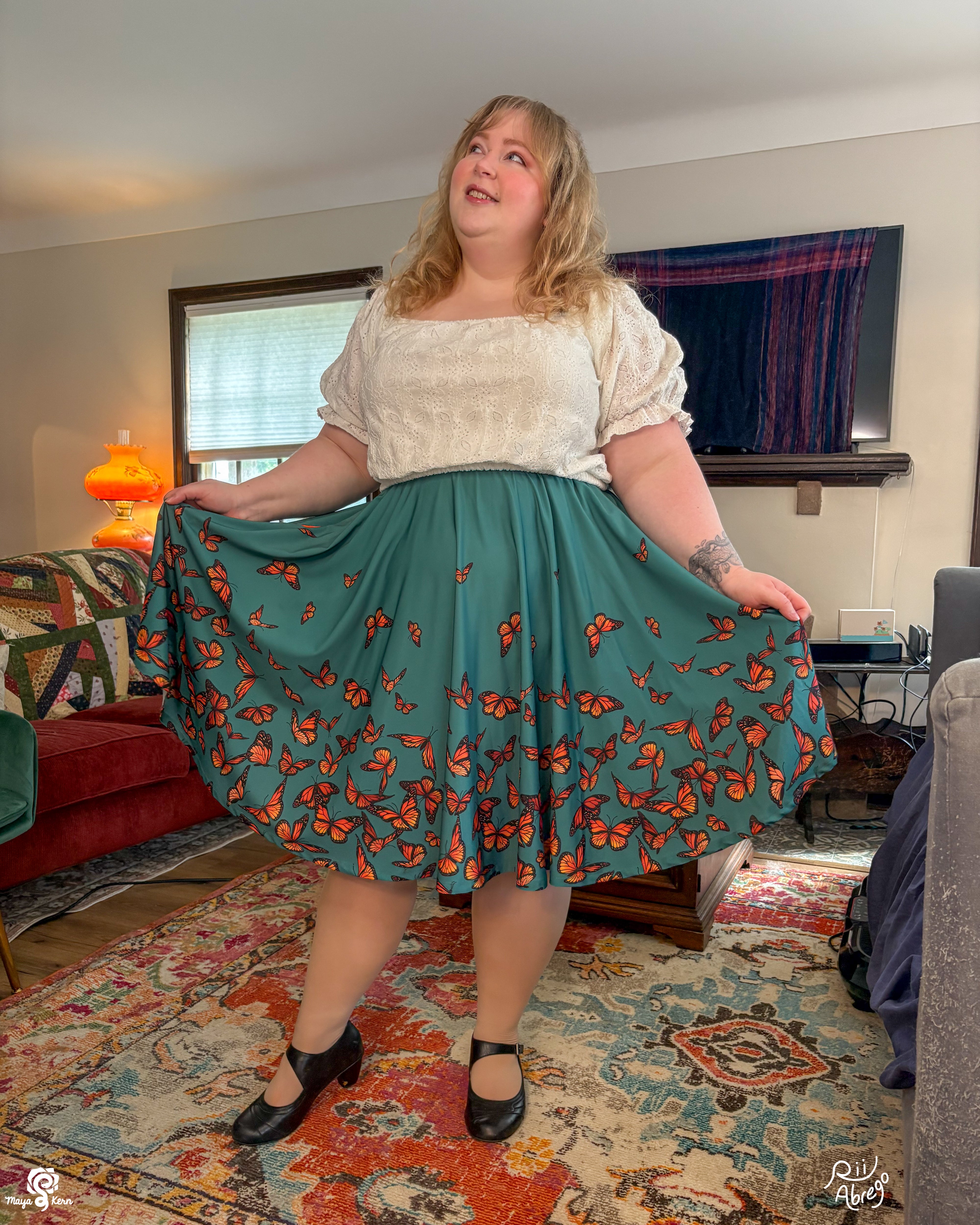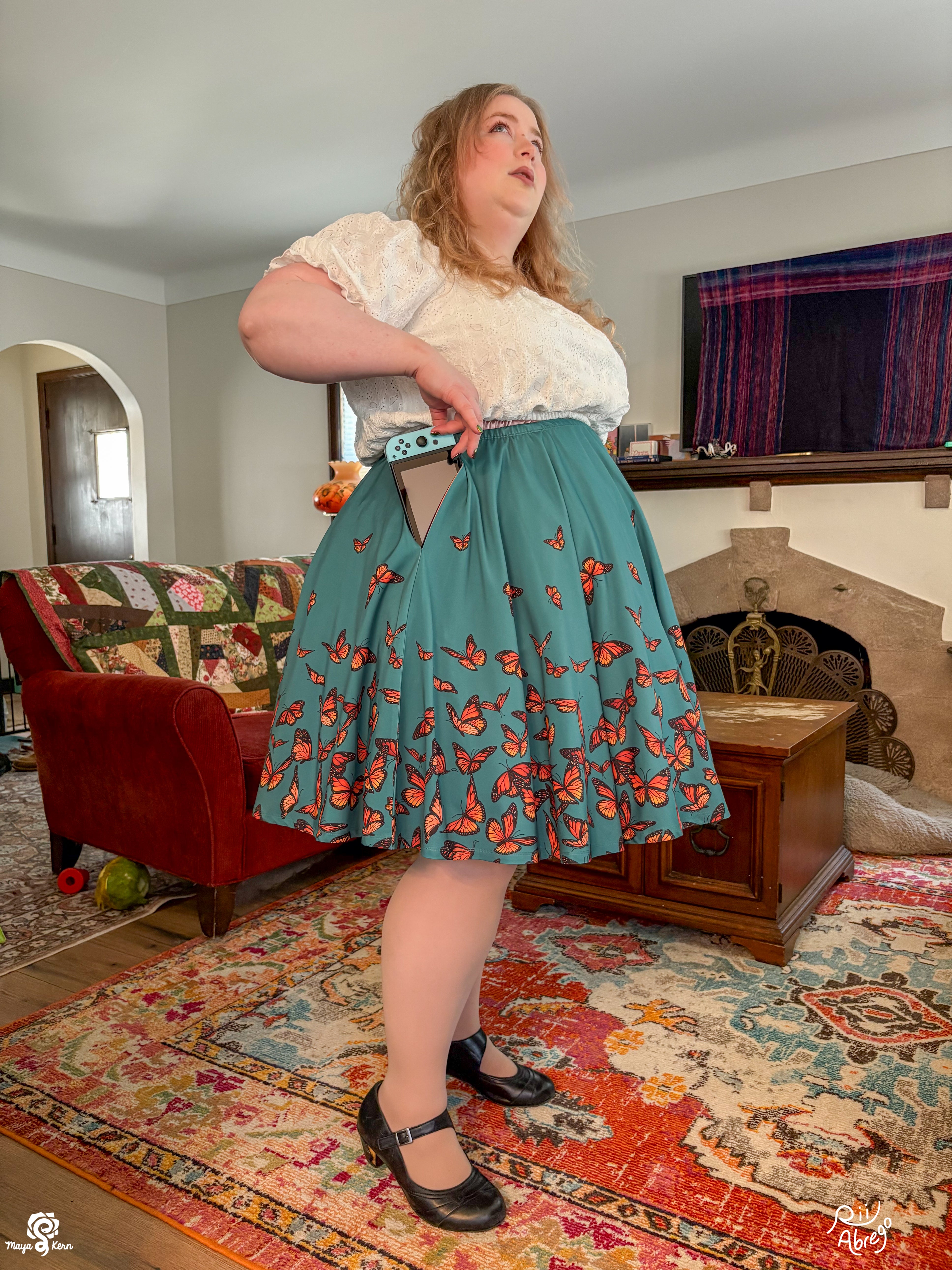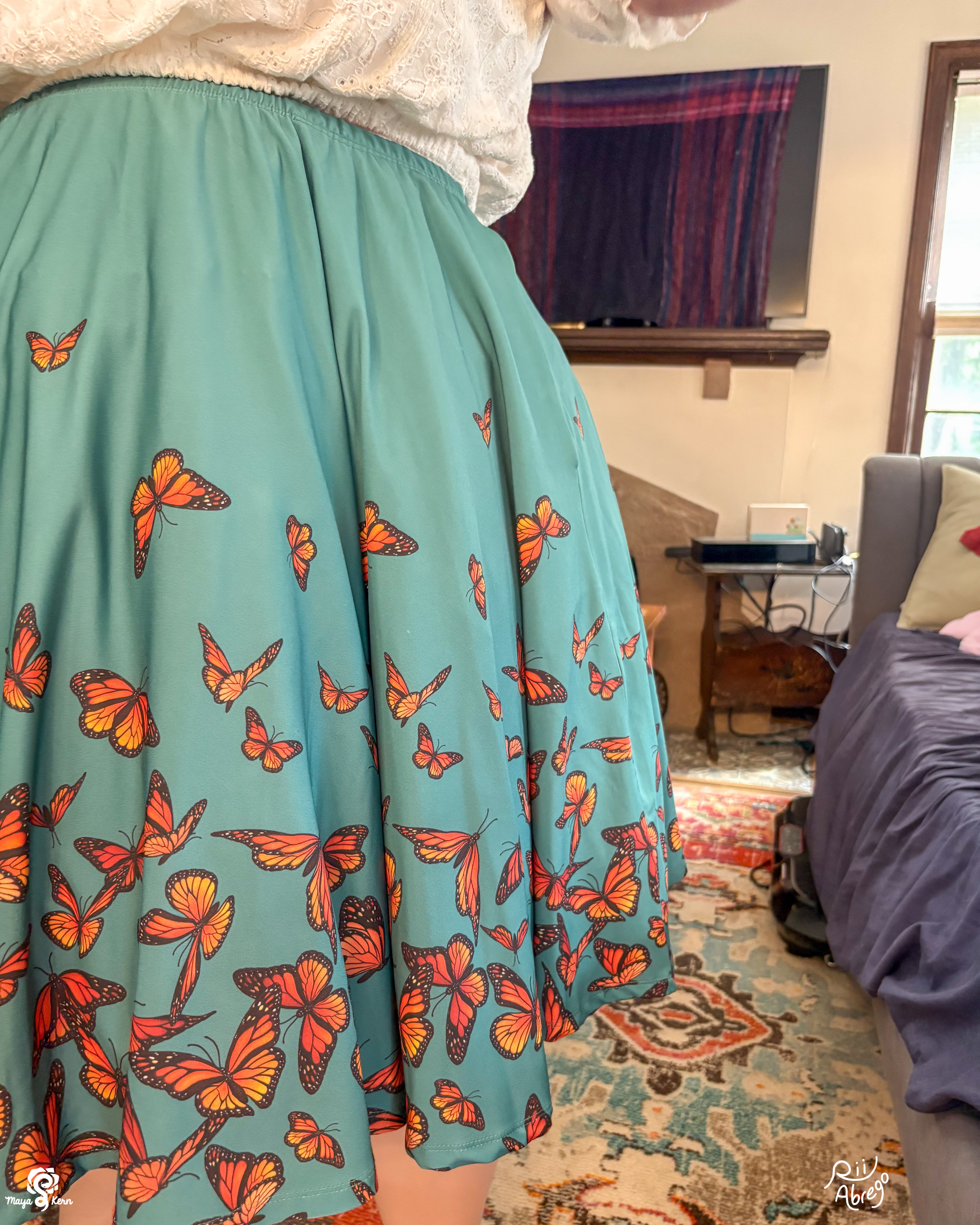 Stretchy circle skirt featuring Rii's Monarch Butterflies design on a lovely teal background. These skirts have pockets large enough to fit your phone, DS, Switch, hands, and maybe a small cat. Petticoat not included.