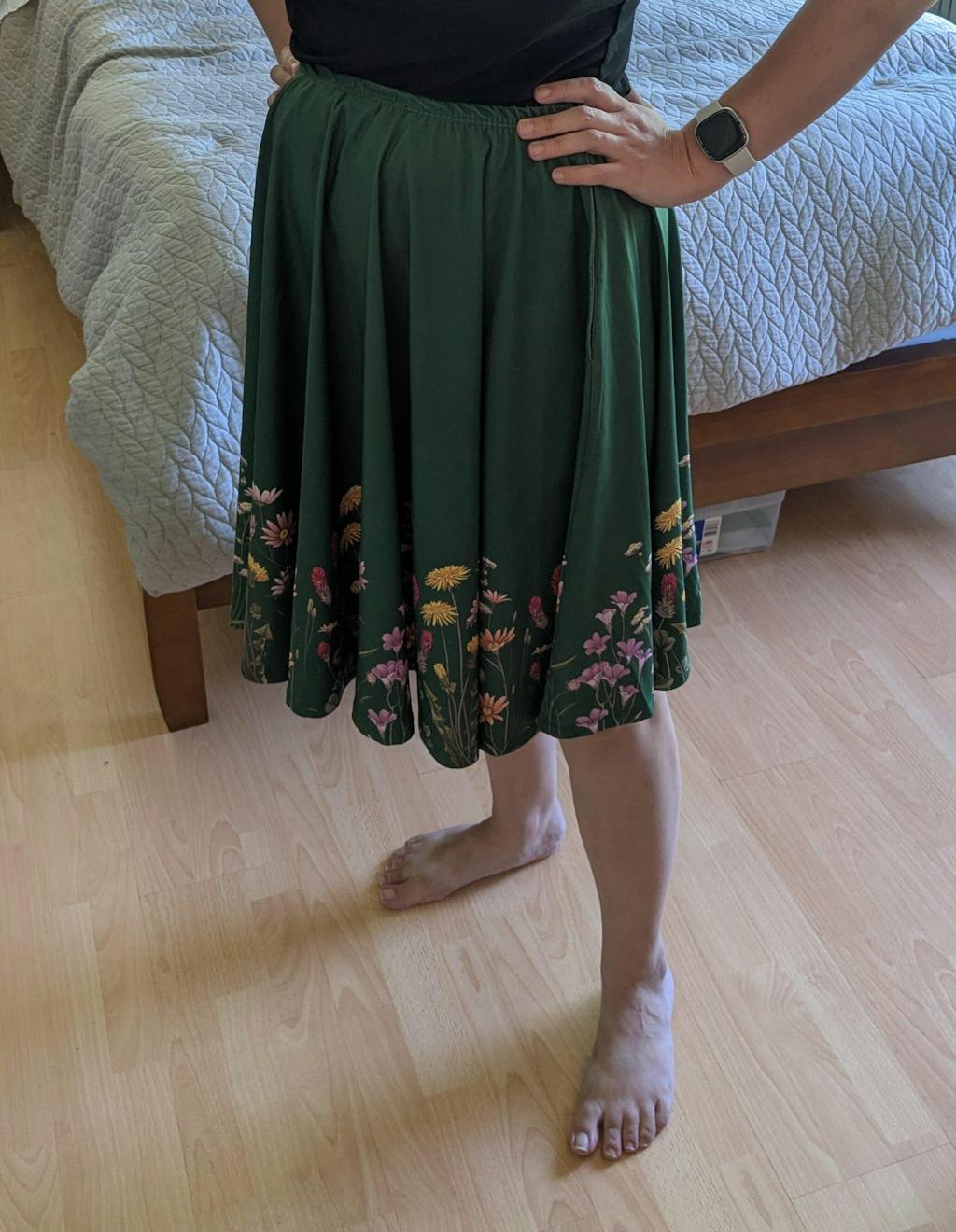 Stretchy circle skirt featuring Rii Abrego's Wildflower on a green background. These skirts have pockets large enough to fit your phone, DS, Switch, hands, and maybe a small cat. Petticoat not included.