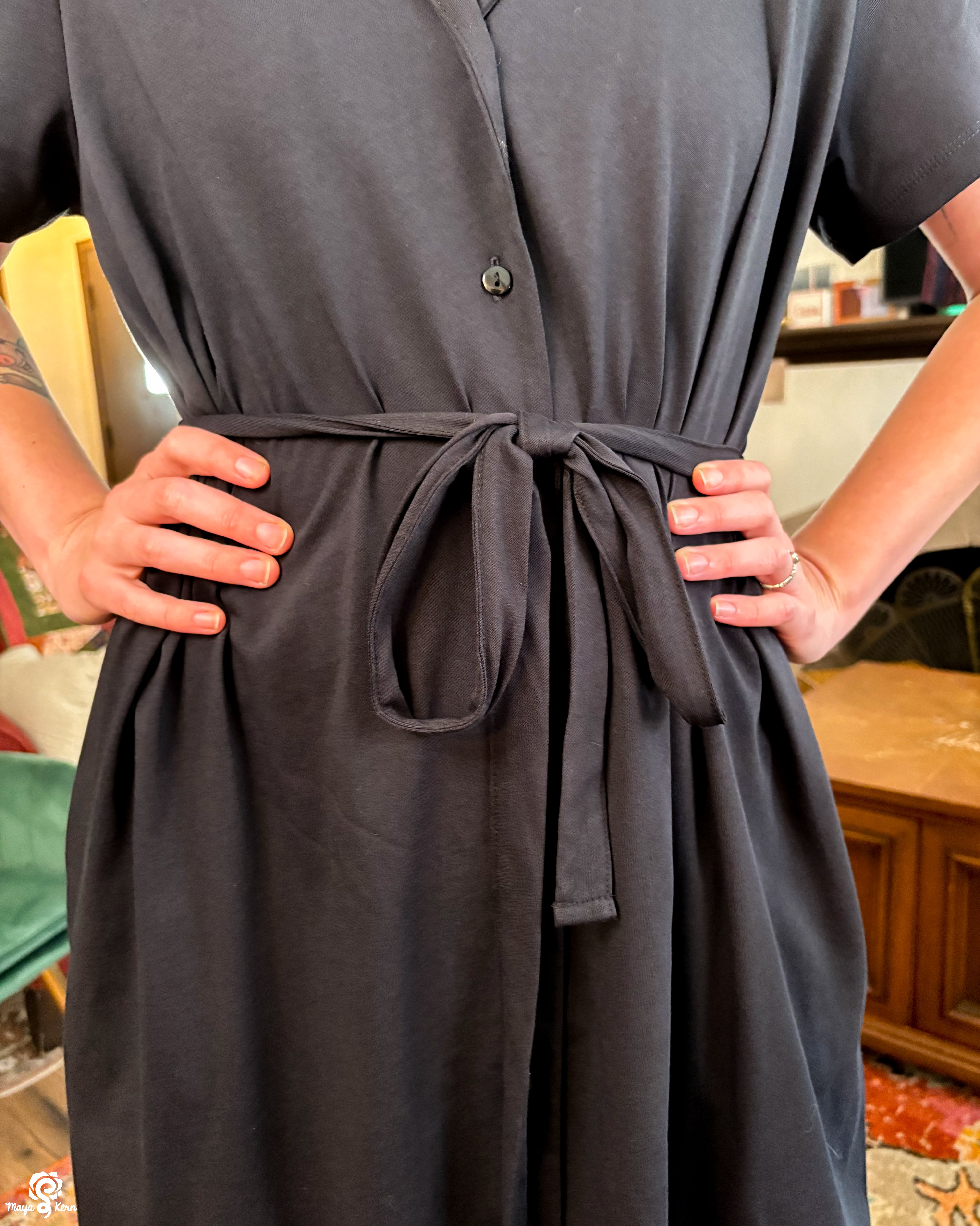 This fun and flirty joyfriend shirt style dress has a boxy, oversized silhouette that cinches at the waist with a waist tie. It features a soft collar, two pockets at the sides for all your knick knacks and doodads, as well as a longer back to keep your assets covered.