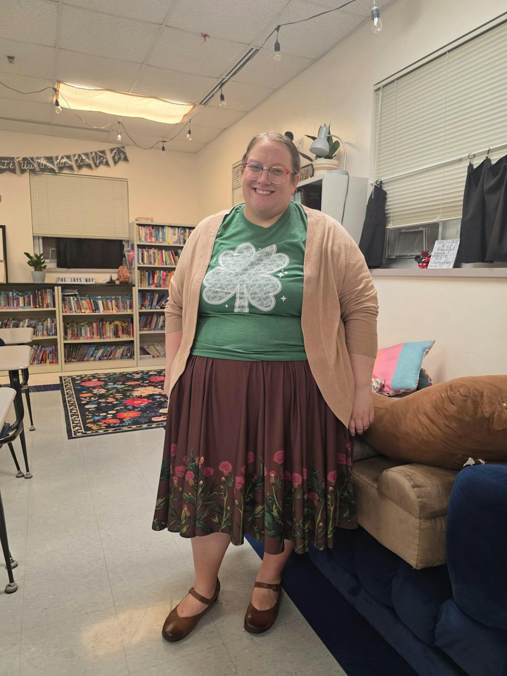 Stretchy circle skirt featuring my Thistles pattern on a molasses brown background. These skirts have pockets large enough to fit your phone, DS, Switch, hands, and maybe a small cat. Petticoat not included.